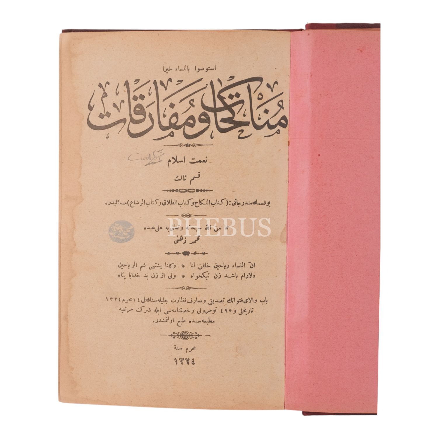 MÜNÂKEHÂT ve MUFÂRAKÂT (NİMETÜ´L-İSLÂM), 3. kısım, Mehmed Zihnî Efendi, 1324, Şirket-i Mürettibiye Matbaası, 294 sayfa, 13x20 cm...