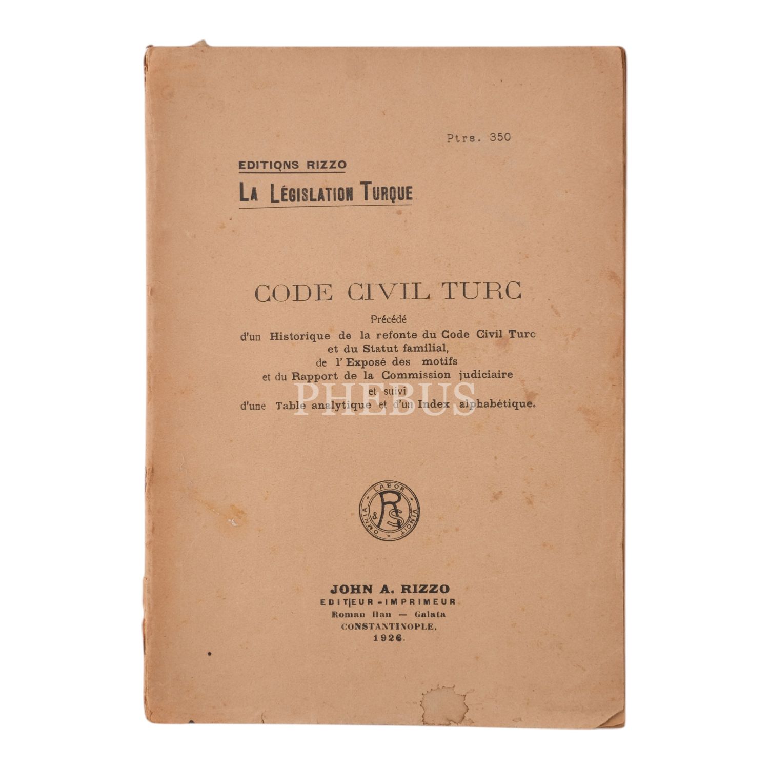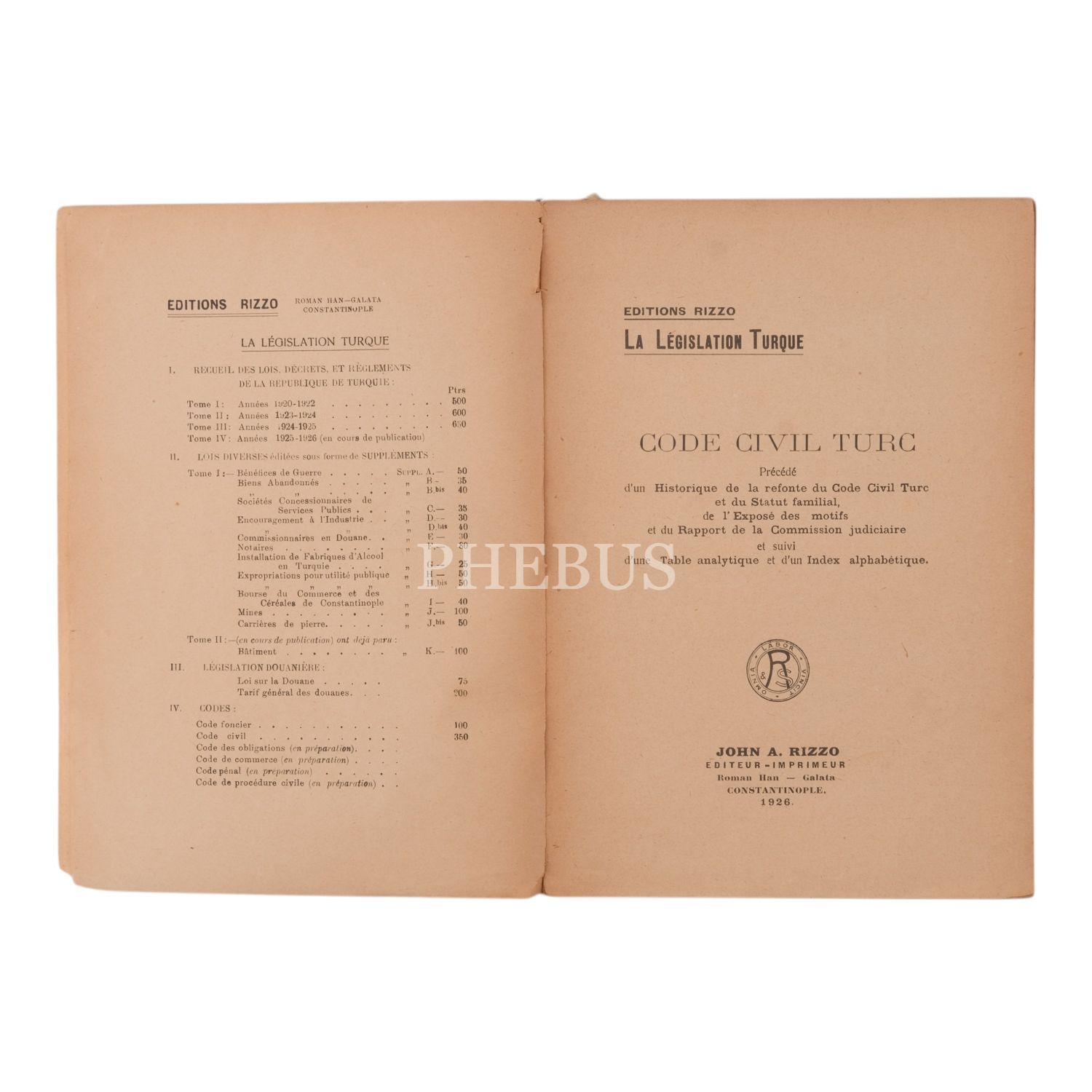 CODE CIVIL TURC, John A. Rizzo, 1926, Roman Hanı, Galata, 205 sayfa, 16x23 cm...