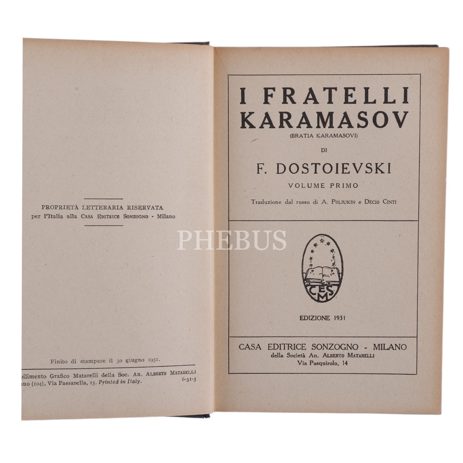 I FRATELLI KARAMASOV, Fyodor Dostoyevski, 1931, Casa Editrice Sonzogno (Milano), 251 sayfa, 12x18 cm...