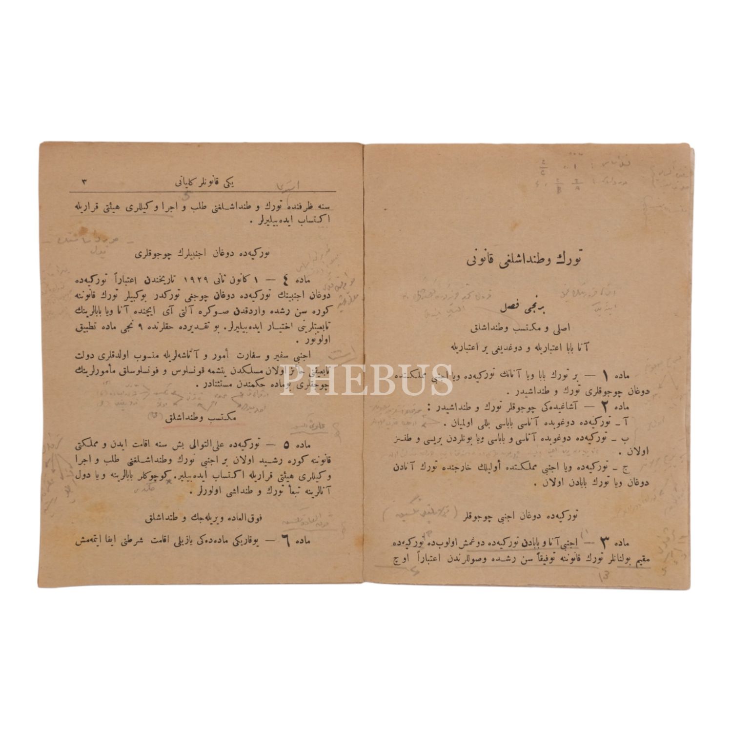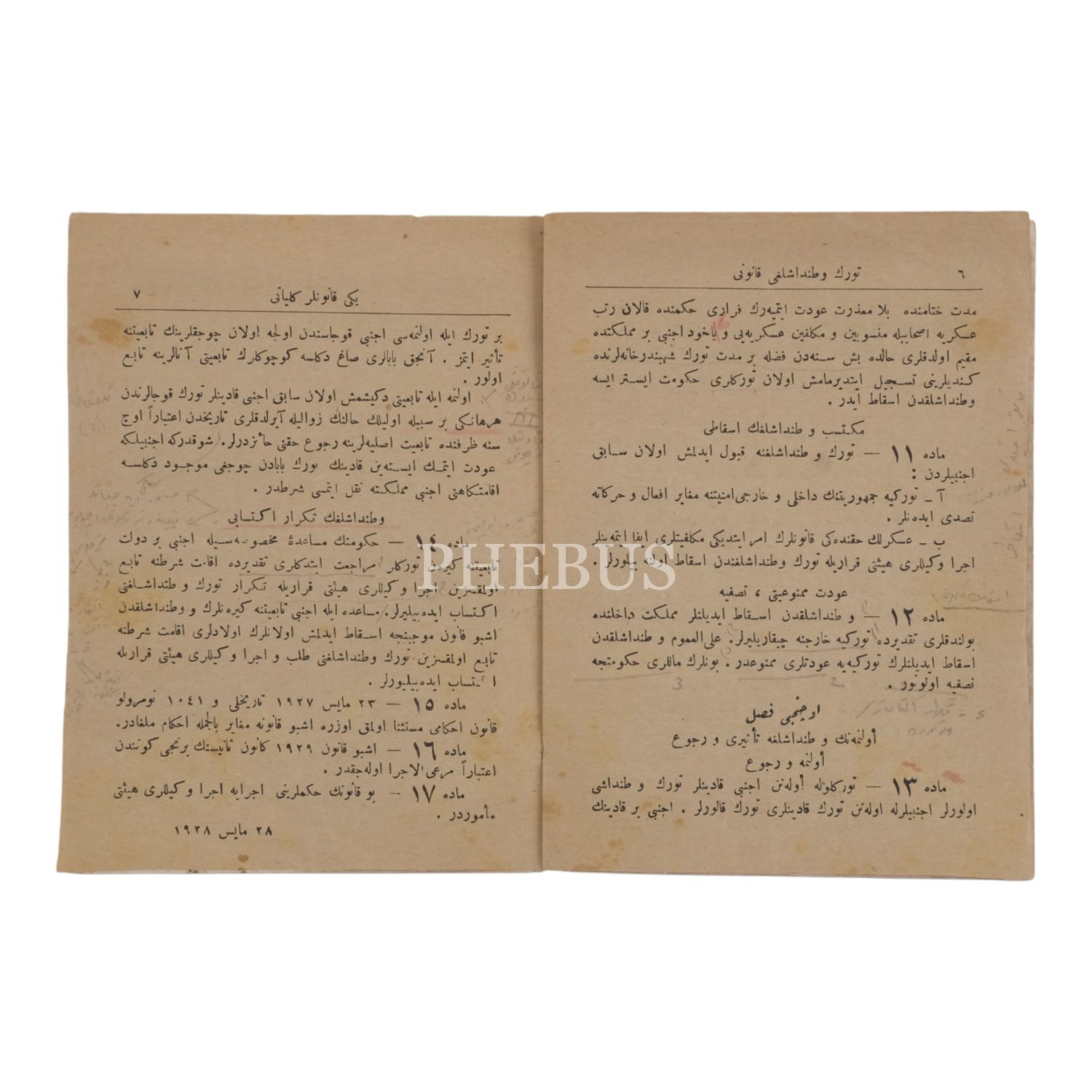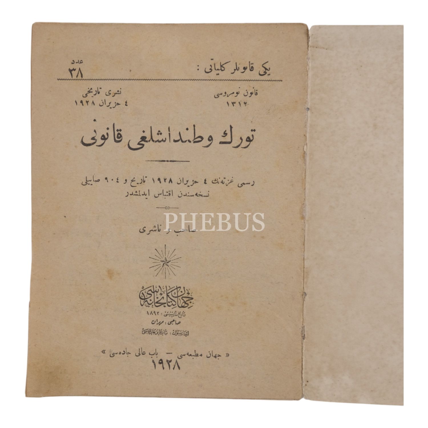 TÜRK VATANDAŞLIĞI KANUNU, 1928, Cihan Matbaası, 7 sayfa, 11x15 cm...
