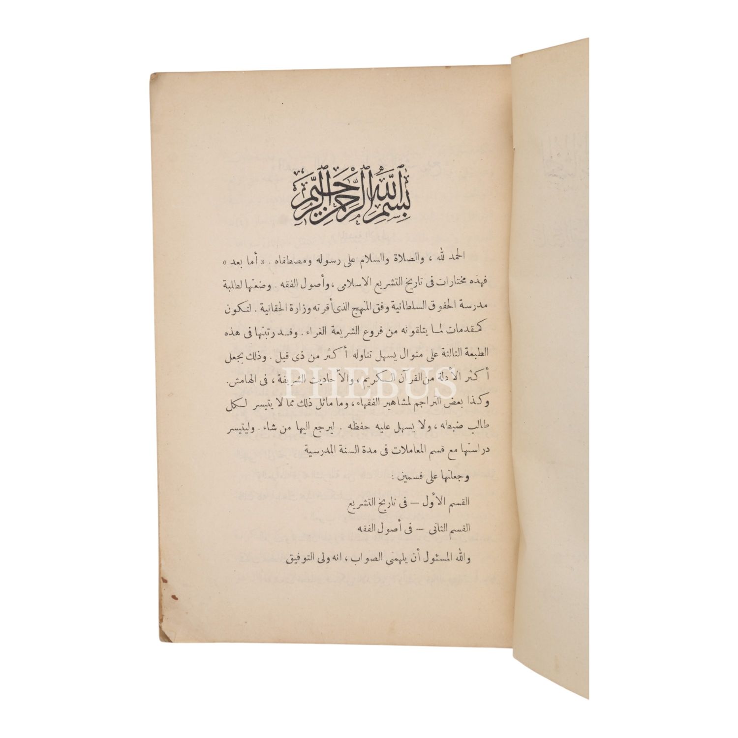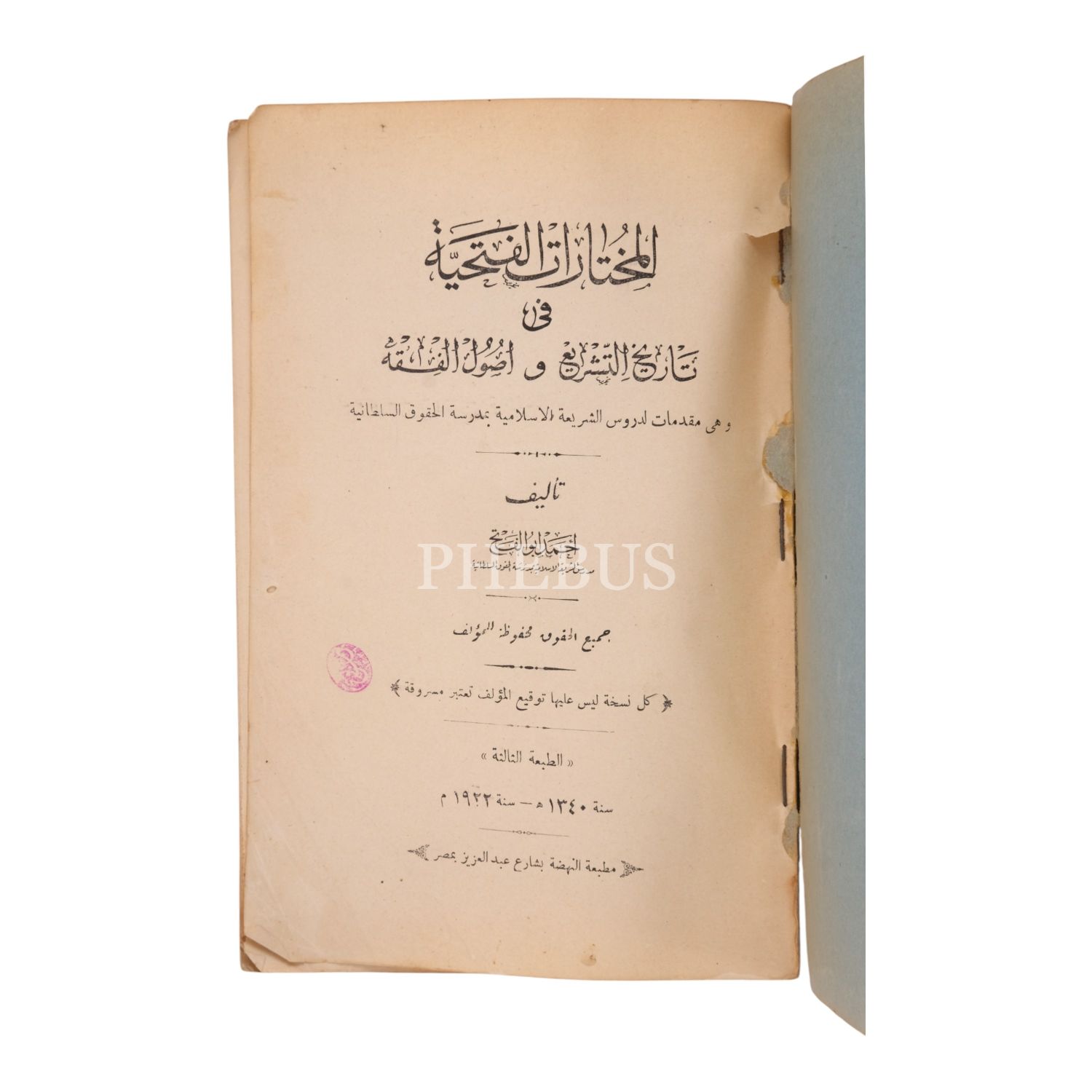 EL-MUHTÂRÂTÜ´L-FETHİYE fî TÂRÎHİ´T-TEŞRδ ve USÛLİ´L-FIKH, Ahmed Ebülfeth, 1922, Matbaatü´n-Nahda, Mısır, 206 sayfa, 16x25 cm...