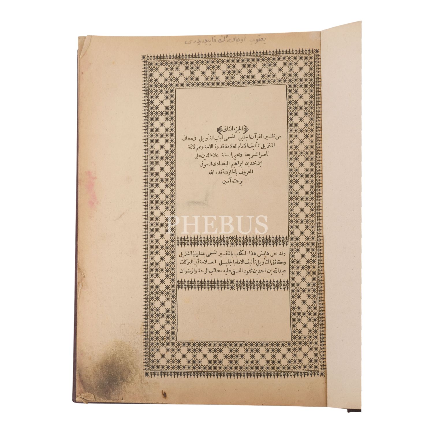 LÜBÂBÜ´T-TE´VÎL FÎ MAÂNİ´T-TENZÎL, 2. cilt, Hâzin İmam Ali b. Muhammed, derkenar olarak MEDÂRİKÜ´T-TENZÎL VE HAKÂİKÜ´T-TE´VÎL, Ebu´l-Berekât Abdullah en-Nesefî, 356 sayfa, 20x26 cm...