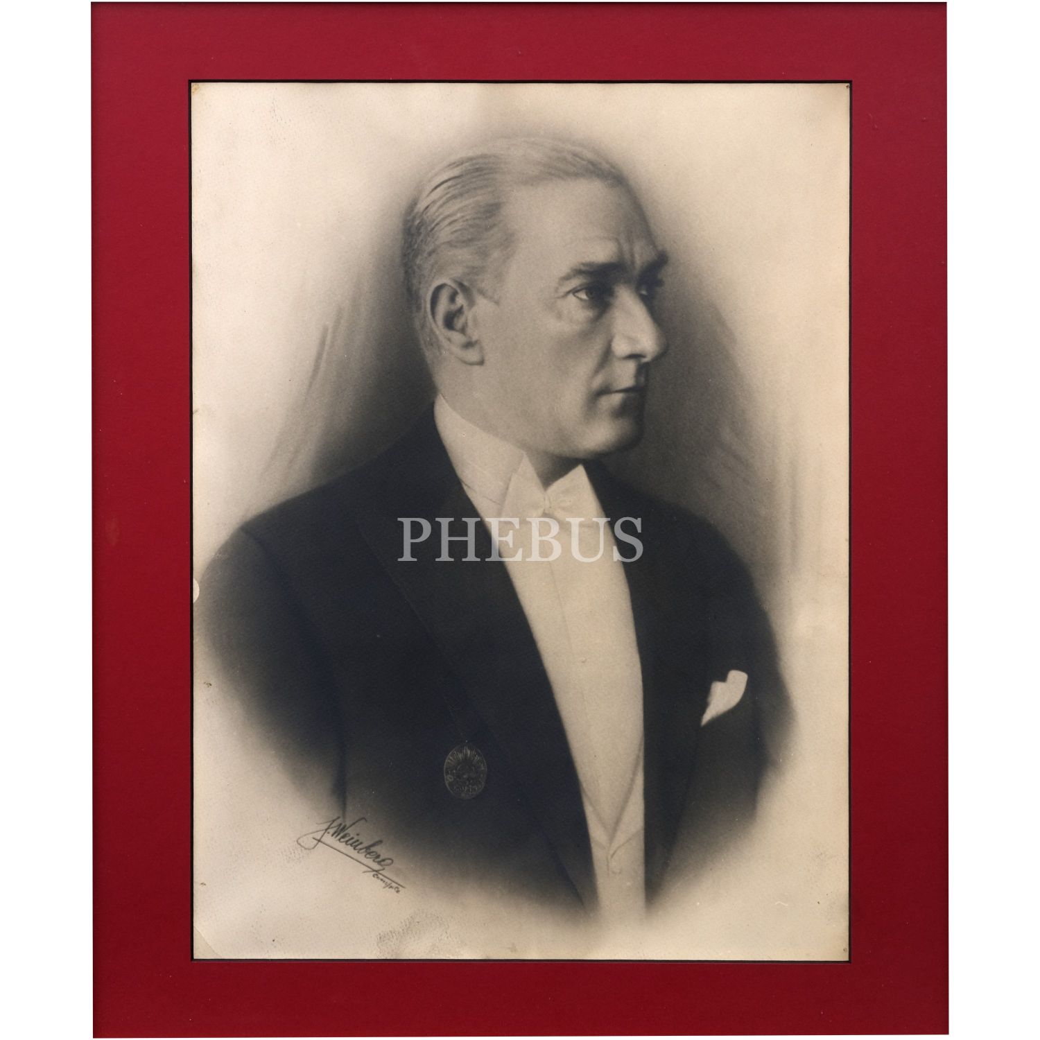 Mustafa Kemal Atatürk´ün İstiklâl Madalyası ile görüldüğü, "J. (Jean) Weinberg - Cons/ple (Constantinople)" ıslak imzalı, büyük boy portre fotoğrafı, fotoğraf 29x39 cm, çerçeve 55x62,5 cm...