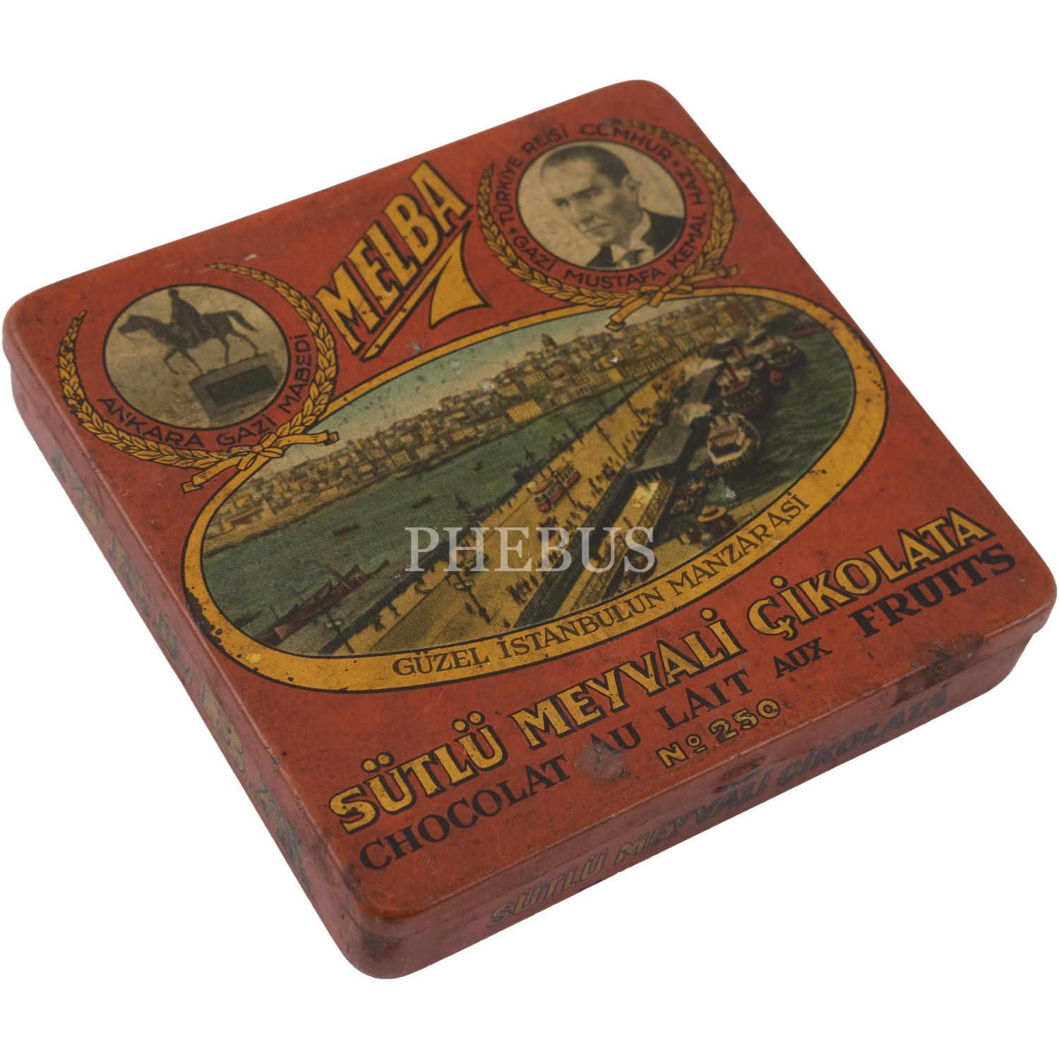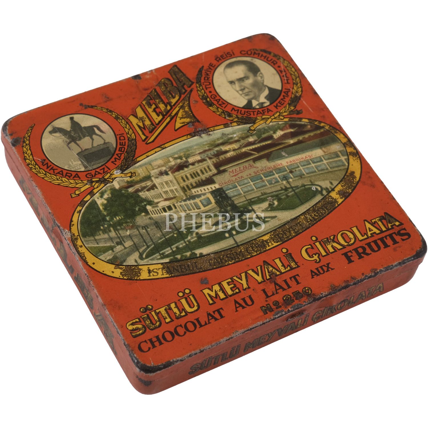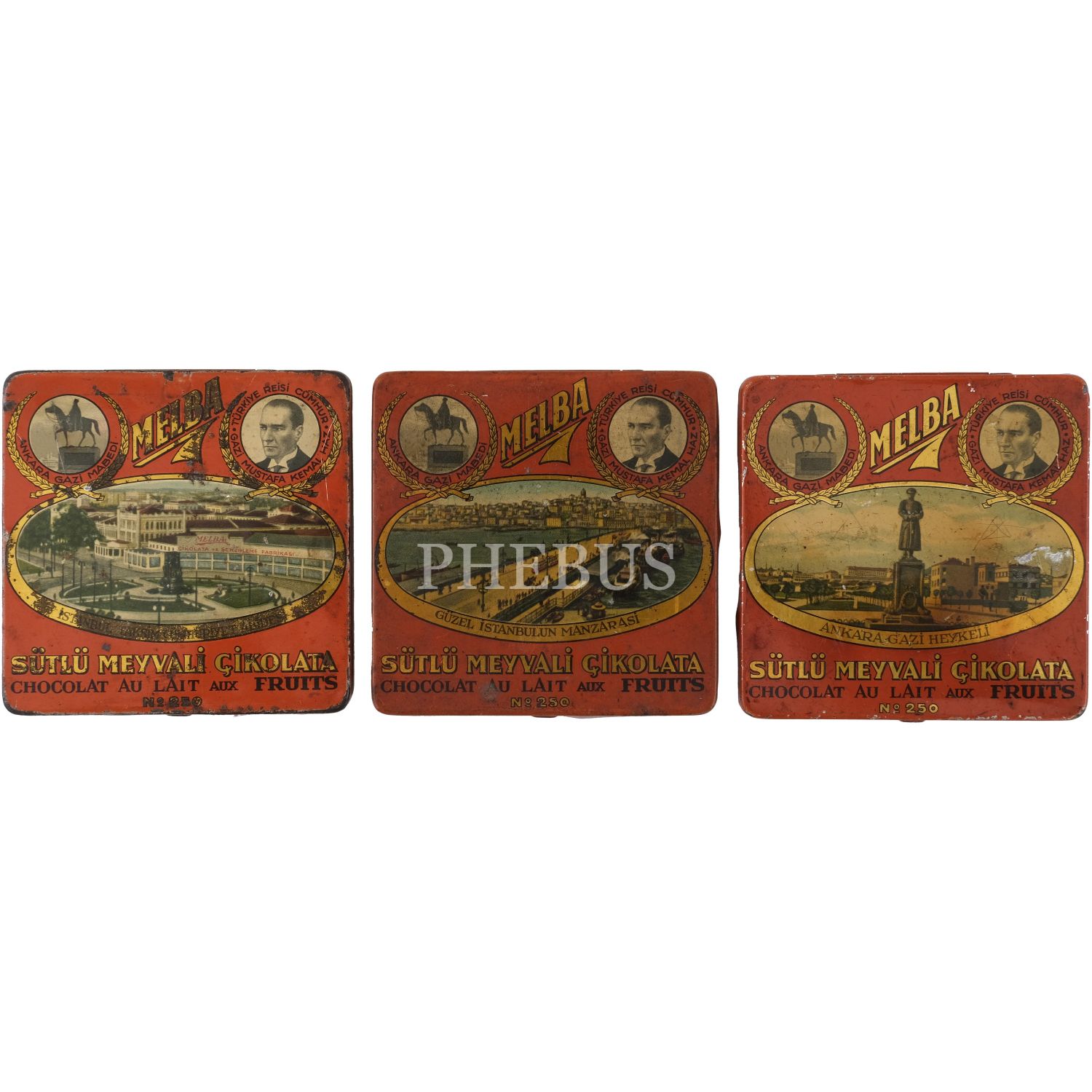 Melba Çikolata ve Şekerleme Fabrikası'nın, Mustafa Kemal Atatürk ve şehir manzaraları görselli çikolata kutusu serisinden, üç adet turuncu renkli "Sütlü Meyvali Çikolata" kutusu (No. 250), 9,5x9,5 cm...