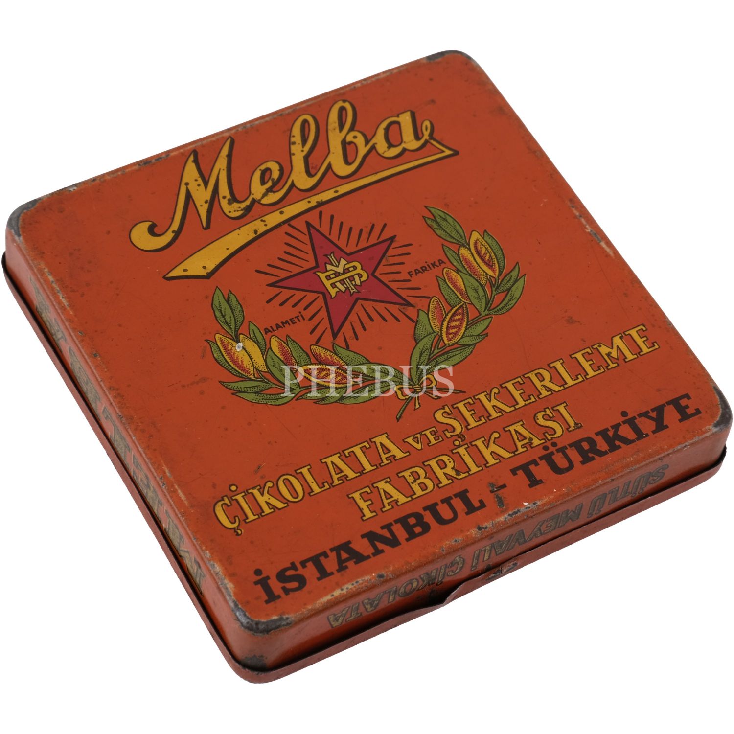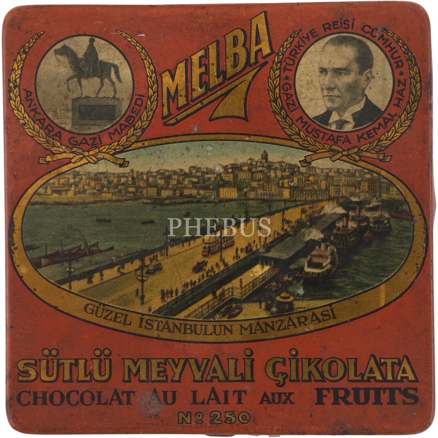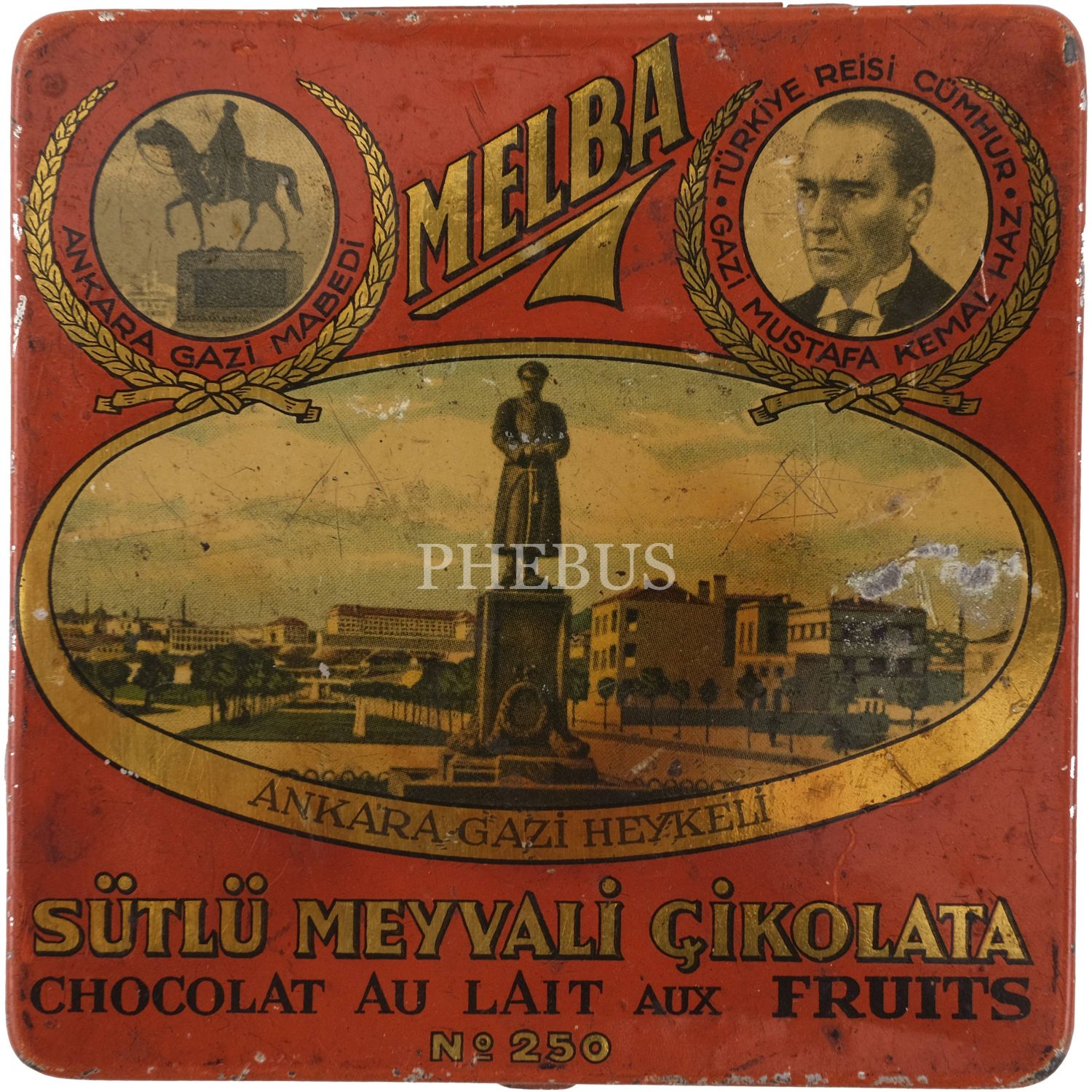 Melba Çikolata ve Şekerleme Fabrikası'nın, Mustafa Kemal Atatürk ve şehir manzaraları görselli çikolata kutusu serisinden, üç adet turuncu renkli "Sütlü Meyvali Çikolata" kutusu (No. 250), 9,5x9,5 cm...