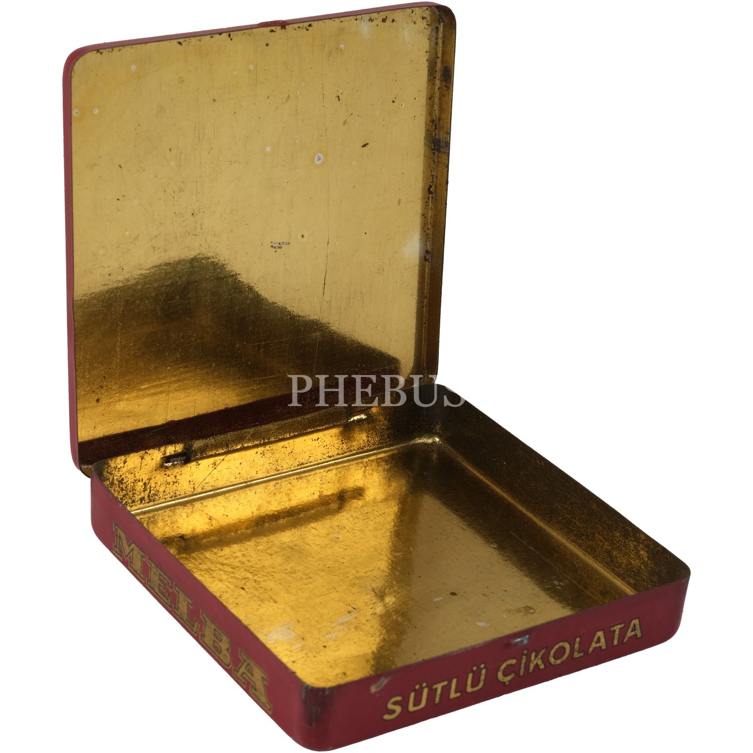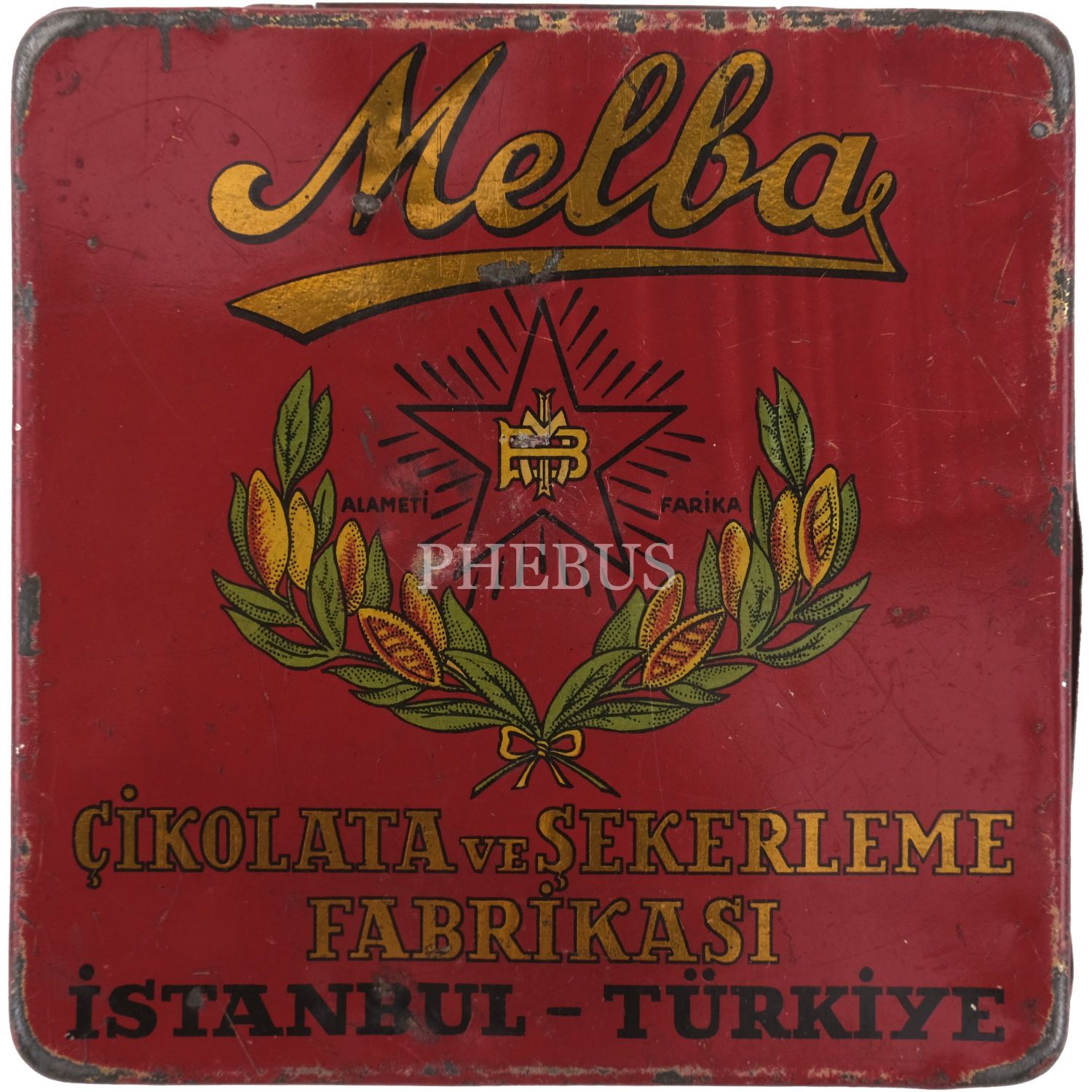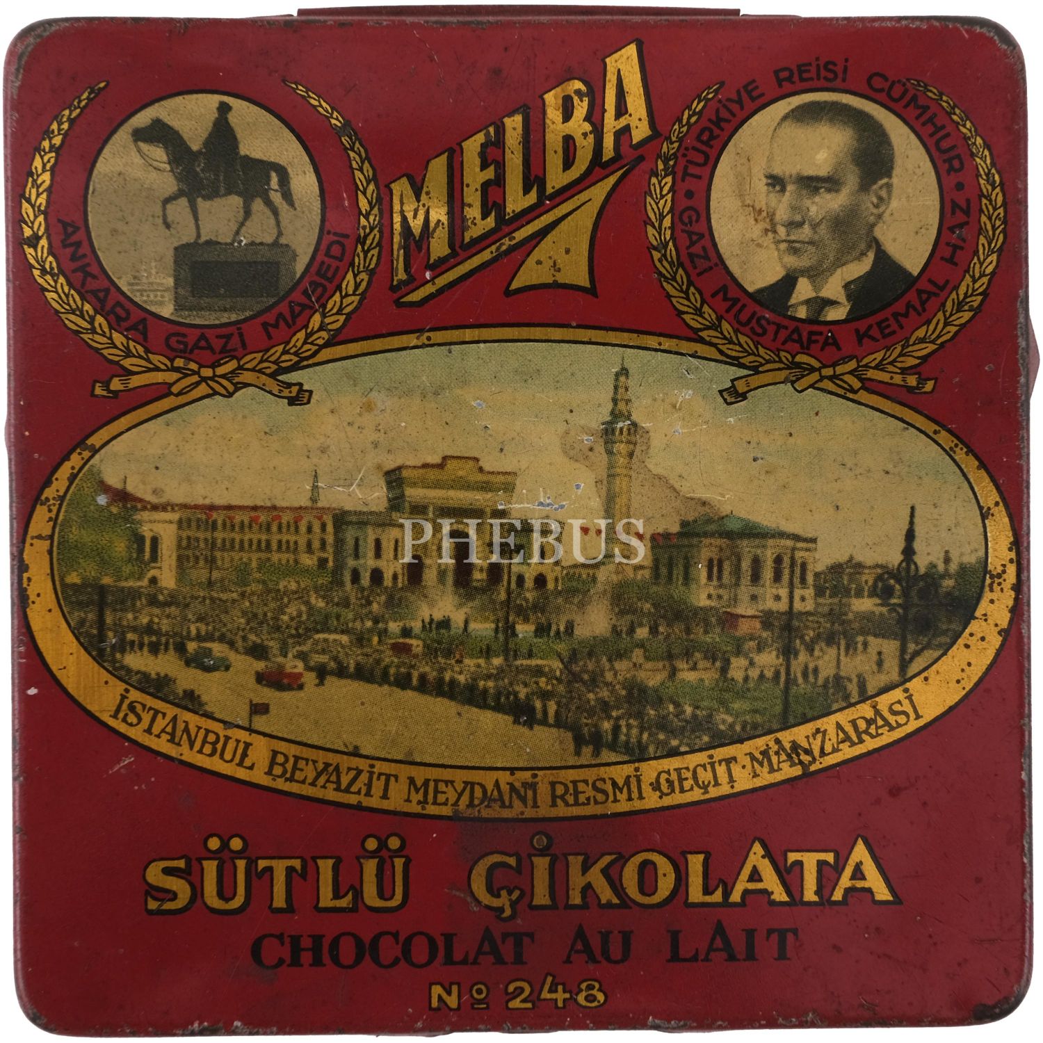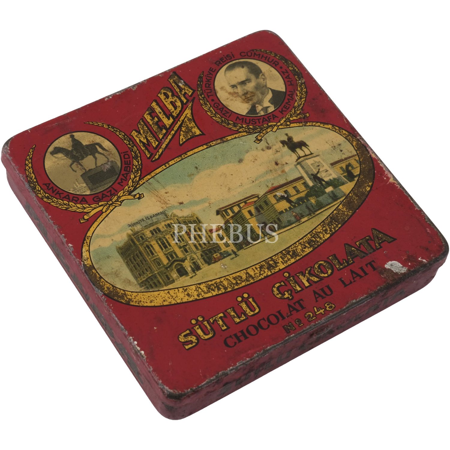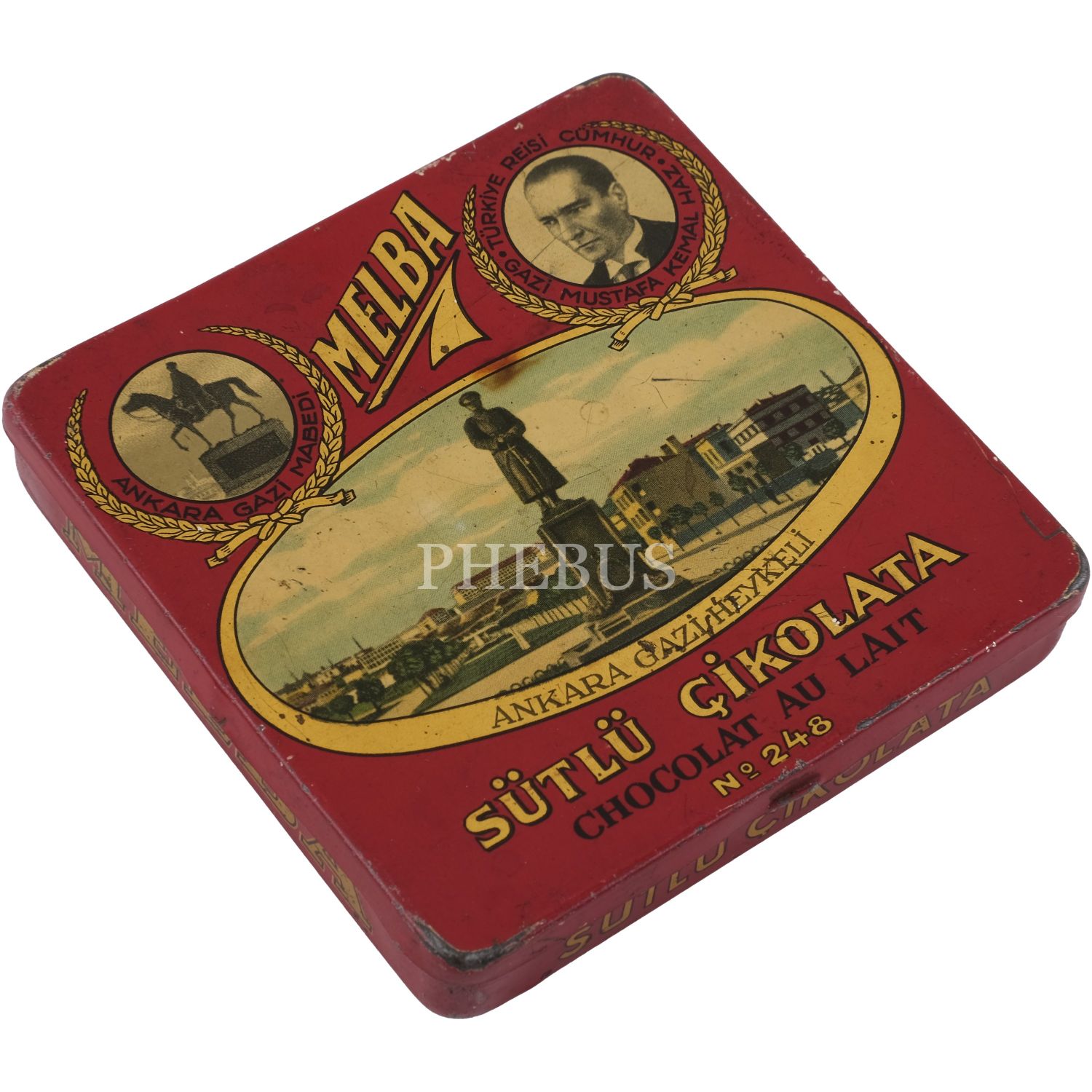 Melba Çikolata ve Şekerleme Fabrikası'nın, Mustafa Kemal Atatürk ve şehir manzaraları görselli çikolata kutusu serisinden, beş adet kırmızı renkli "Sütlü Çikolata" kutusu (No. 248), 9,5x9,5 cm...