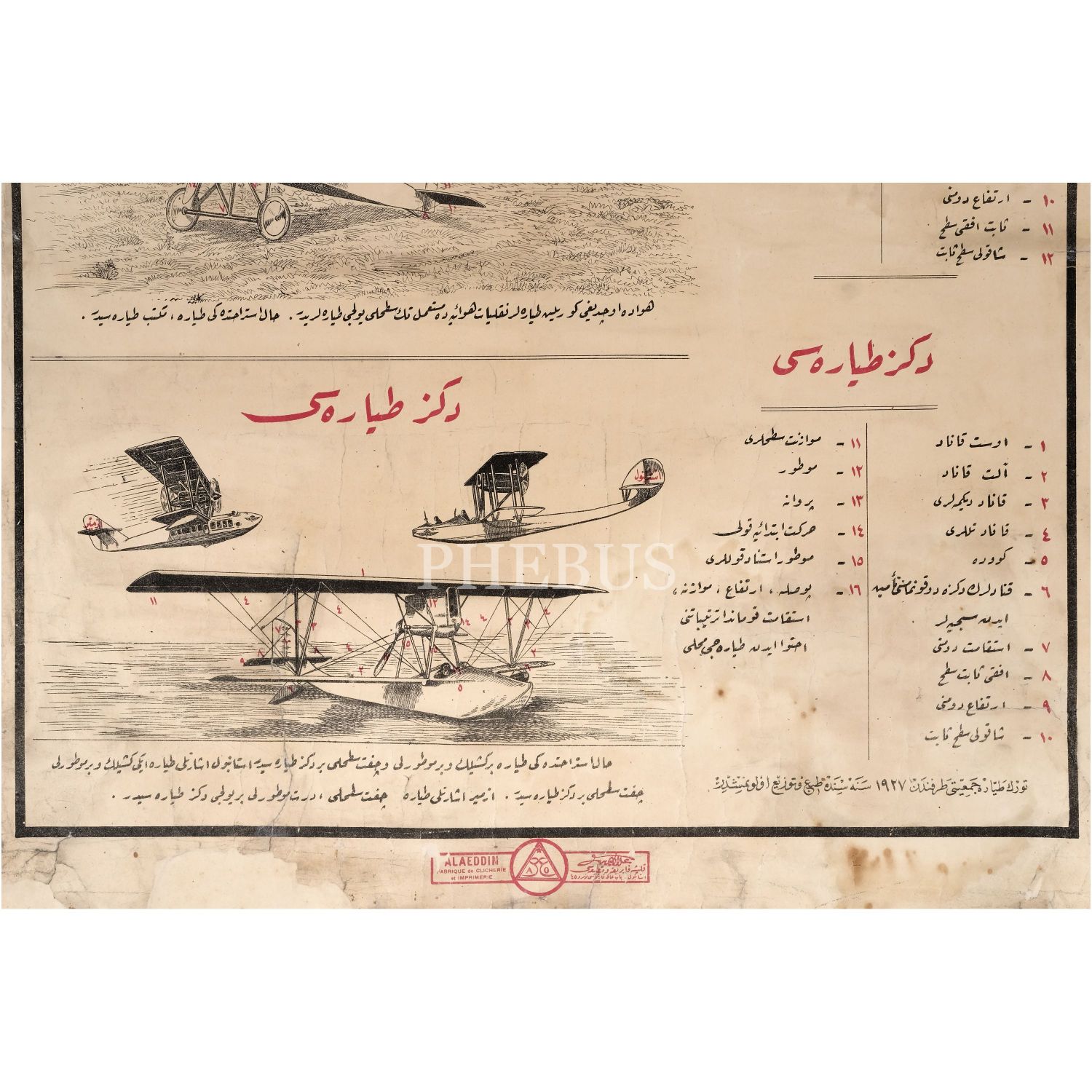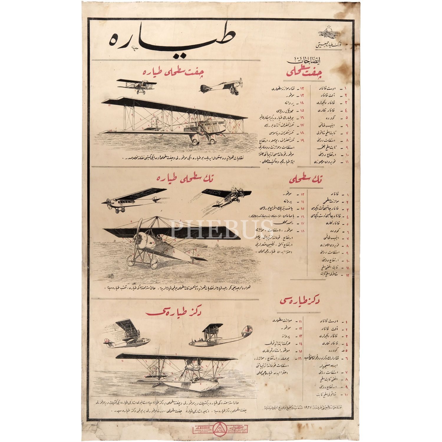 Türk Tayyare Cemiyeti tarafından üretilen çift satıhlı tayyarelerin ve deniz tayyarelerinin tanıtıldığı afiş, 94x60 cm...