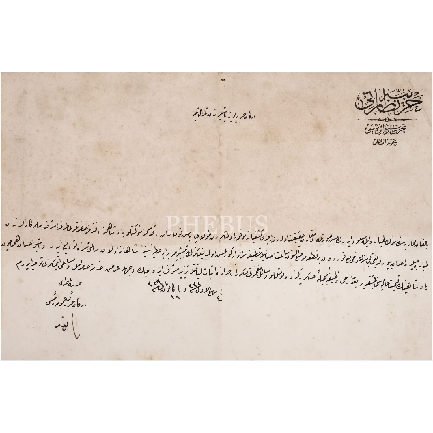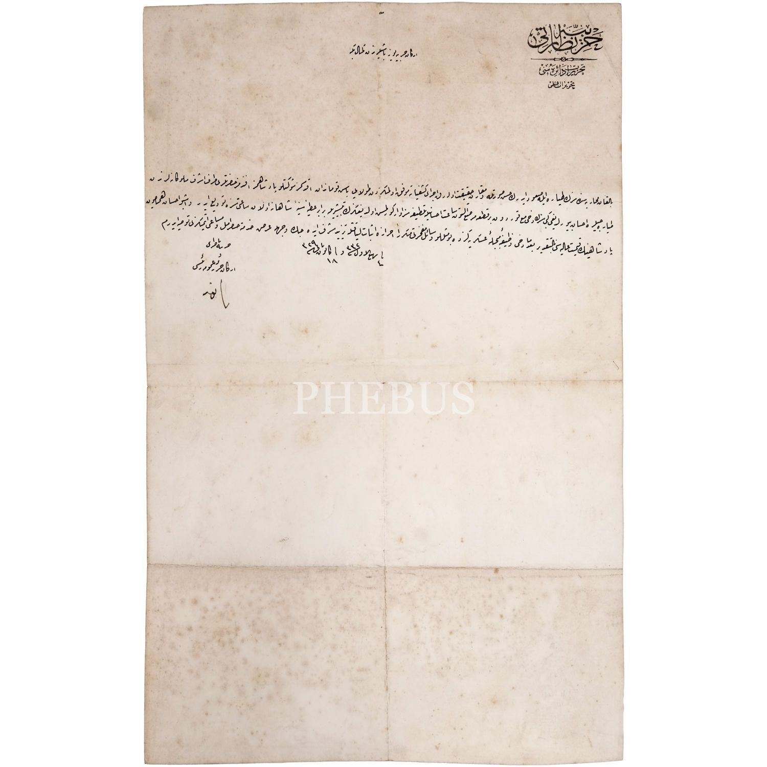 Türk havacılık tarihinin en önemli figürlerinden biri olan Yüzbaşı Kemal Bey’in, Balkan Harbi´nde gerçekleştirdiği keşif uçuşlarında sağladığı yararlılıklardan dolayı, Padişah tarafından ihsan edilen, elmasla süslenmiş altın kordonlu saati kendisine takdim eden Başkumandan Vekili Enver Paşa´nın imzaladığı takdir beratı, 1329, 22x34 cm...