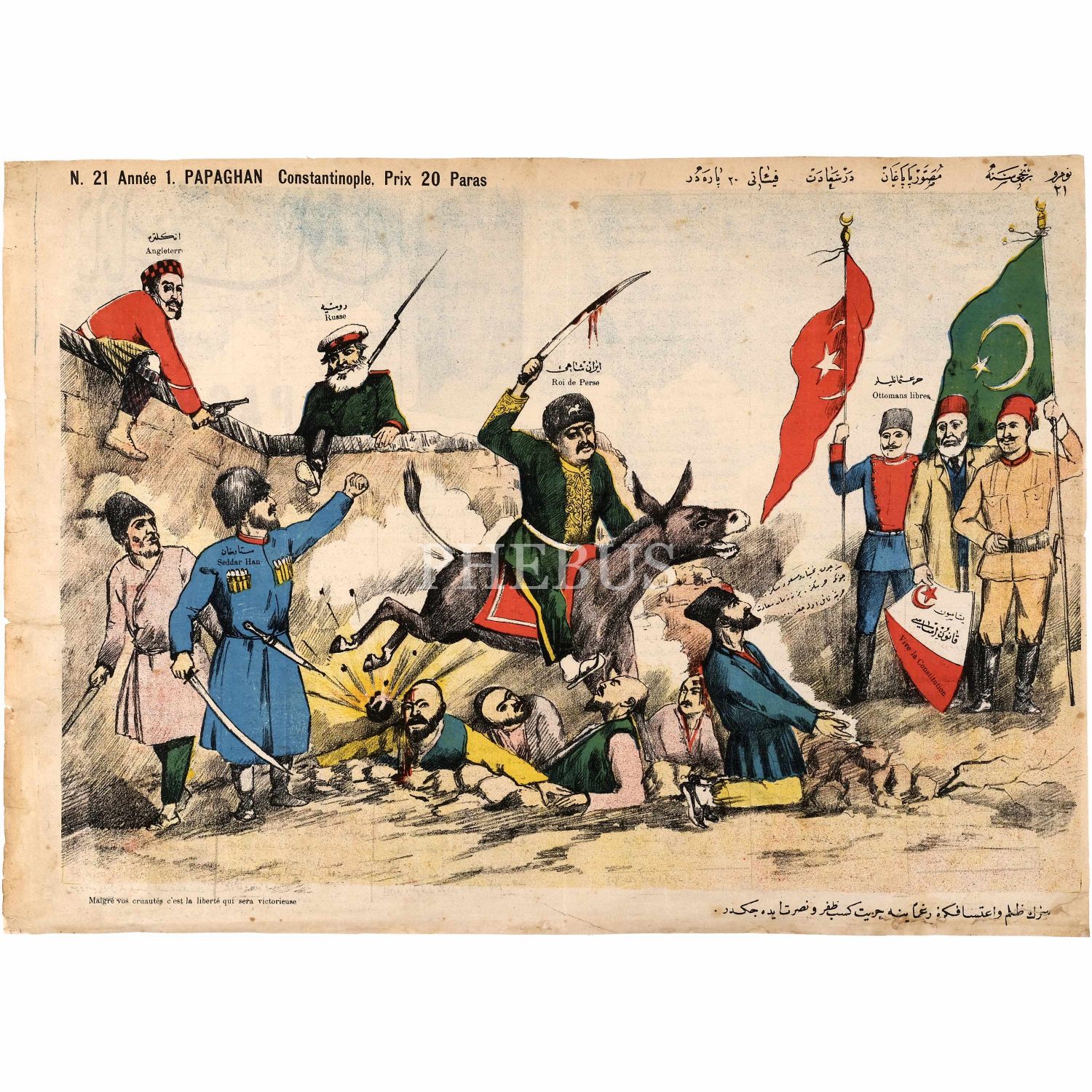 İran'da gerçekleşen Meşrutiyet hareketinde Settar Han'a destek çıkan Osmanlı Ordusu ve İran Şahı'na destek çıkan Rus ve İngiliz kuvvetlerinin resmedildiği, Musavver Papağan dergisinin 21. sayısında yayımlanan afiş, 54x39 cm...