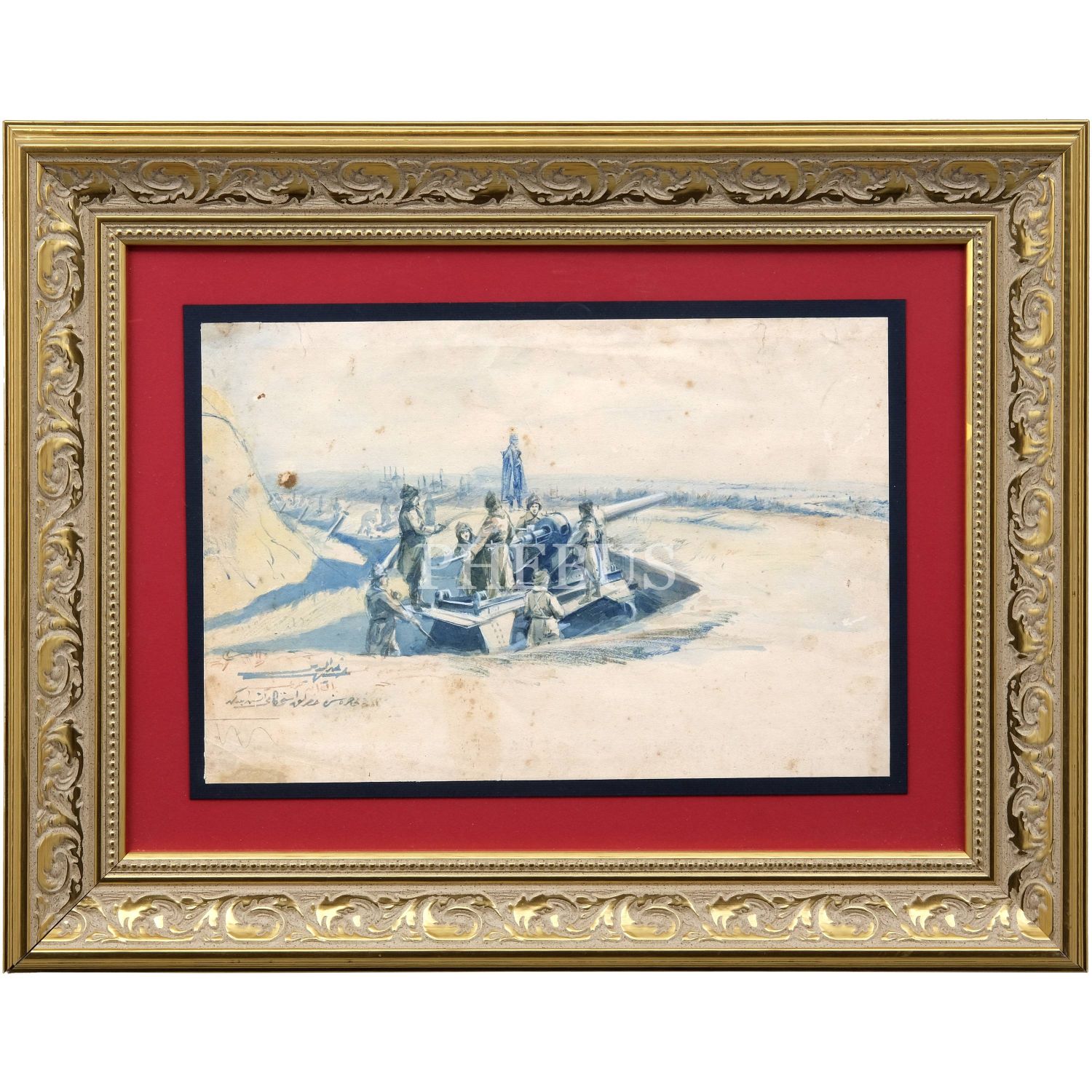 Hasan Hayreddin (Çizel) imzalı, Balkan Harbi´nde Hazırlık İstihkam Alayı´nın top başında resmedildiği orijinal çizim, 39x26 cm...