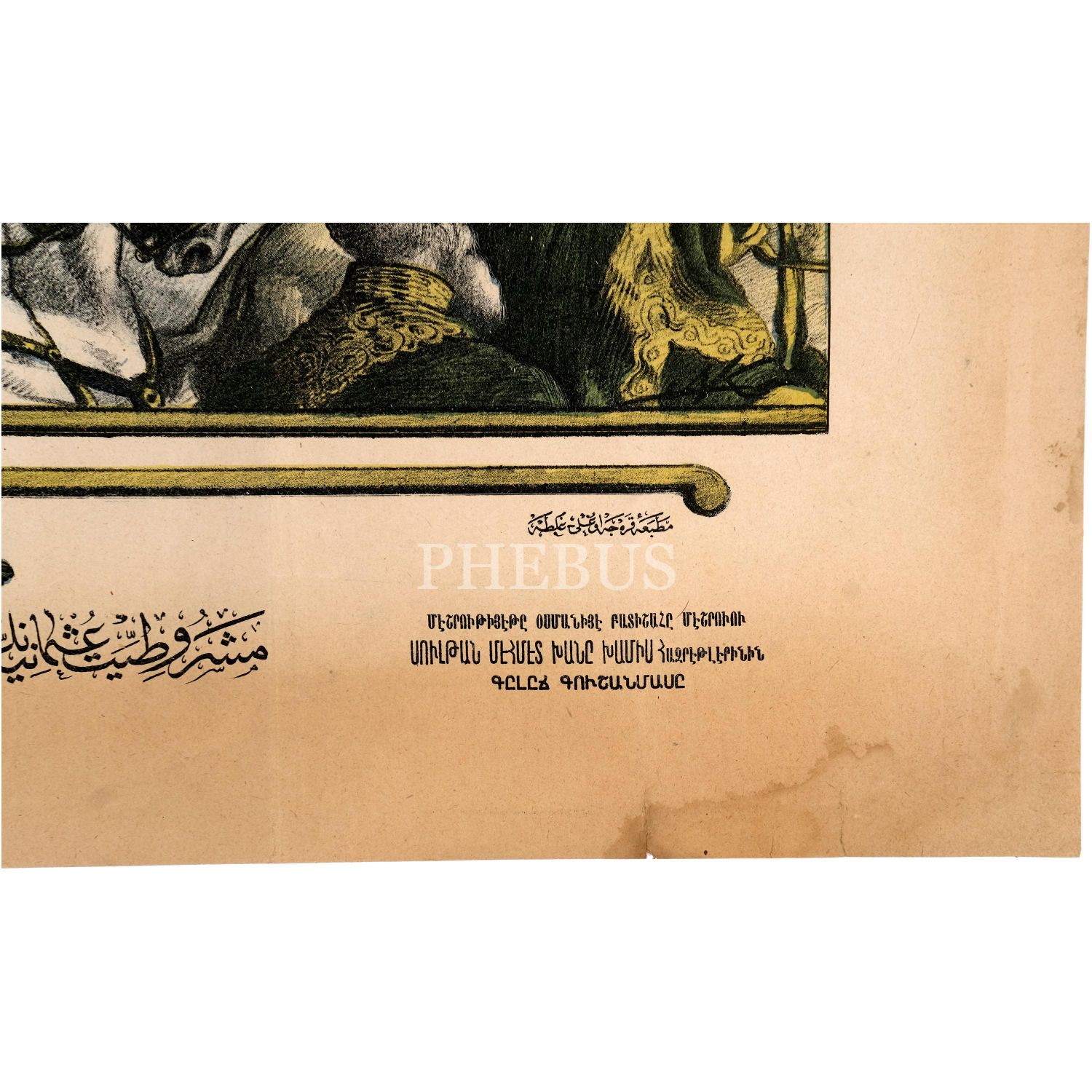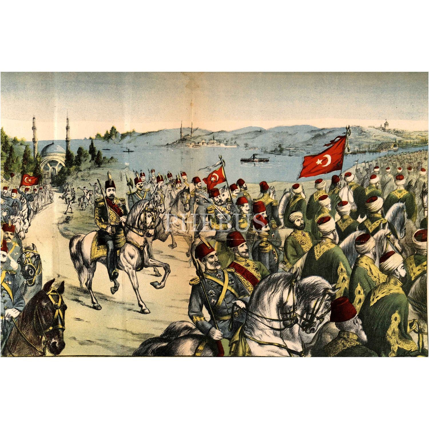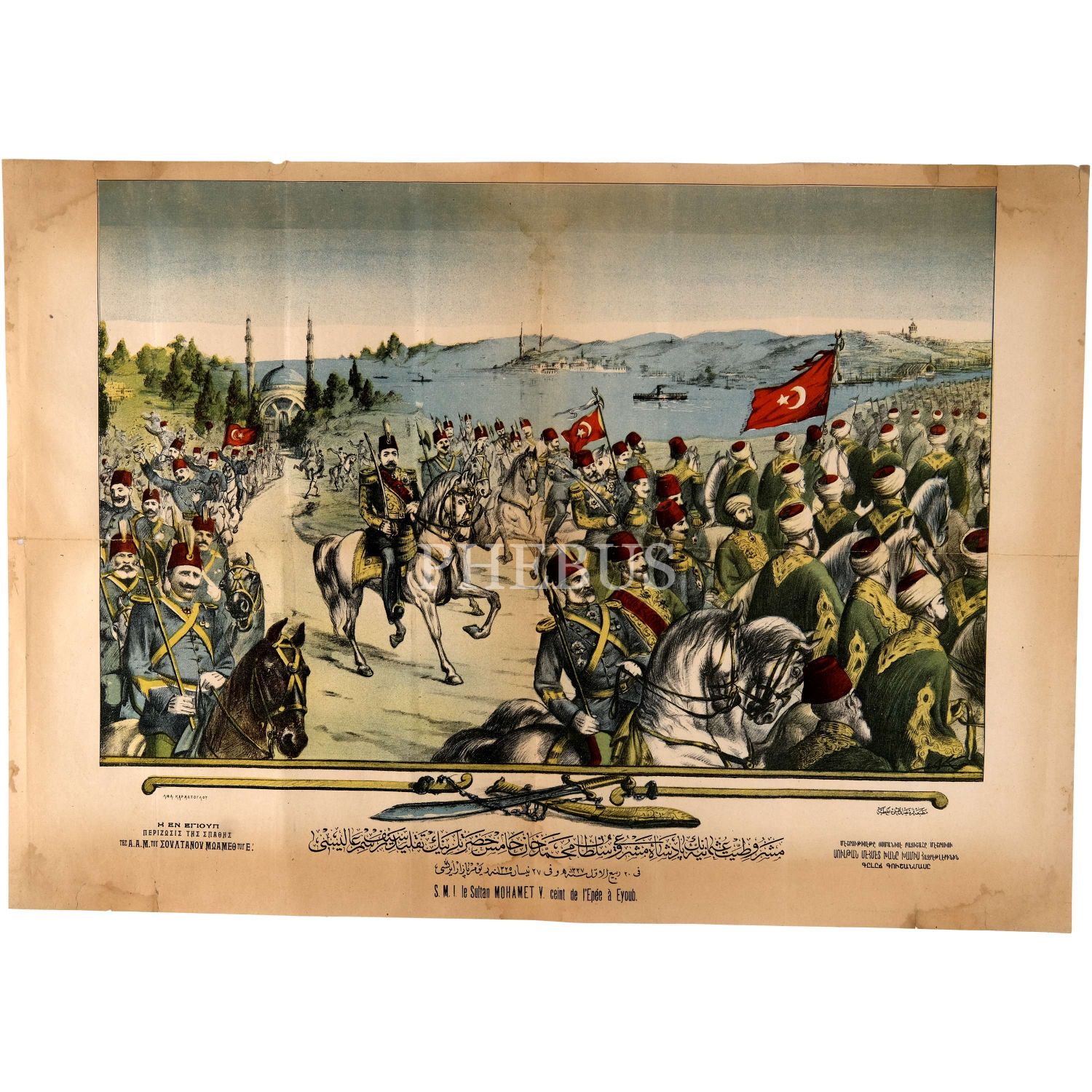 Sultan Mehmed Reşad’ın, Eyüp Camii’nde Hz. Ömer’in kılıcını kuşandıktan sonra Kılıç Alayı’nda at üzerinde, merasim alayıyla birlikte tasvir edildiği; Osmanlıca, Ermeni harfli Türkçe, Rumca ve Fransızca olmak üzere dört dilde yazılı taş baskı afiş, Karacaoğlu Matbaası, 78x55 cm...
