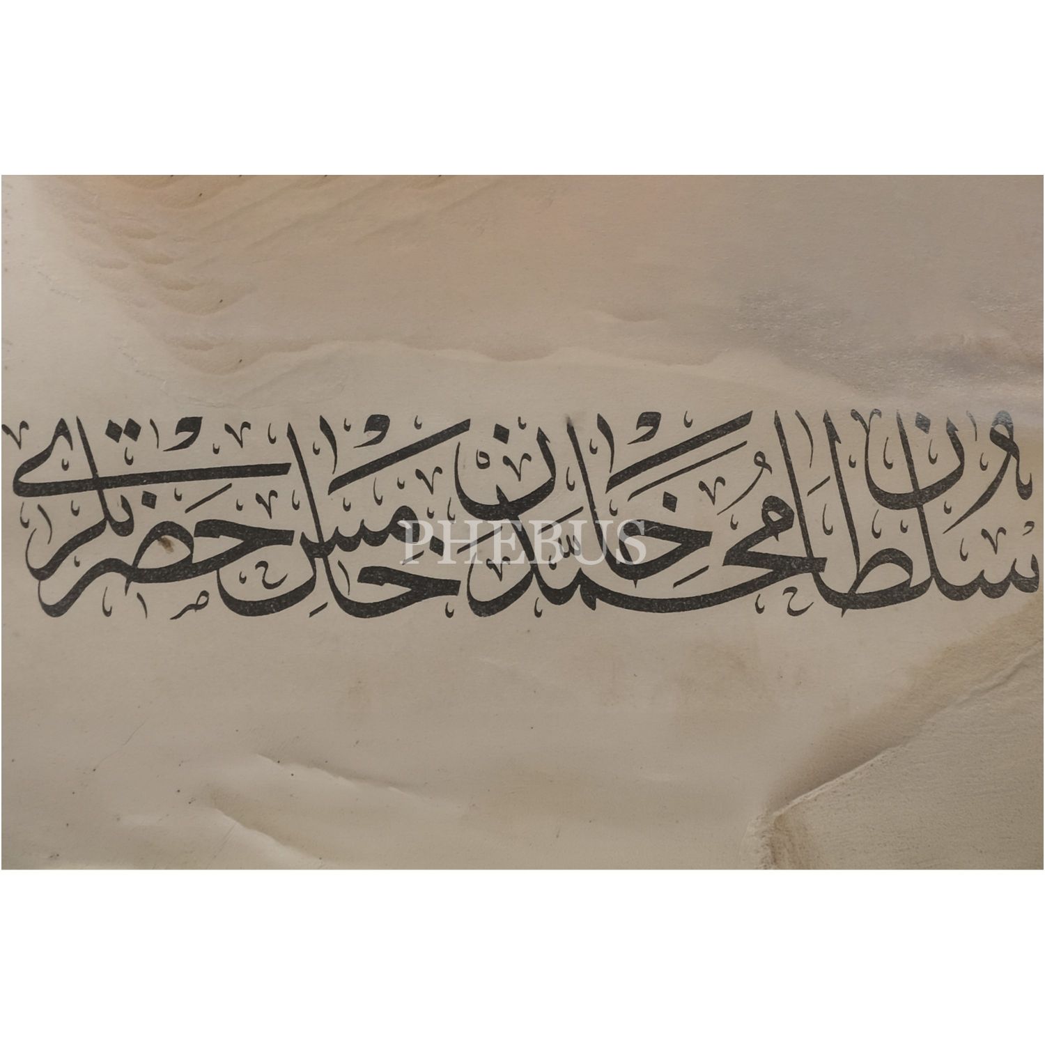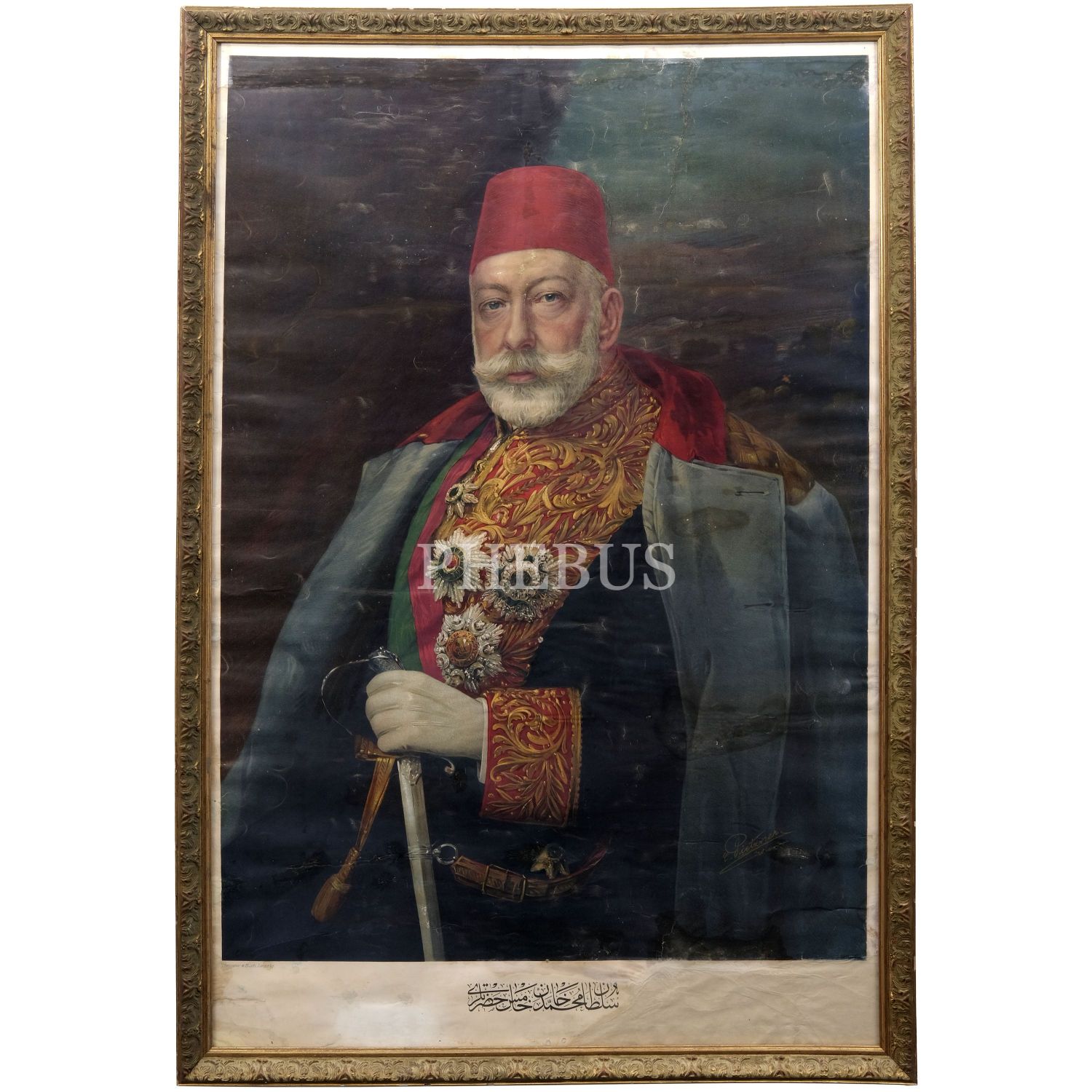 Sultan Mehmed Reşad'ın resmedildiği, Osmanlıca "Sultan Mehmed Han-ı Hamis Hazretleri" alt başlıklı, büyük boy renkli afiş, Meissner & Bach - Leipzig, 75x111 cm...