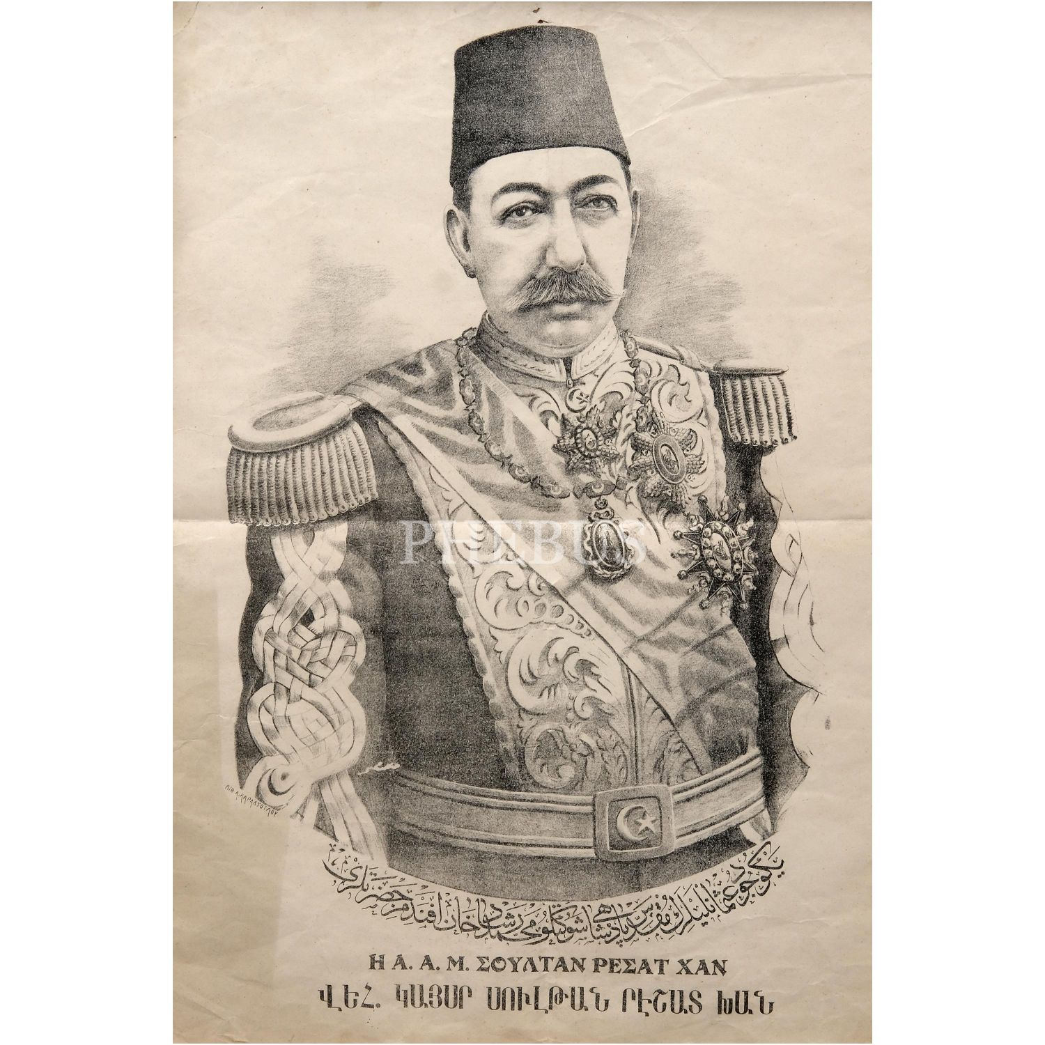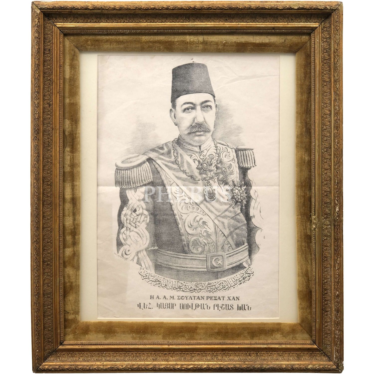 Sultan Mehmed Reşad'ın tasvir edildiği, Osmanlıca, Rumca ve Ermenice "Yekvücut Osmanlıların mukaddes padişahı şevketli Mehmed Reşad Han Efendimiz Hazretleri" alt başlıklı afiş, Karacaoğlu Matbaası, afiş 43x53 cm, çerçeve 63x75 cm...