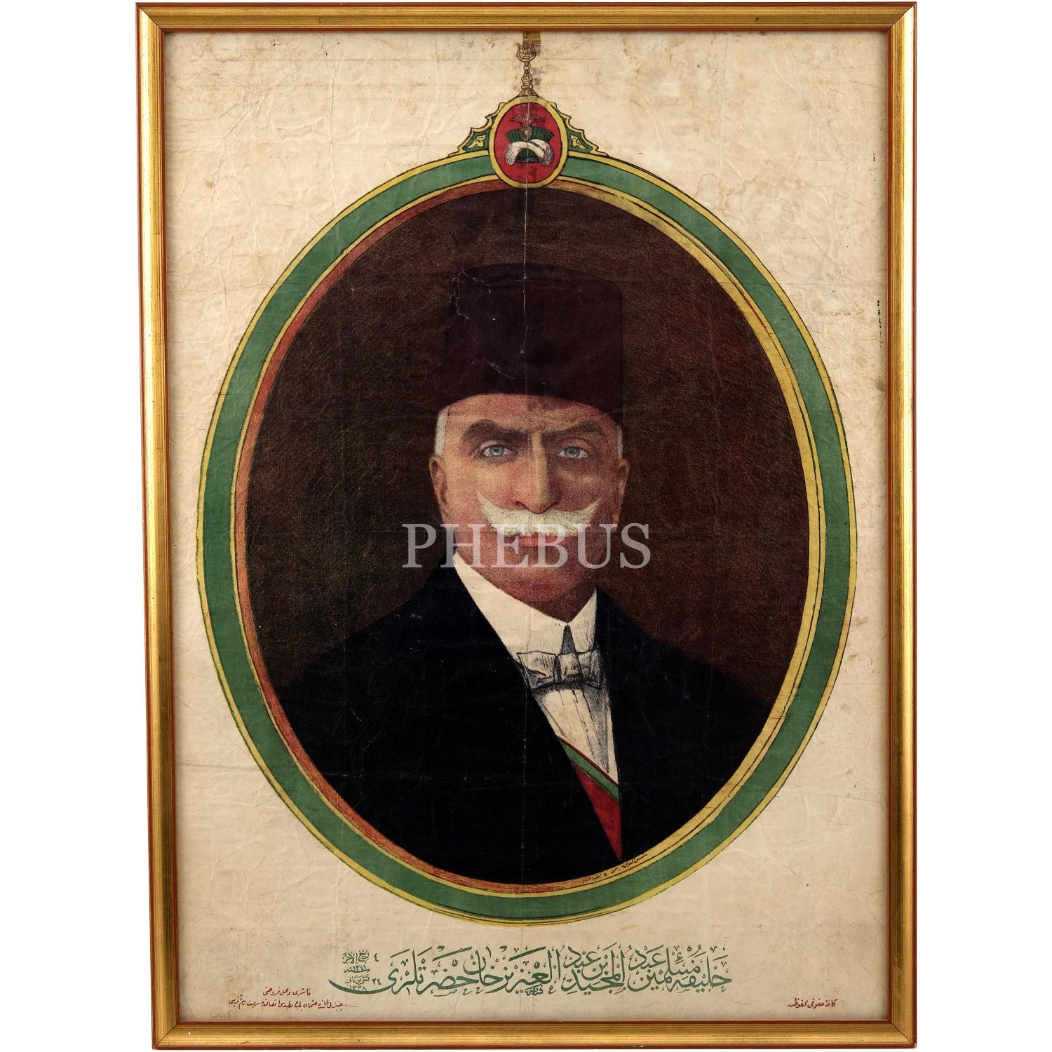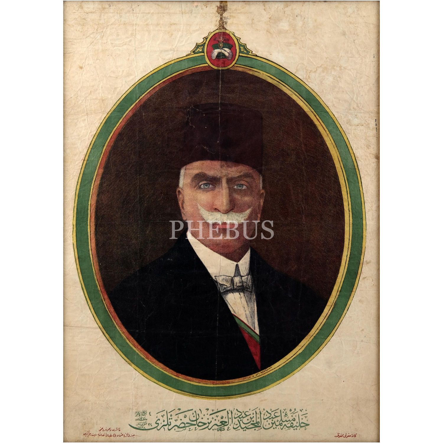 "Halife-i Müslimin Abdülmecid bin Abdülaziz Han Hazretleri" alt başlığıyla, Hilafet tacı görselli çerçeve içerisine yerleştirilmiş Halife Abdülmecid Efendi´nin fotoğrafına yer verilen afiş, editör: Sermiyat Resim Atölyesi, 56x76 cm...