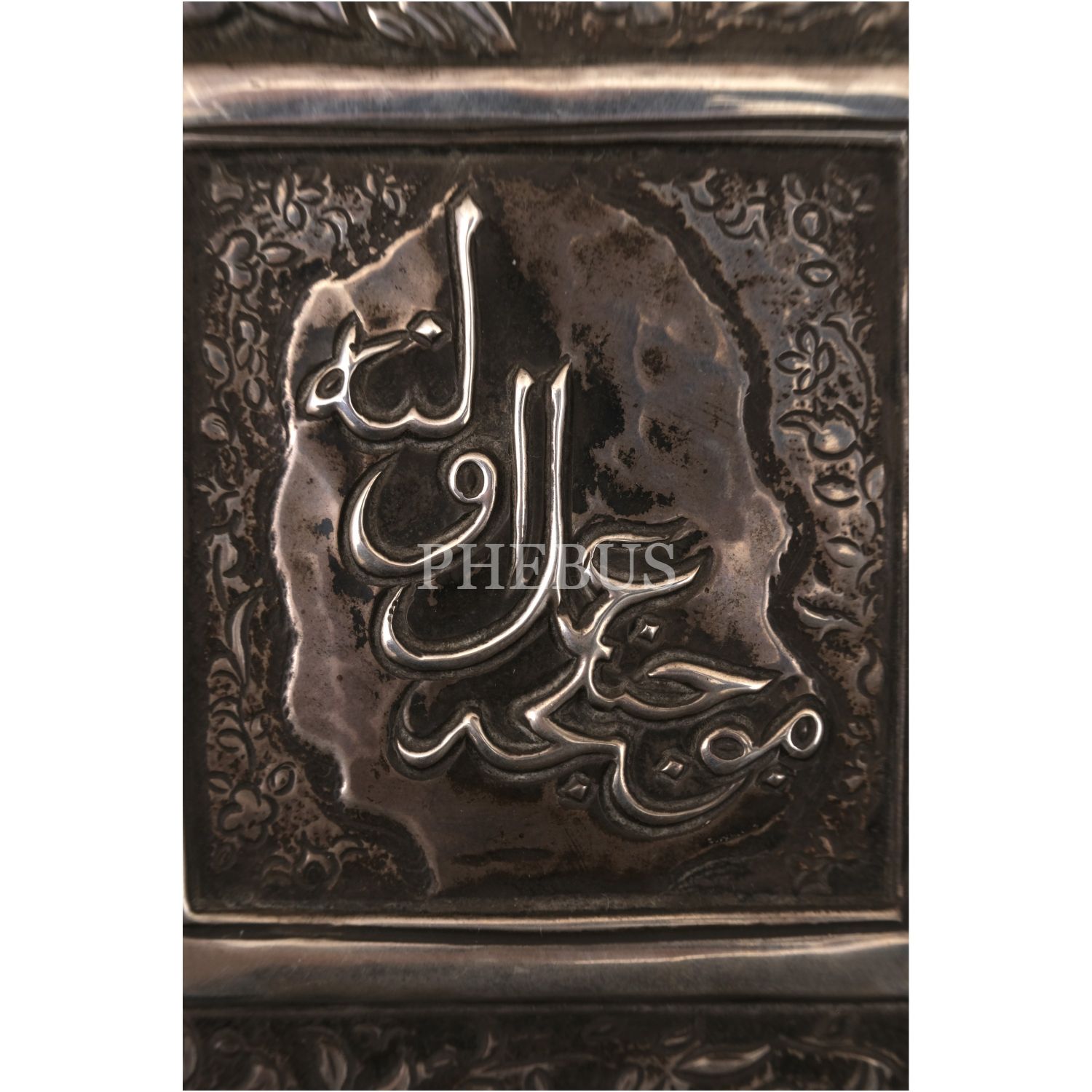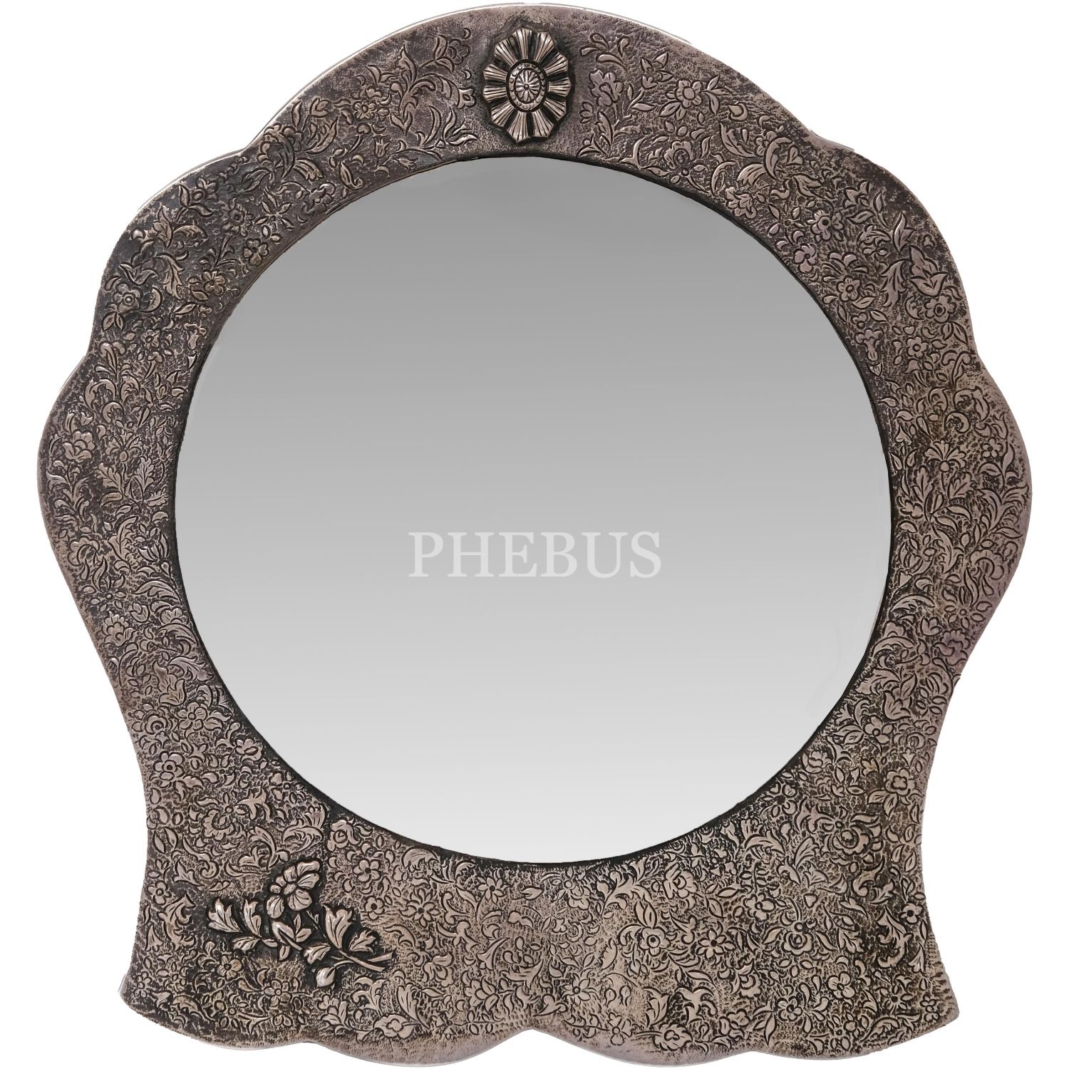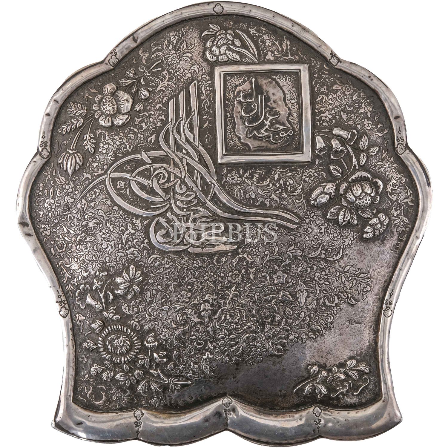 Sultan II. Mahmud döneminden, tuğralı, Osmanlıca "Mucebince amel oluna" yazılı ve Ermeni usta "Karabet" imzalı, ön ve arka yüzüne kalem işçiliğiyle floral motifler işlenmiş gümüş ayna, 26x28x1,5 cm...