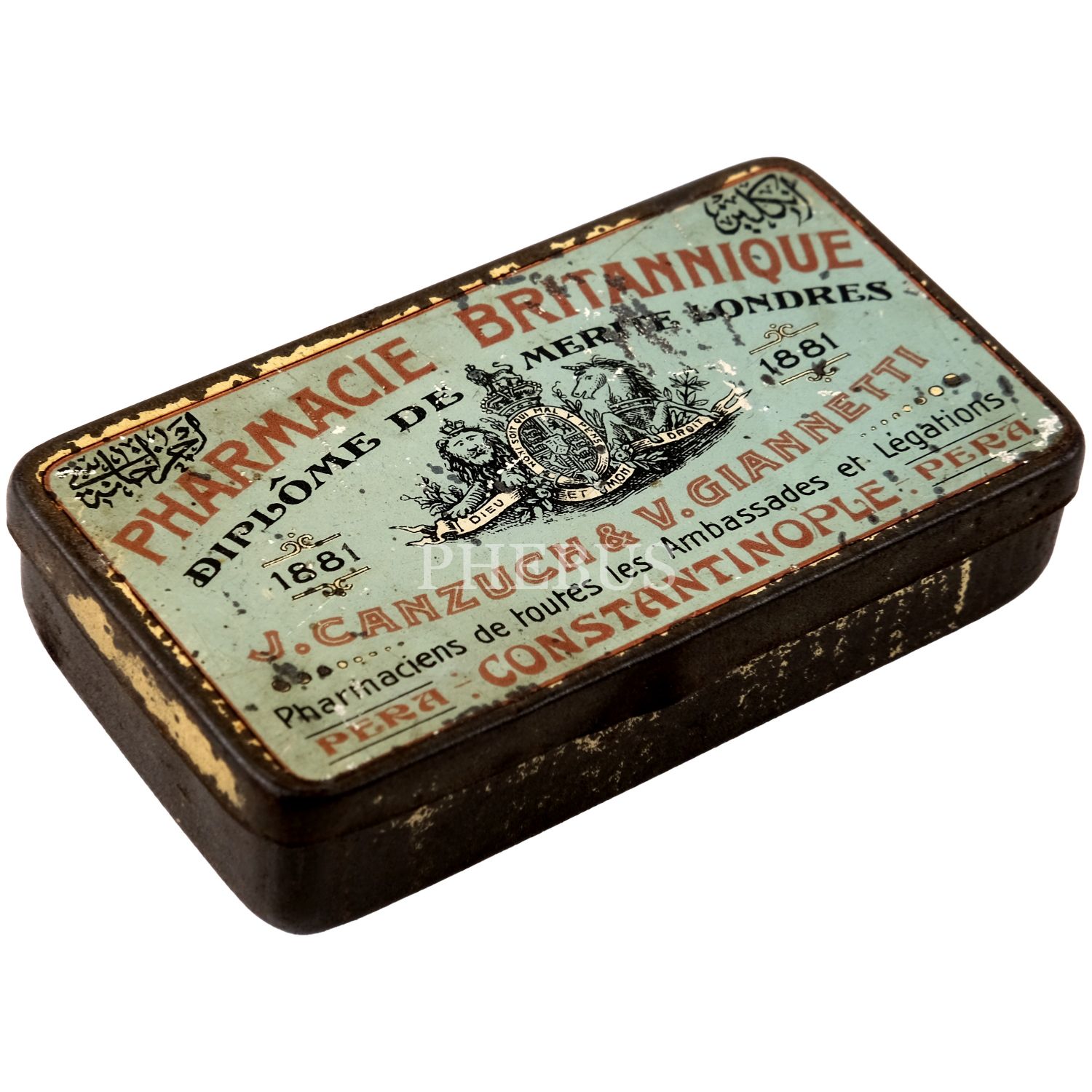 Pharmacie Britannique'in, Pera - Constantinople adresli teneke ilaç kutusu, 7,5x4x1,5 cm...