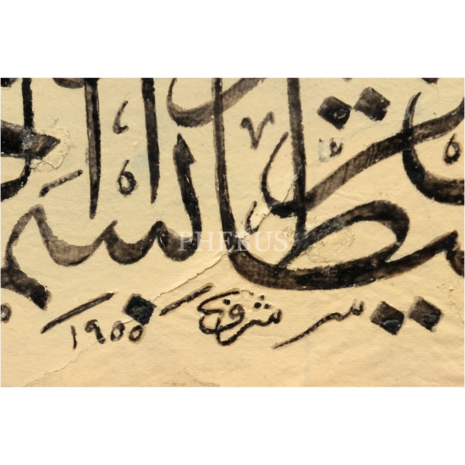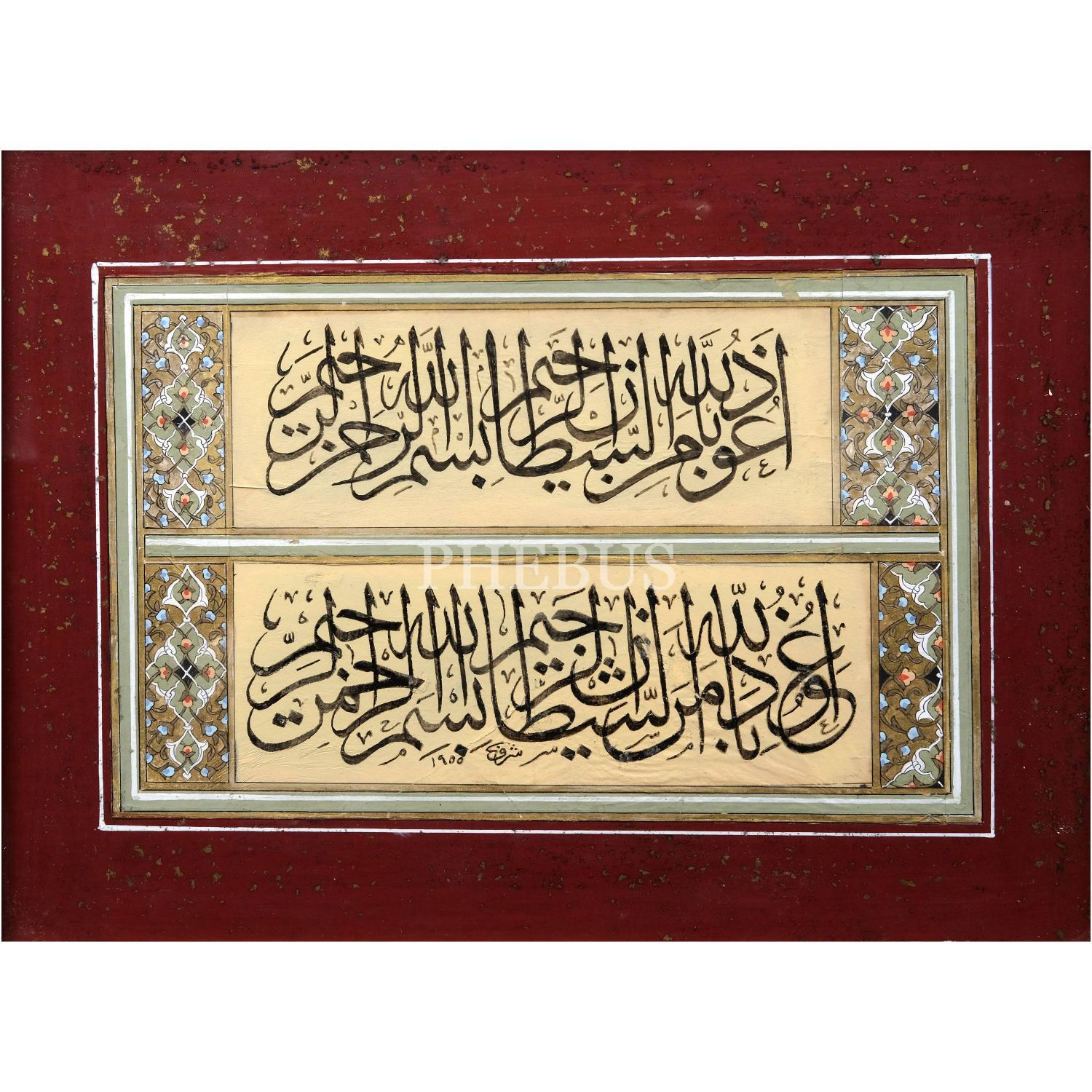 Şeref (Akdik) ketebeli sülüs eûzu besmele, tezhipli, 1955 tarihli, yazı ölçü: 23x14 cm, çerçeve içi ölçü: 31x23 cm...