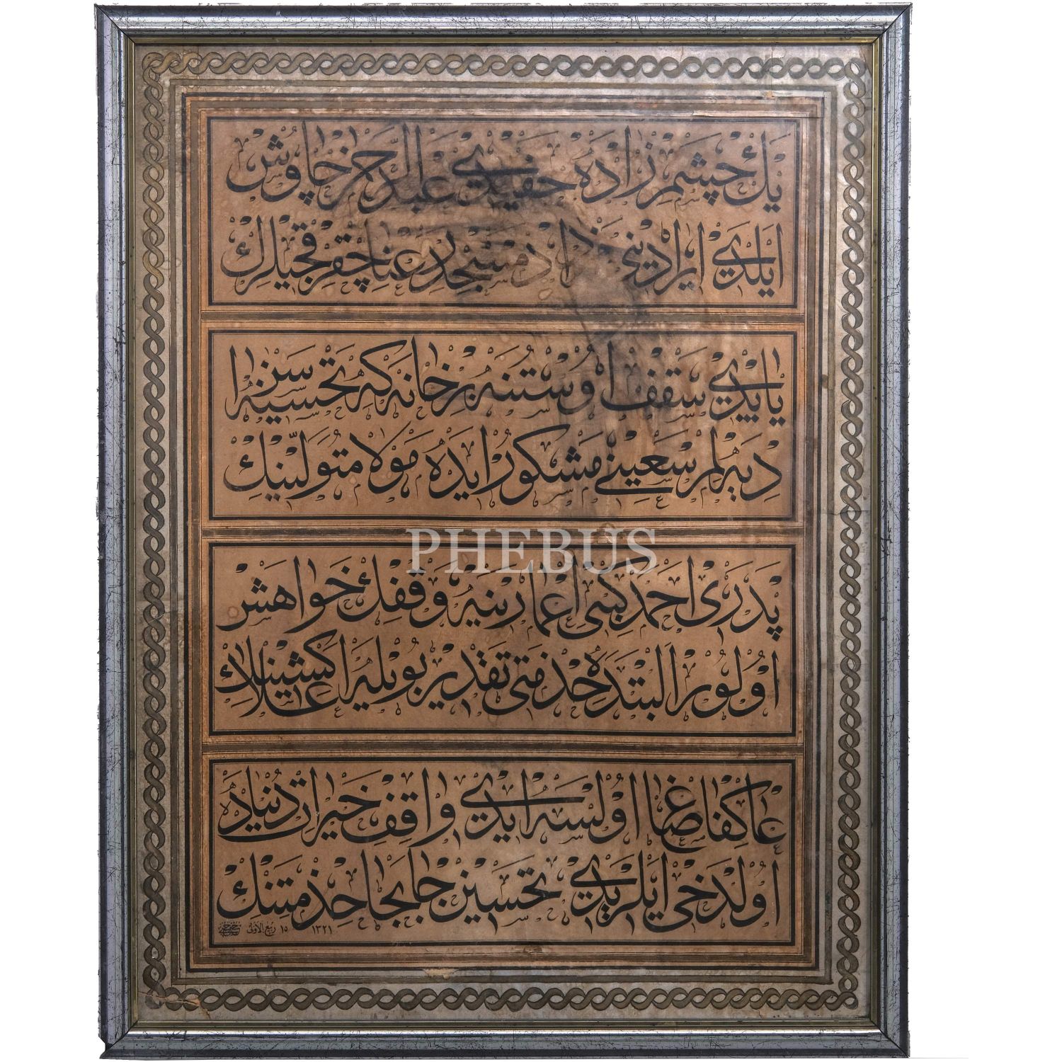 Hüseyin Hüsnü ketebeli sülüs kitâbe tarzı şiir, 1321 tarihli, yazı ölçü: 38x54 cm, 47x63 cm...