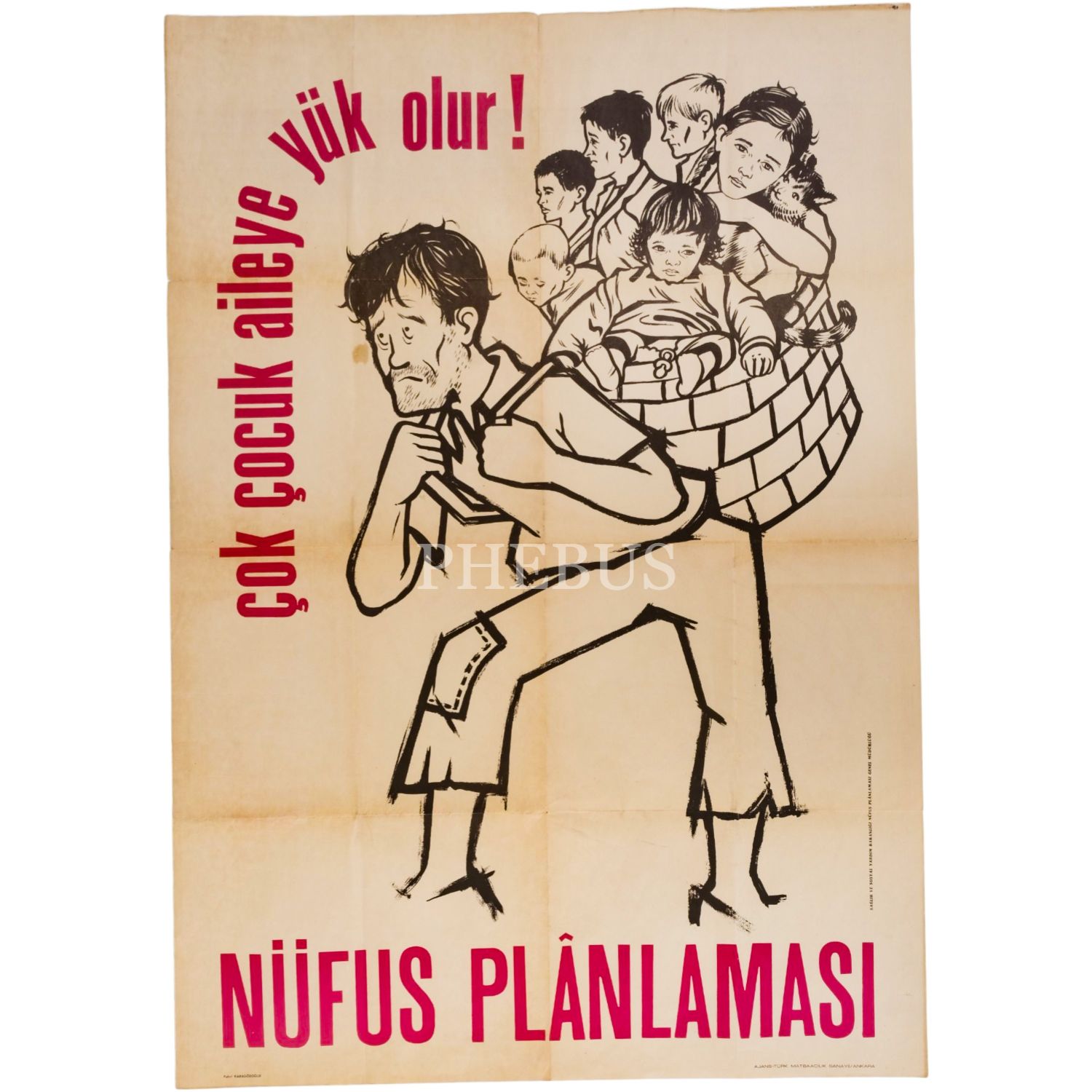 Fahri Karagözoğlu tasarımıyla, Sağlık ve Sosyal Yardım Bakanlığı Nüfus Plânlaması Genel Müdürlüğü tarafından yayımlanan, "Nüfus Plânlaması" başlıklı ve "Çok çocuk aileye yük olur!" sloganlı afiş, Ajans-Türk Matbaacılık Sanayii - Ankara, 69,5x99,5 cm...