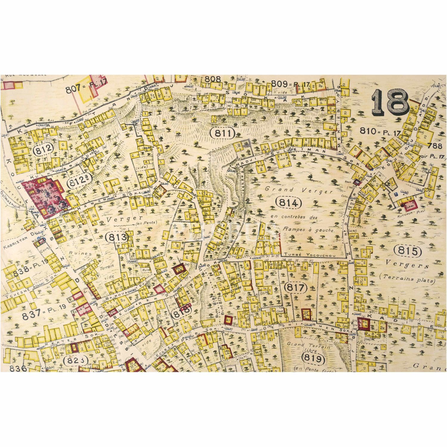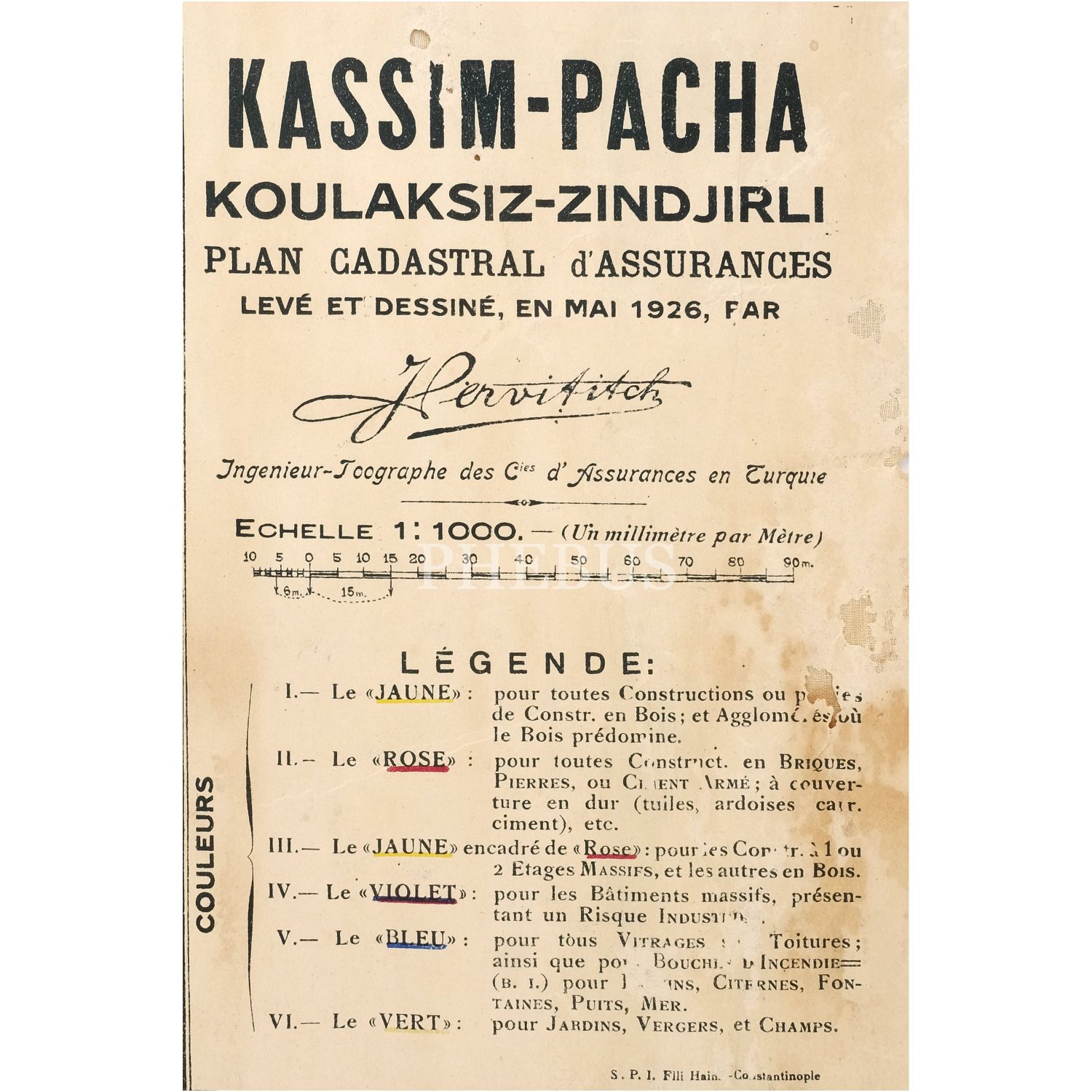 Jacques Pervititch tarafından Türkiye Sigortacılar Daire-i Merkeziyesi adına 1922-1945 yılları arasında hazırlanan İstanbul haritalarından, Beyoğlu, Kasımpaşa (Kulaksız - Zincirli) 1/1000 gayrimenkul haritası, Mayıs 1926, 18 numaralı pafta, paspartusuyla birlikte 68x81 cm...
