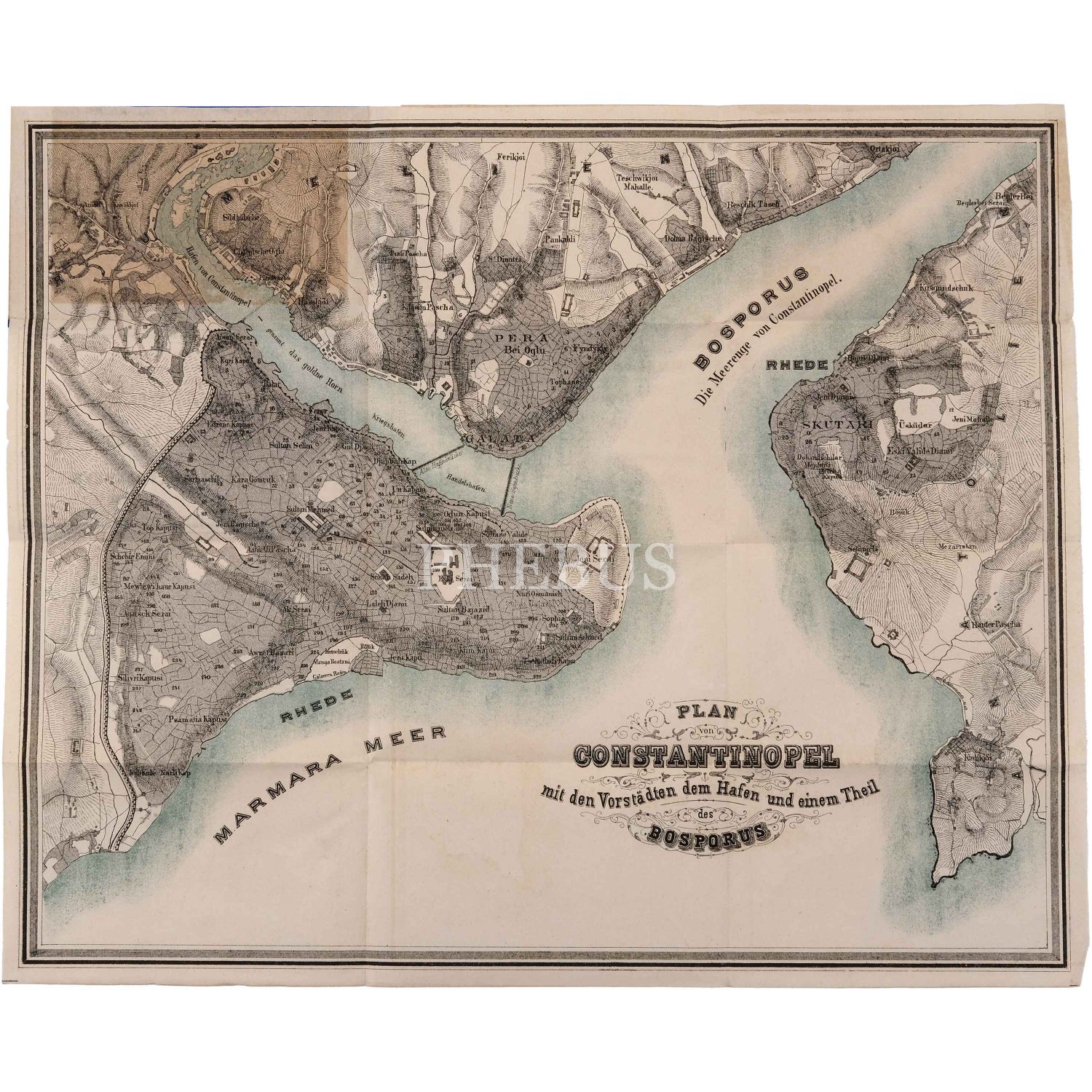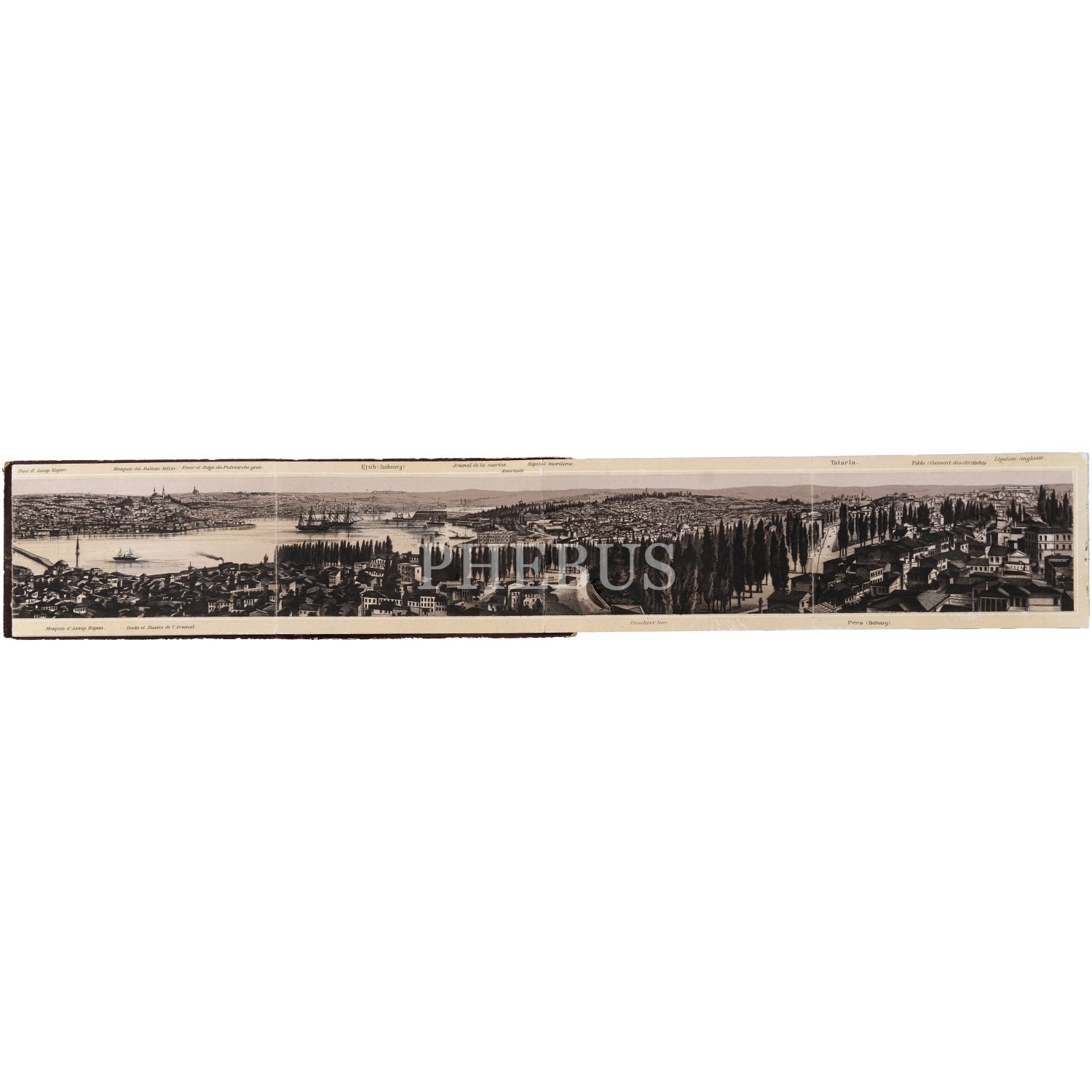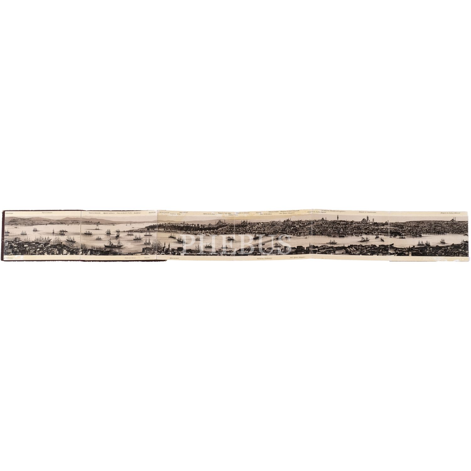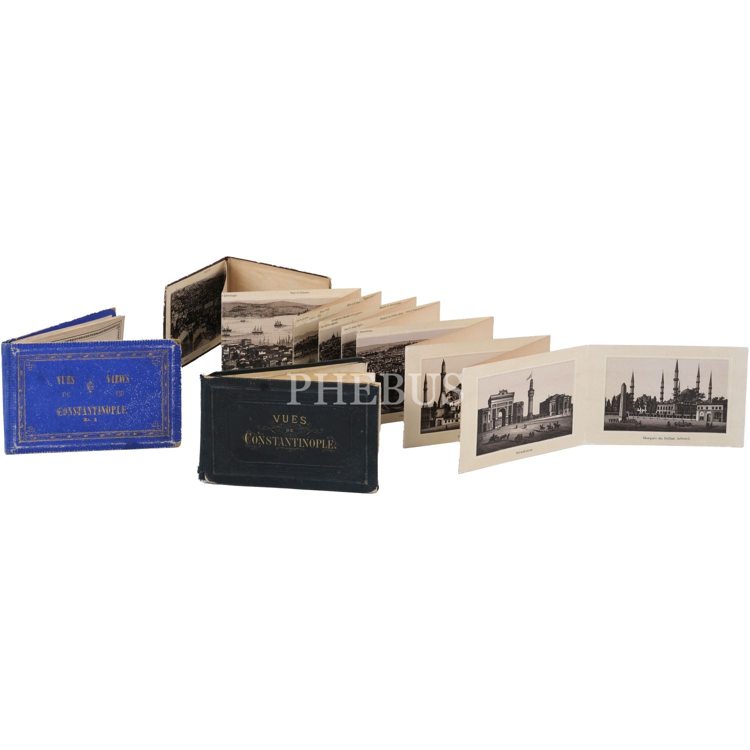 Osmanlı İstanbul'undan -katlanır- panoramik manzaralar ve tekil fotoğraflar içeren üç adet küçük boy hatıra albümü, iki numaralı albümün son sayfasında "Plan von Constantinople" başlıklı bir İstanbul haritası yer almaktadır, albümler (ortalama) 12,5x8 cm...