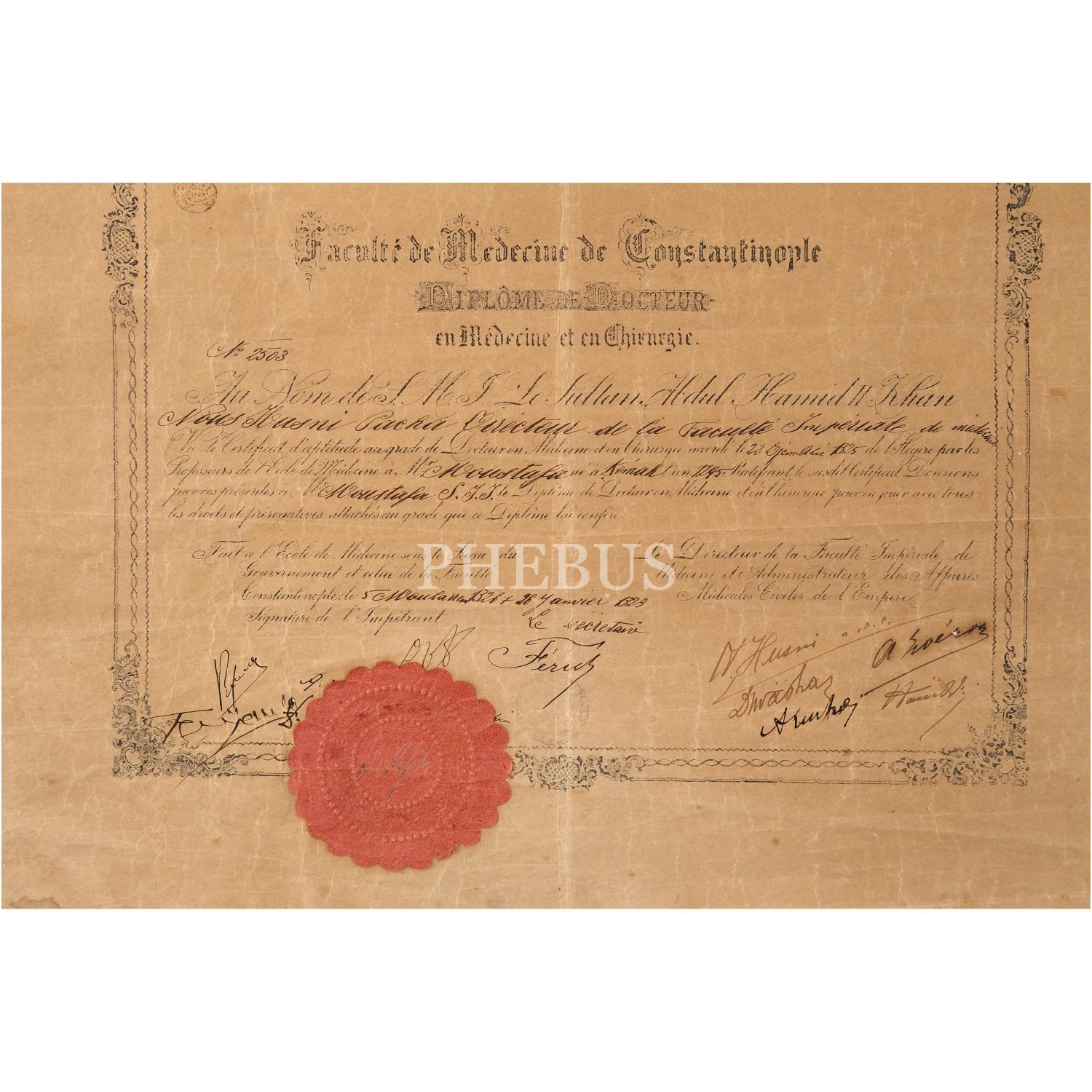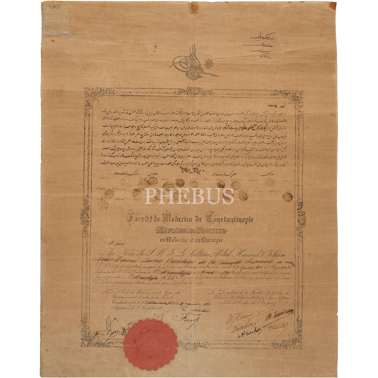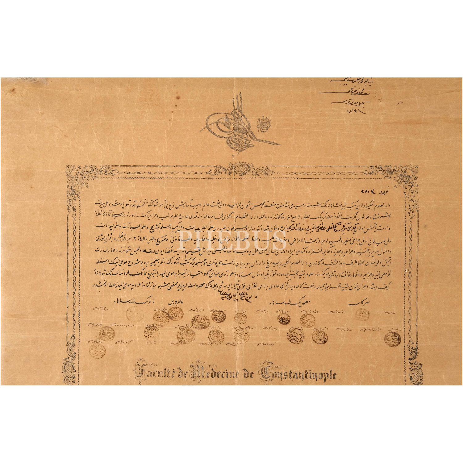 Mekteb-i Tıbbiye-i Mülkiye-i Şahane´den 1326 tarihinde mezun olan Mustafa Safi bin Yusuf İzzet Efendi´nin, Osmanlıca ve Fransızca tıp diploması, 45x57 cm...