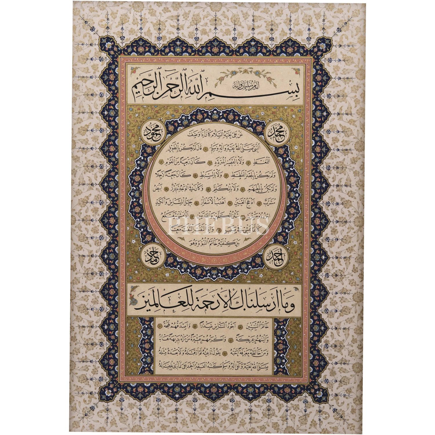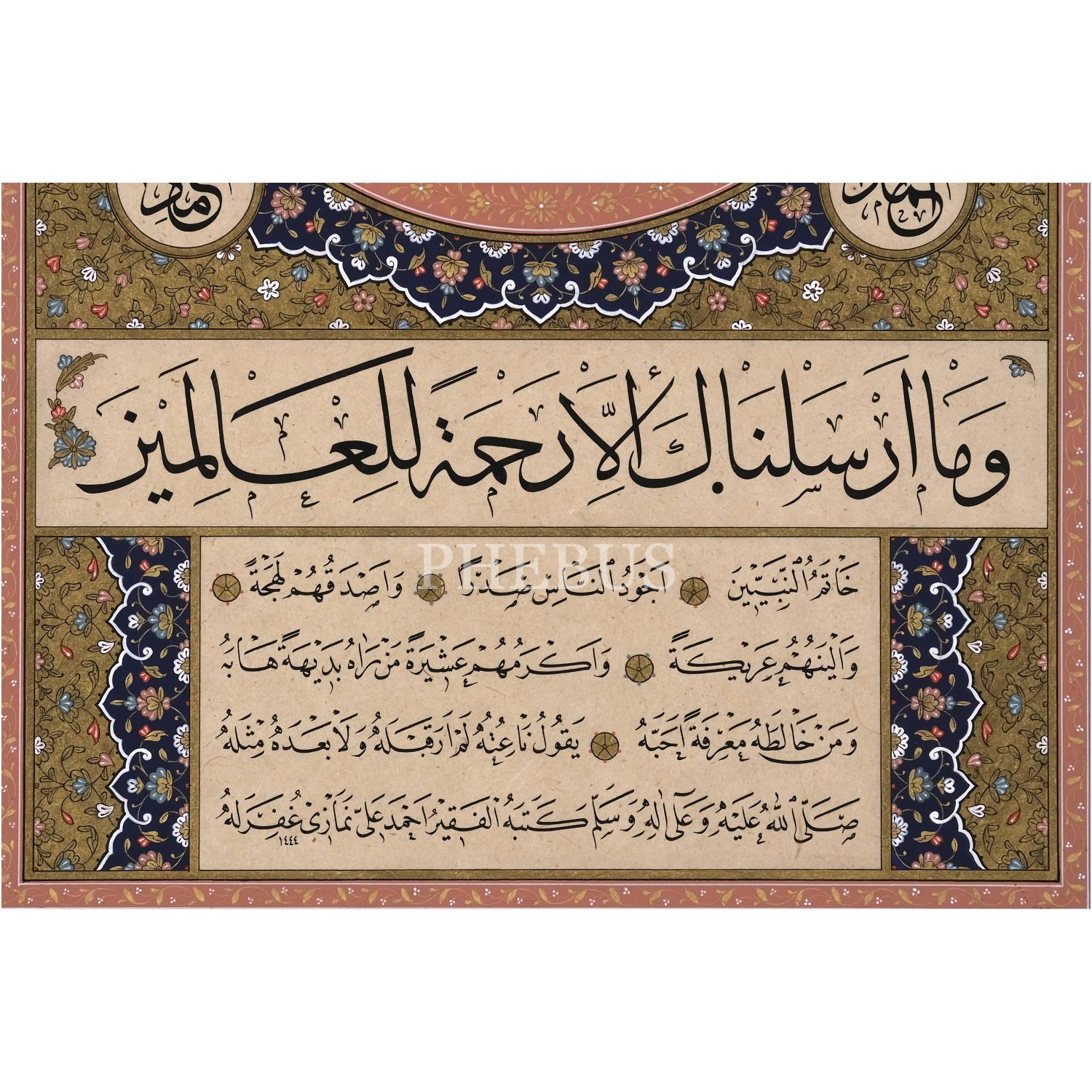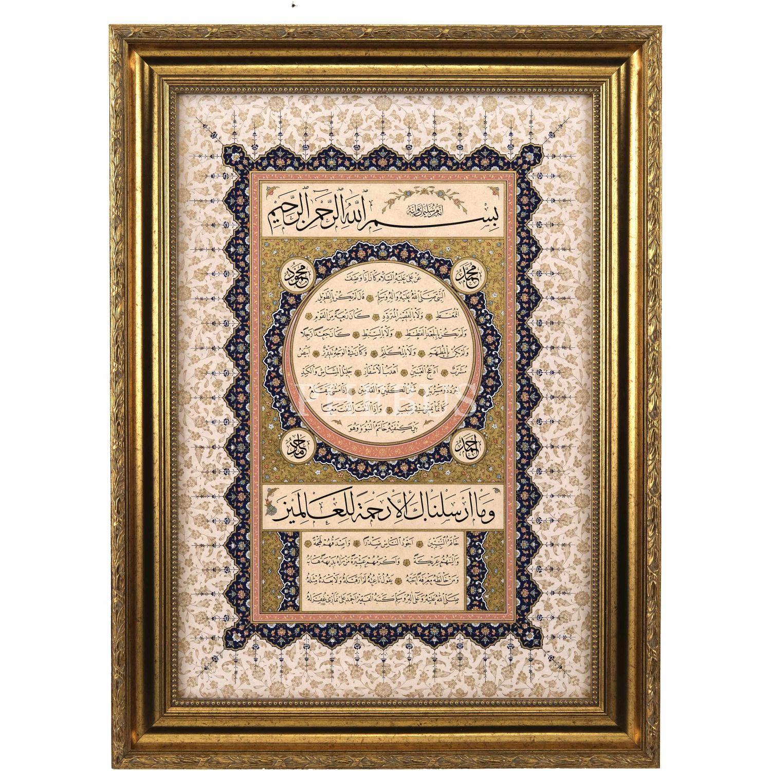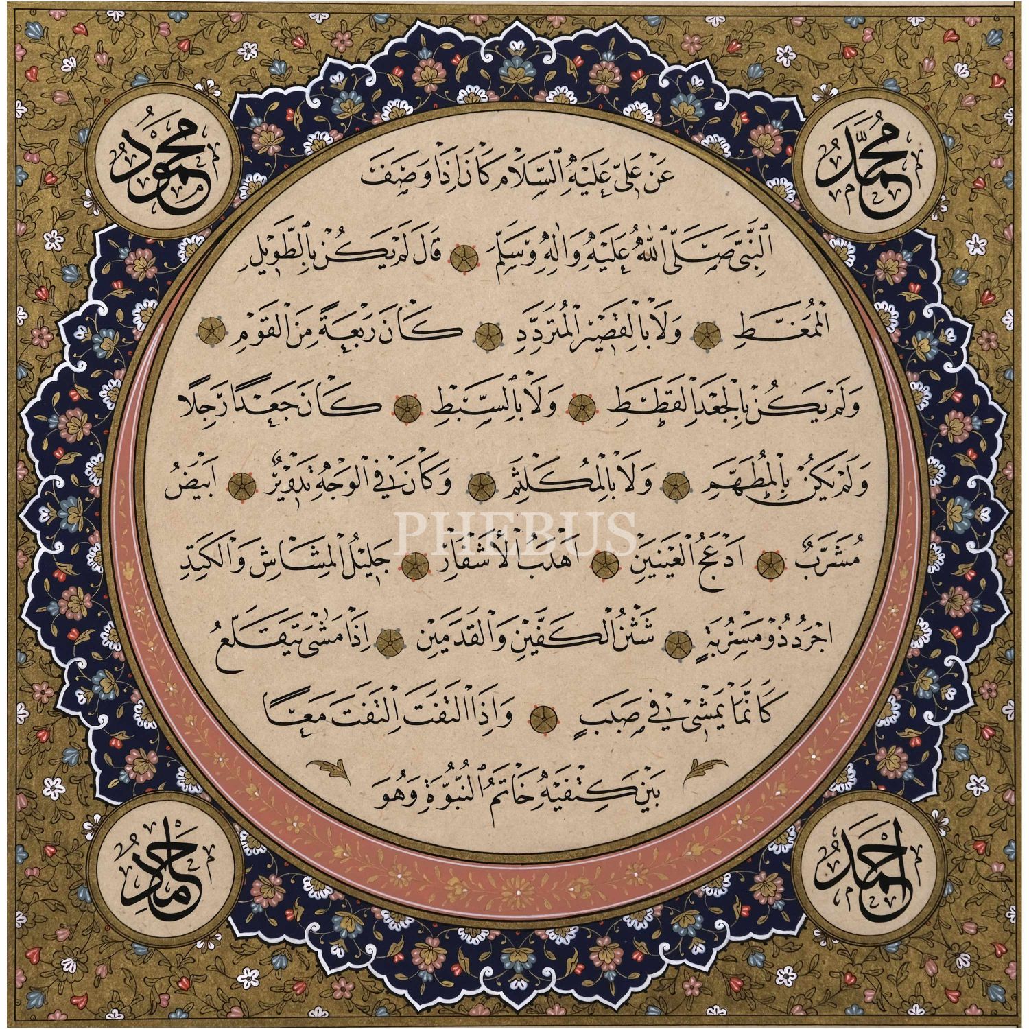 Ahmed Namazî ketebeli sülüs-nesih hilye, hicrî 1444 tarihli, tezhip: Muammer Çelik, 1446 tarihli, yazı ölçü: 29x52 cm, çerçeve içi ölçü: 51x73 cm...