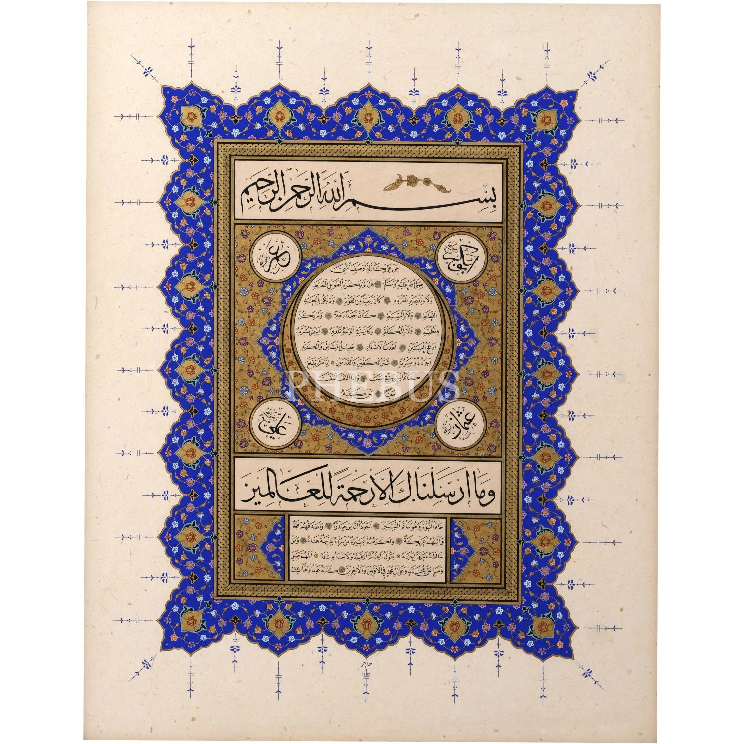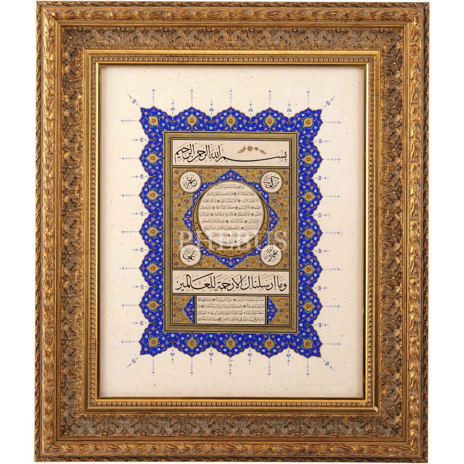Abdülvahab (Saif) ketebeli hilye, hicrî 1444 tarihli, tezhip: Hacer Bingöl, 1446 tarihli, yazı ölçü: 19x30 cm, çerçeve içi ölçü: 42x53 cm...