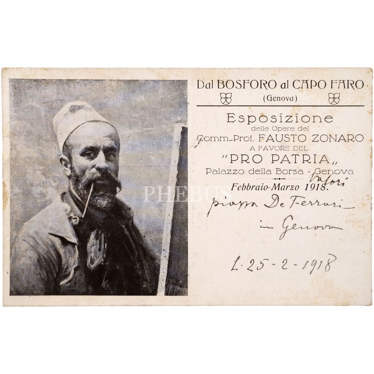 Bayram kartpostalı, Torino´da faaliyet gösteren kartpostal editörü E. Oneglia tarafından yayımlanmıştır. Zonaro tarafından 17 Şubat 1904 tarihinde imzalanmış ve Padova´da (İtalya) yaşayan Giovanni Picecco´ya postalanmıştır. "Boğaziçi´nden Capo Faro´ya" isimli serginin kartpostalı ise Zonaro tarafından 25 Şubat 1918 tarihinde imzalanmış ve Monako´da yaşayan bir kişiye postalanmıştır. Fausto Zonaro (1854–1929), Osmanlı İmparatorluğu’nun son dönemine damgasını vurmuş İtalyan bir oryantalist ressamdır. En çok, İstanbul’da geçirdiği yıllar ve Saray Ressamlığı göreviyle tanınır. 1891’de İstanbul’a yerleşti ve resim çalışmalarıyla kısa sürede Osmanlı çevrelerinde tanındı. 1896 yılında, dönemin padişahı II. Abdülhamid tarafından “Ressam-ı Hazret-i Şehriyari” (Saray Ressamı) unvanına layık görüldü ve bu unvanı Sultan II. Abdülhamid’in tahttan indirileceği 1909 yılına dek taşıdı. İstanbul’da yaşadığı yirmi yıl boyunca saray törenlerini, askerî geçitleri, İstanbul’un büyüleyici manzaralarını ve günlük hayatını resmeden Zonaro´nun eserleri günümüzde sanat piyasasında ve koleksiyon dünyasında önemli bir değer taşımaktadır.