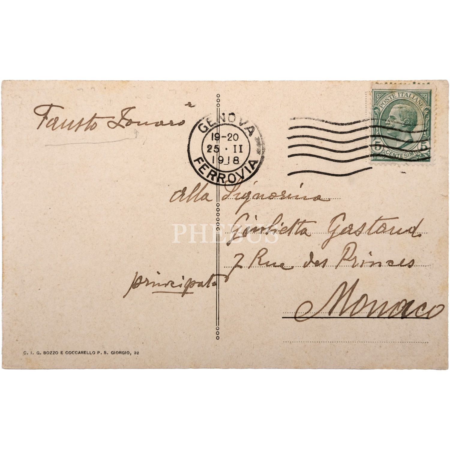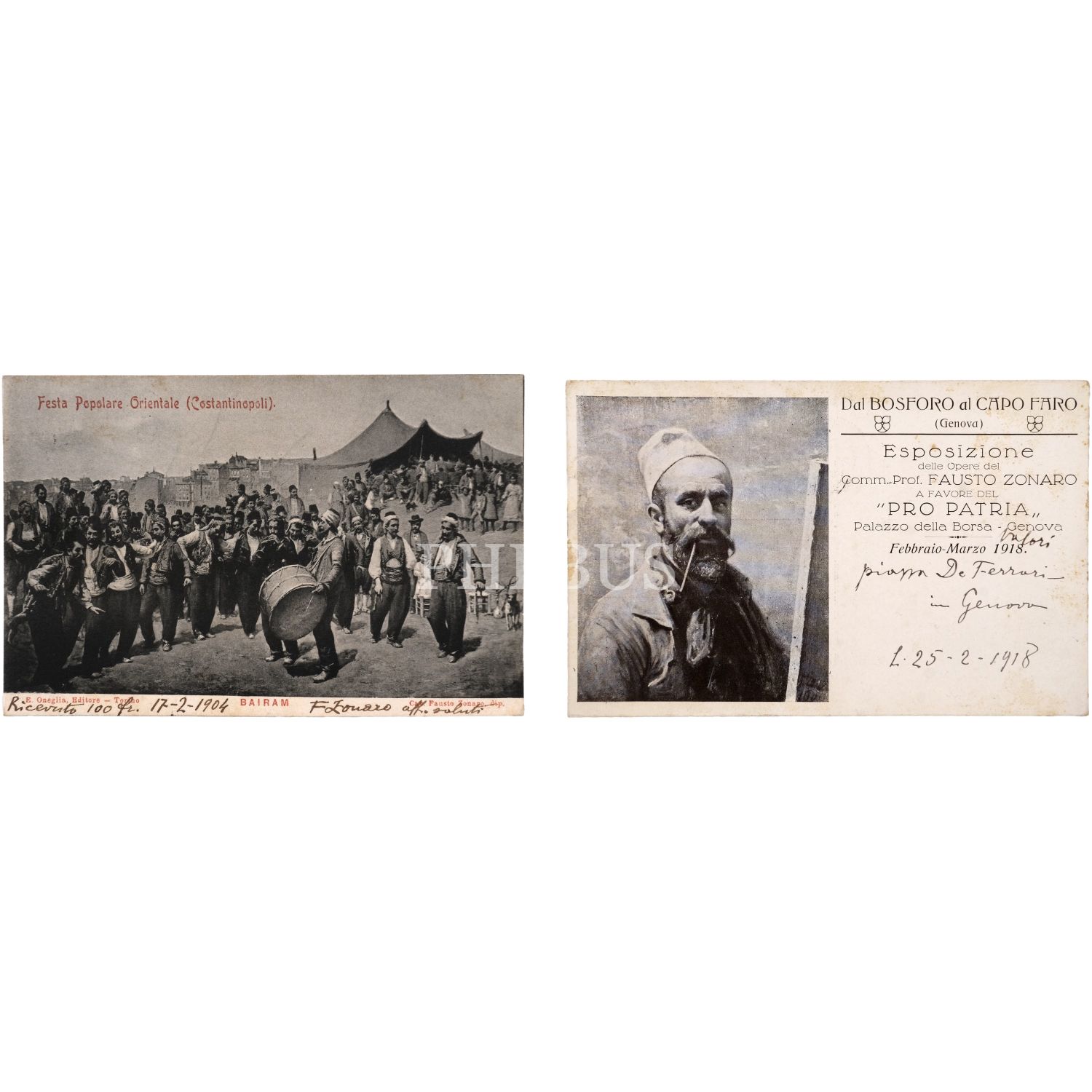 Fausto Zonaro´nun "Bairam" (Bayram) isimli meşhur eserinin, Zonaro´dan ıslak imzalı, postadan geçmiş kartpostal baskısı ile; 1918 yılının Şubat - Mart aylarında Cenova´da düzenlenen, “Boğaziçi’nden Capo Faro’ya" isimli sergide eserleri yer alan Zonaro´nun fotoğrafıyla birlikte sergiye dair bilgilerin yer aldığı kartpostalın yine kendisinden ıslak imzalı, postadan geçmiş kartpostalı, 14x9 cm...