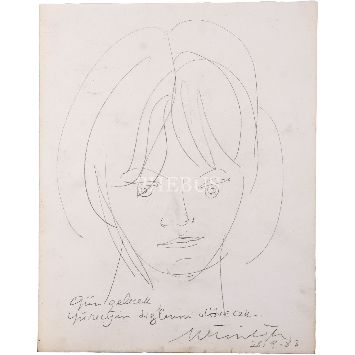 Metin Eloğlu'nun, eşi Nur Eloğlu'nu resmettiği ve "Gün gelecek / Yüreceğin dizlerini dövecek..." notuyla imzaladığı, 28 Eylül 1983 tarihli, kâğıt üzerine kurşun kalem resim, 24x30 cm...