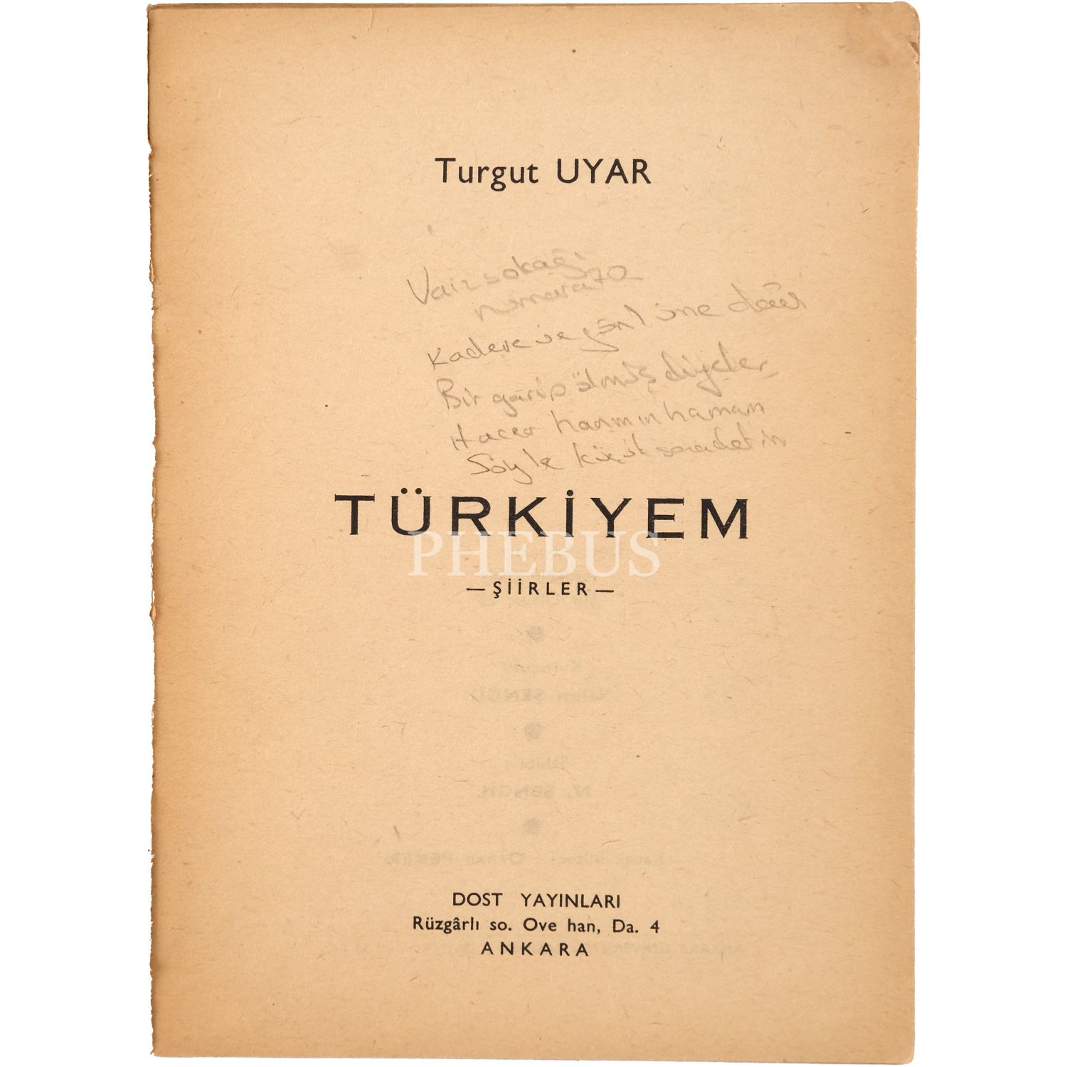 İkinci Yeni´nin en önemli şairlerinden Turgut Uyar´ın -sağlığında- ikinci baskısı yapılan tek kitabı... "Ne olursa olsun, Turgut Uyar için zarımı atıyorum." diyerek, Turgut Uyar´ın Türk şiirine damga vuracak bir şair olduğunu yıllar öncesinden kestiren Nurullah Ataç´ın önsözü ile... "Turgut´un tanımadığı bir dosta vekâleten." ithafıyla, 1971 yılında Tomris Uyar tarafından imzalanmıştır. *Ön kapağı ciltten büyük oranda ayrılmıştır.