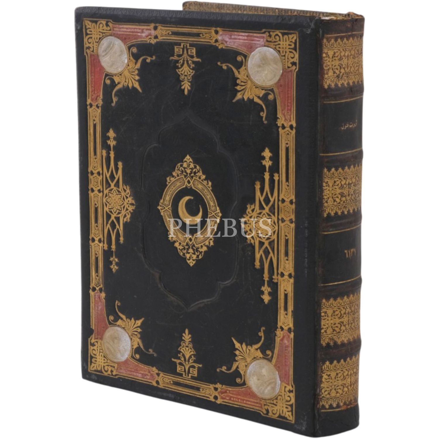 Ön ve arka kapağın göbeği hilal ve çiçek motifleriyle, kenarları ve sırtı altın ve kırmızı renkli motiflerle süslenmiş, sayfa kenarları altın yaldızlı cildinde...