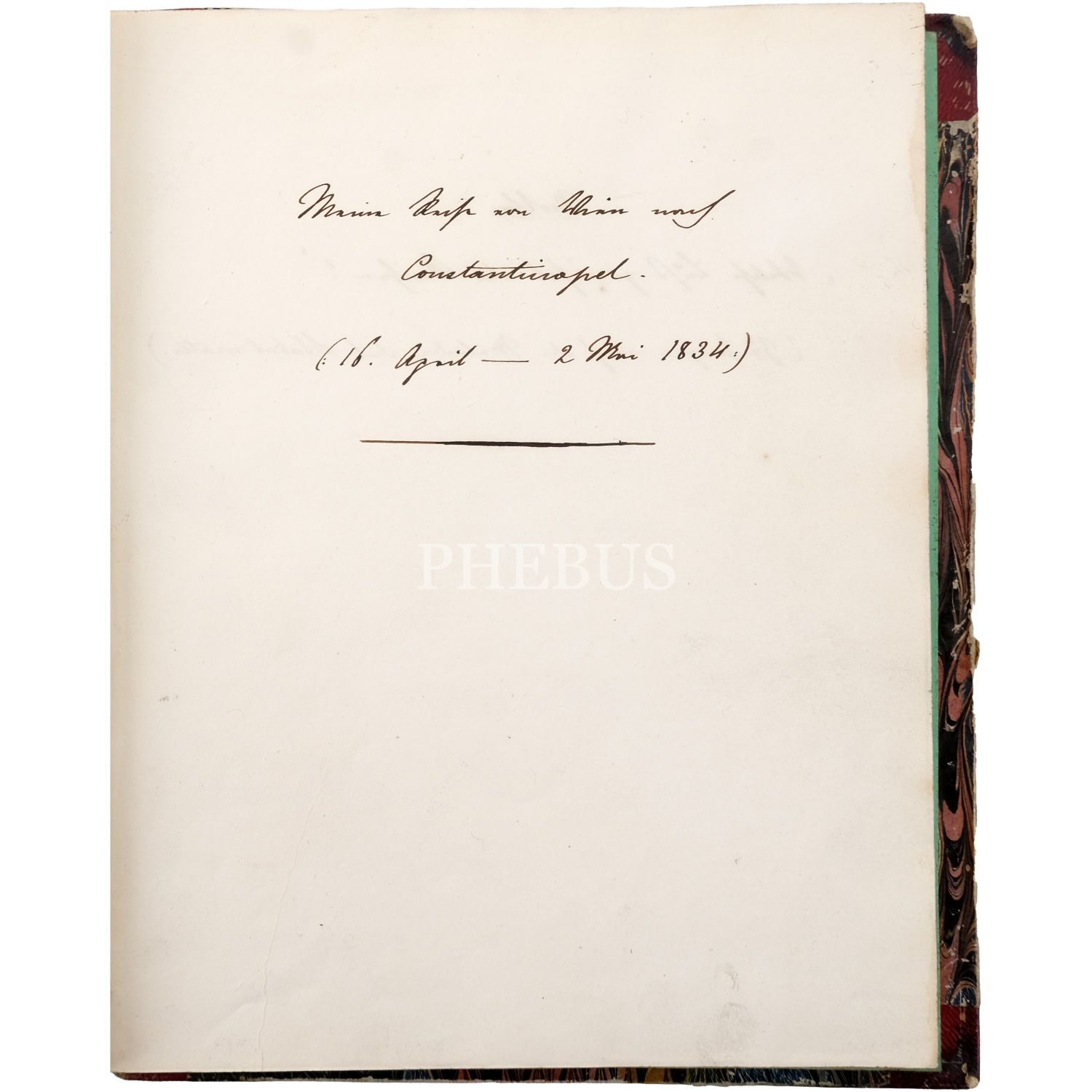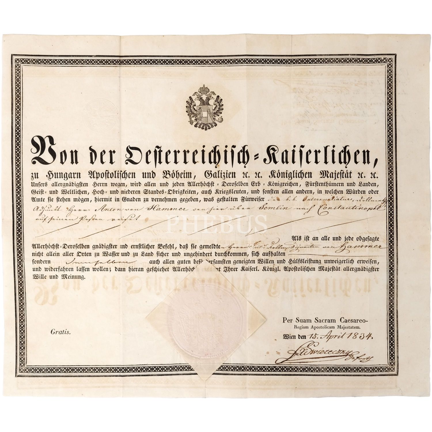 Avusturya İmparatorluğu tarafından, sefaret tercümanı Anton von Hammer’in Belgrad’dan İstanbul’a memur olarak tayin edilmesi üzerine kendisine verilen evrak ile Osmanlı topraklarında İstanbul’a varıncaya kadar geçeceği güzergâhta herhangi bir zorlukla karşılaşmaması için kaleme alınmış Osmanlıca belge ve Anton von Hammer’in 16 Nisan–2 Mayıs 1834 tarihleri arasında gerçekleştirdiği bu yolculuğu el yazısıyla kaleme aldığı seyahatnamesi, Almanca evrak 44x37 cm, Osmanlıca evrak 21x38 cm, seyahatname 16x20 cm...