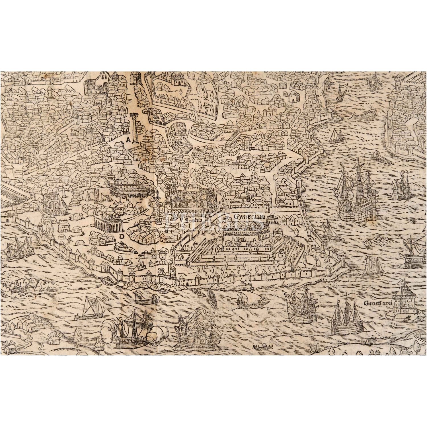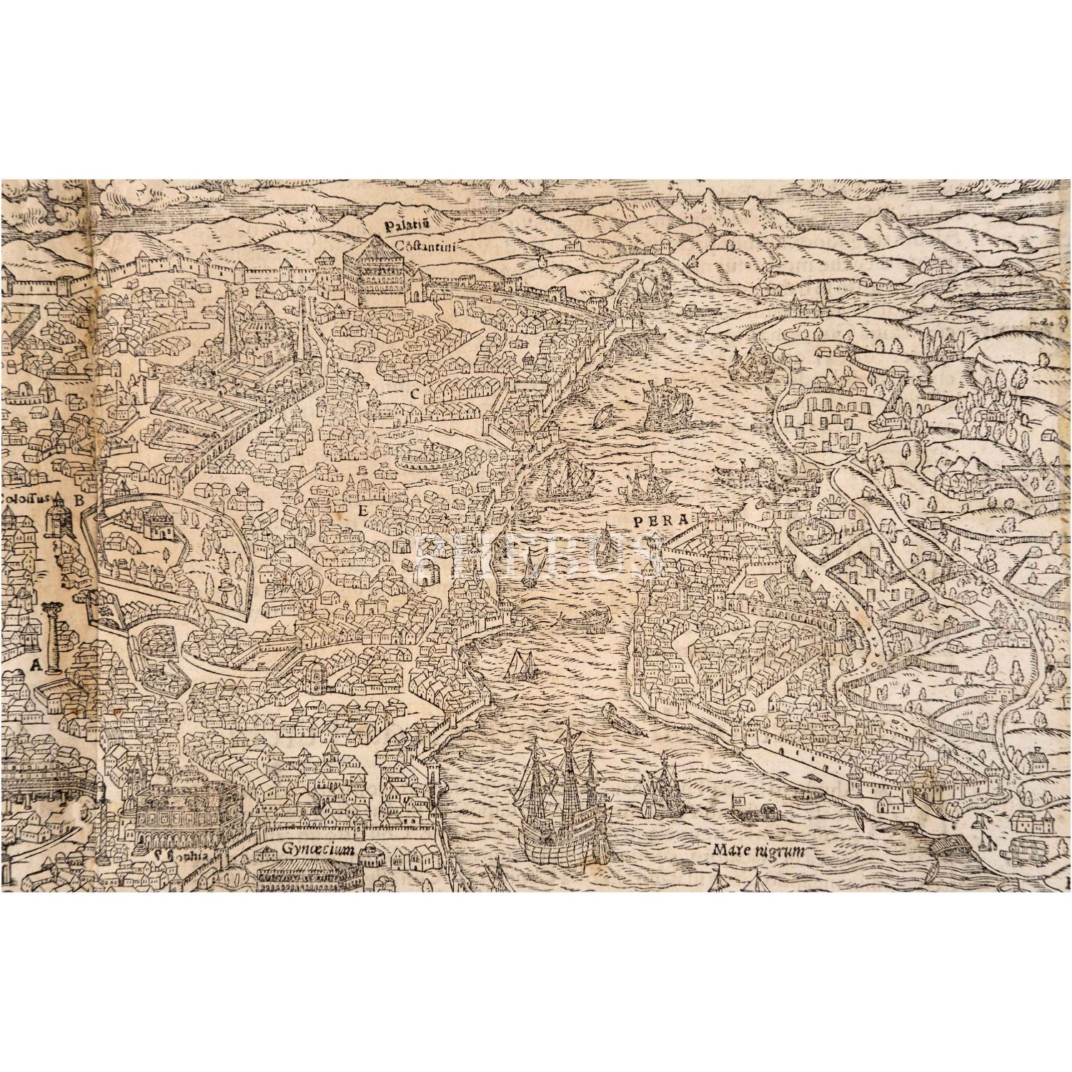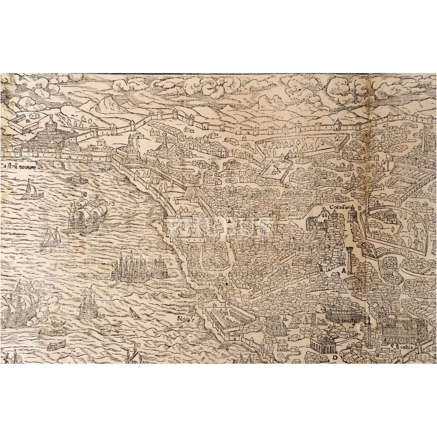 Sebastian Münster´in alanında bir efsane olan Cosmographia isimli eserinden, İstanbul´un kuşbakışı harita/panorama tasviri, 41x30 cm...