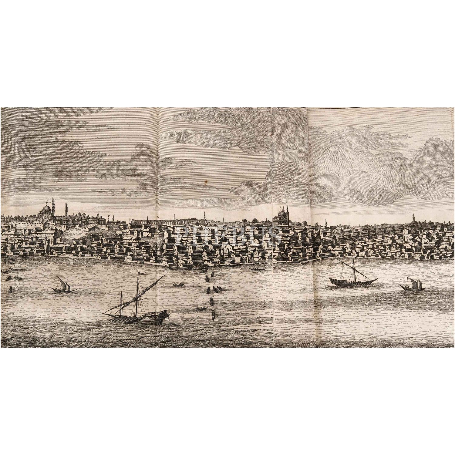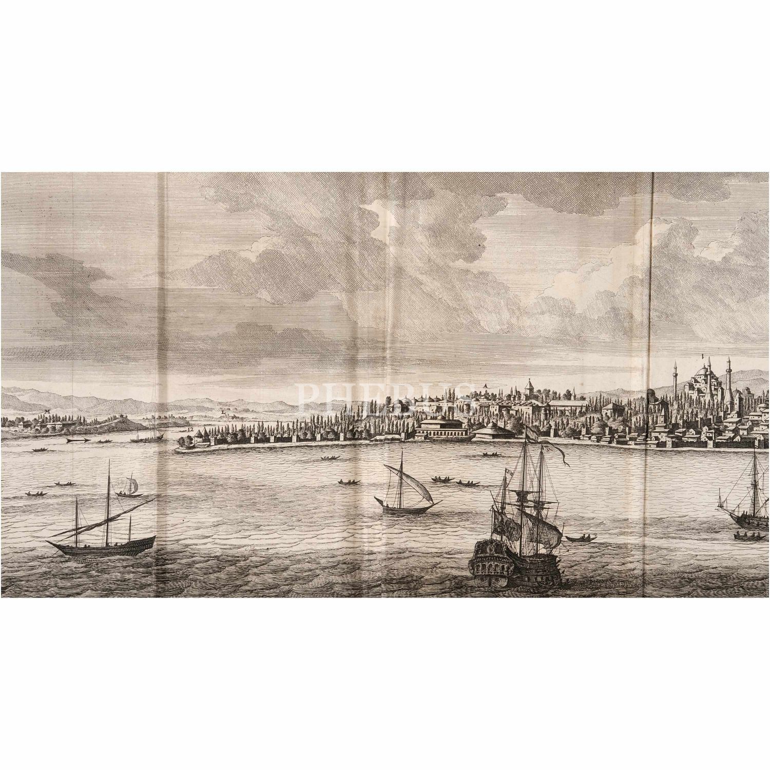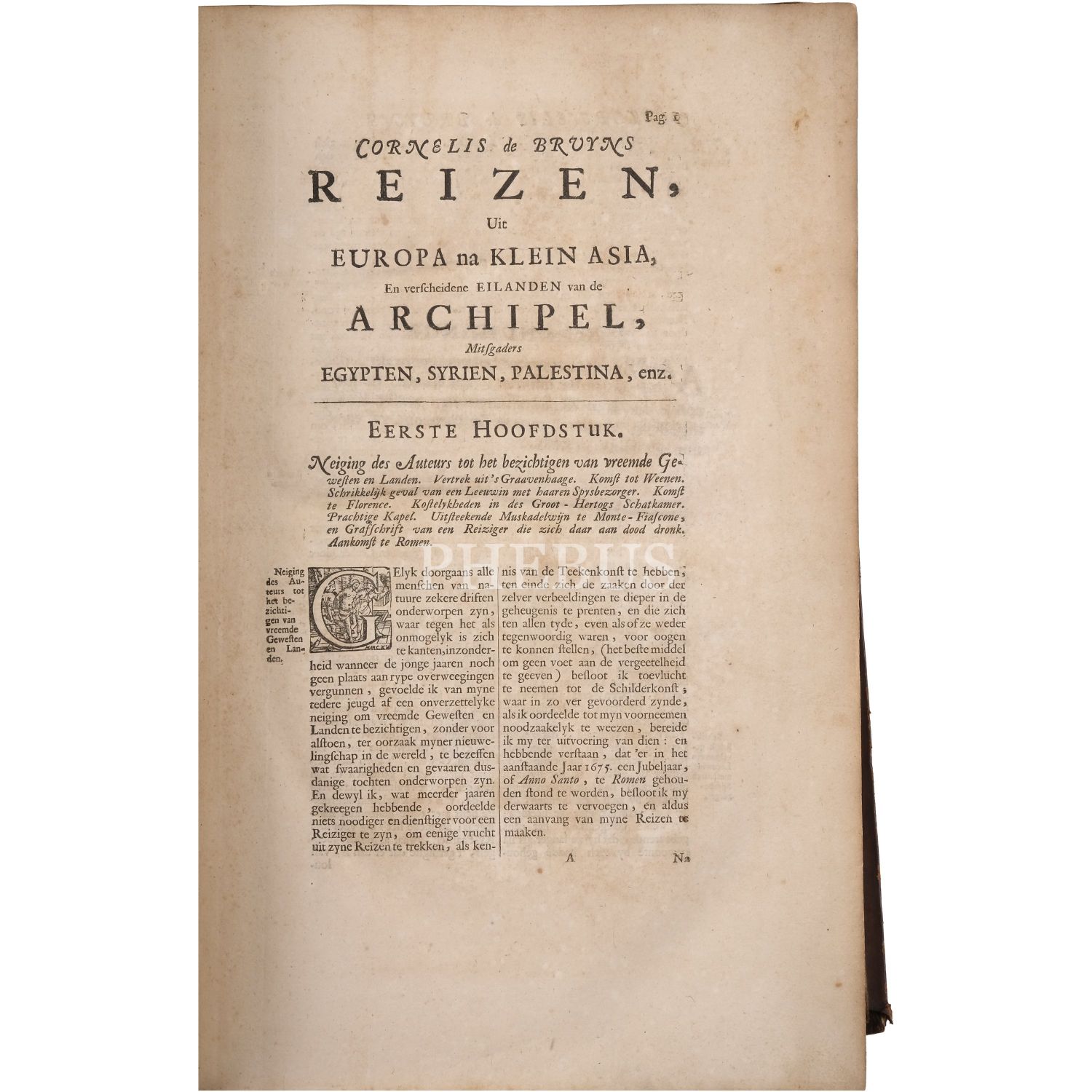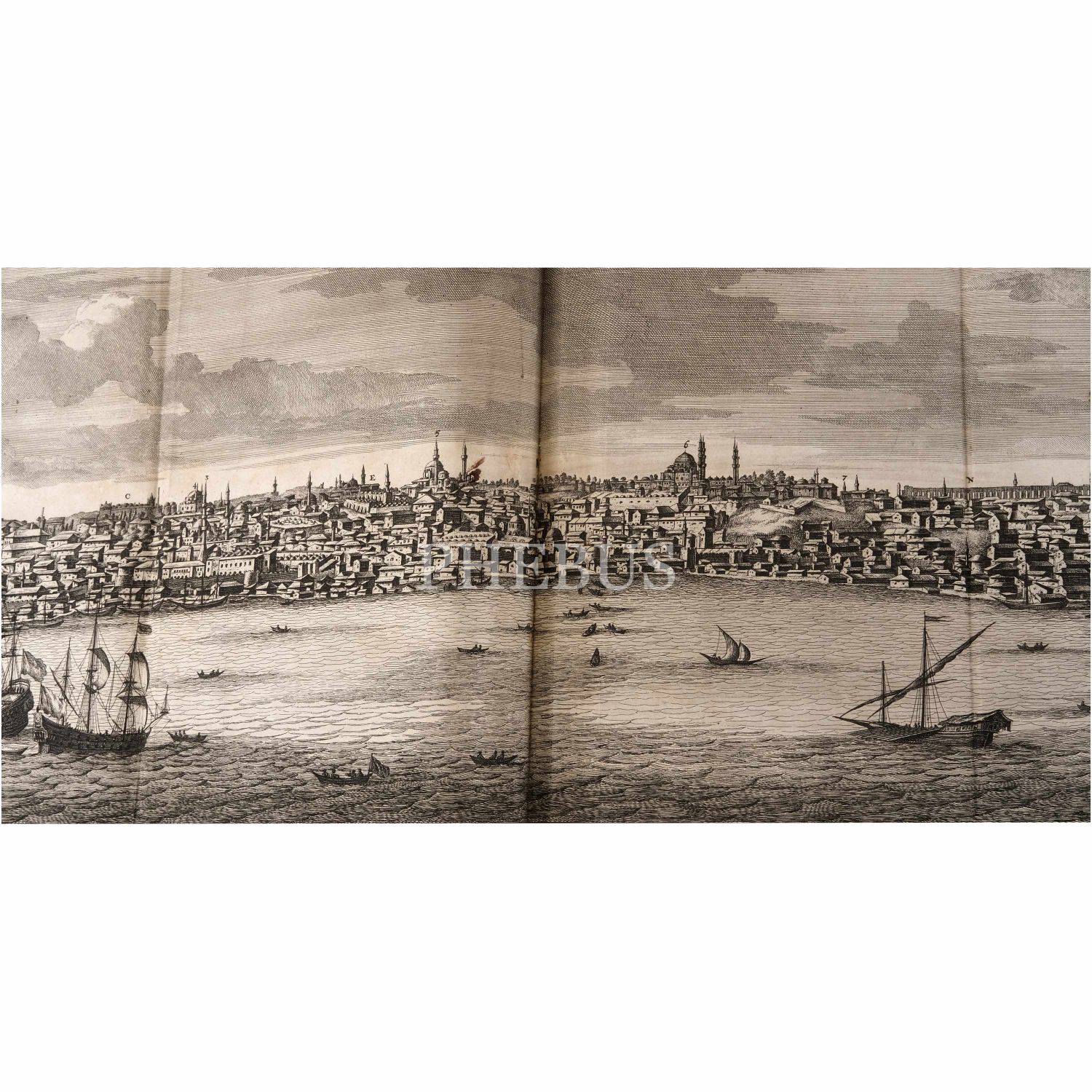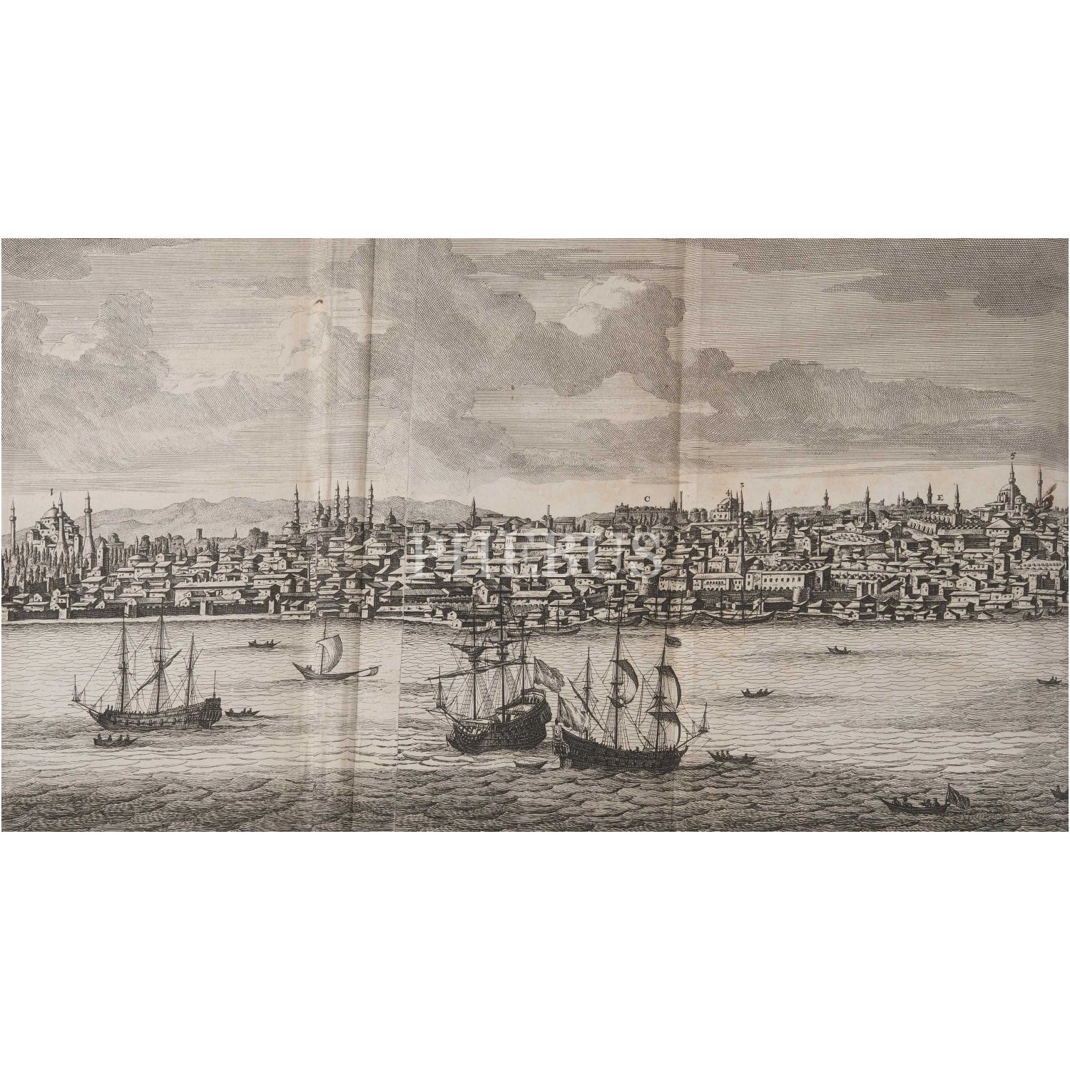 Cornelis de Bruyn´un, 17. yüzyıl Osmanlı topraklarında sosyal, siyasal ve askeri yaşama dair halen en muteber kaynaklardan birini teşkil eden, harikulade gravürler ve planşlar içeren meşhur seyahatnamesinin nadir ilk baskısı... Kitap içinde 57 tam sayfa gravür, 16 yarım sayfa gravür, 26 çift tam sayfa gravür, 18 katlanır gravür, 1 katlanır harita yer almaktadır. Sırtı panelli ve altın yaldız dekorlu, tümüyle deri dönem cildinde. Sayfa kenarları ebruludur. Yazarın Moskova, İran ve Hindistan seyahatlerini kapsayan ikinci kitabıyla birlikte...