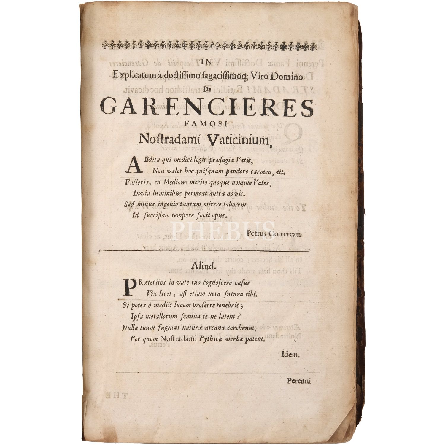 Fransız hekim, eczacı, kâhin ve astrolog Nostradamus´un, ilk kez 1555’te yayımlanan ünlü Les Propheties (Kehanetler) eserinin 1672 tarihli ilk İngilizce baskısı... Fransız asıllı eczacı ve bilgin Theophilus de Garencieres, kitabı çevirmekle kalmamış; Nostradamus´un şifreli ve sembolik dilini çözümlemeye çalışmış, kehanetlerine yorumlar getirmiştir. Sırtı panelli, tümüyle deri dönem cildinde. Ön iç kapağında iki adet ex-libris yer almaktadır. *Başlık sayfasındaki gravür ve kitabın son yaprağı (s. 521-522) fotokopidir. Cildinde zamana bağlı yıpranmalar meydana gelmiştir.