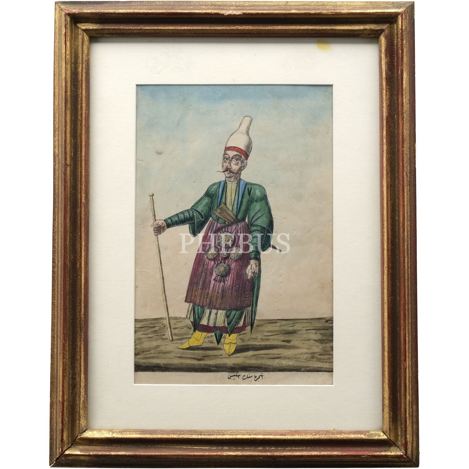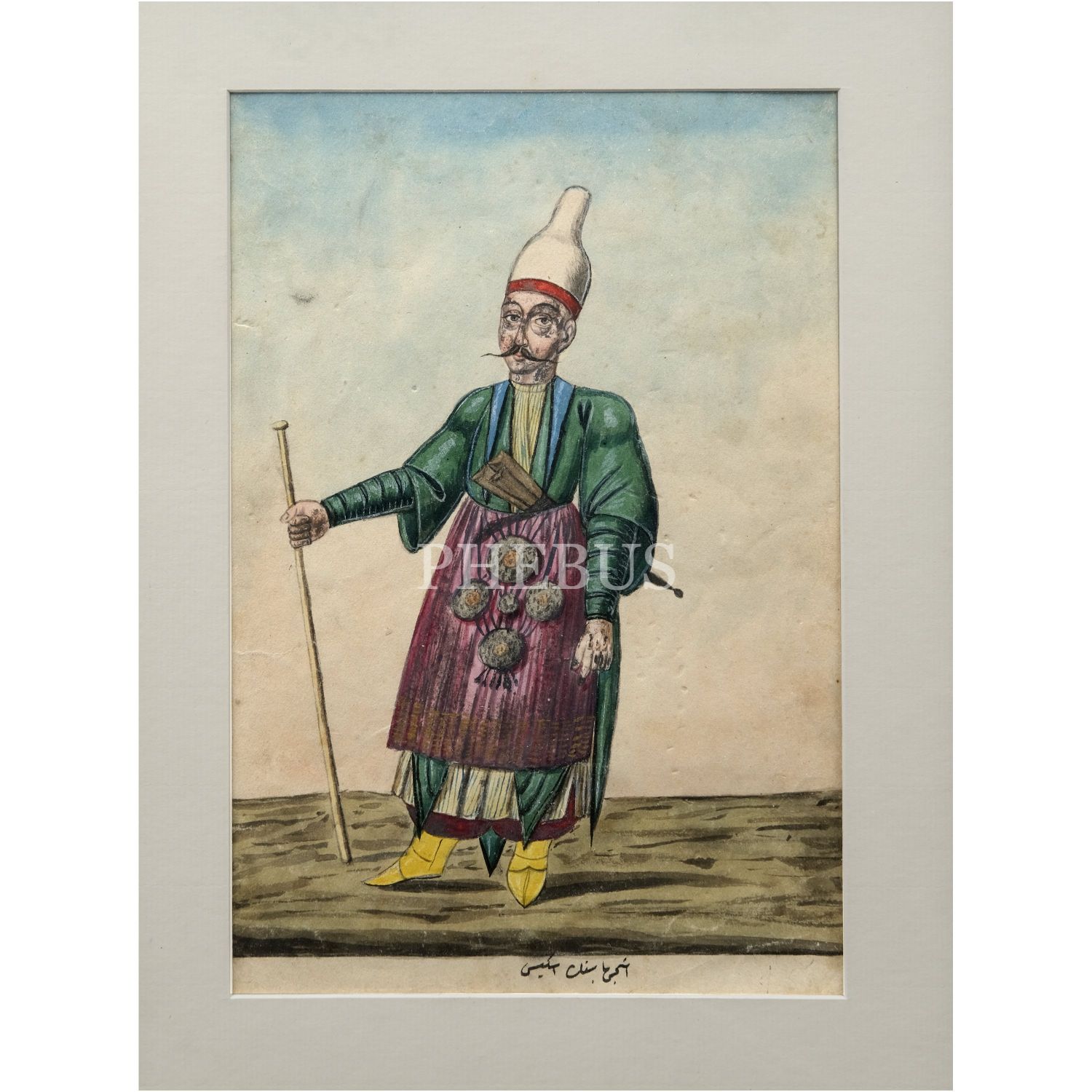 Sultan II. Mahmud devrinin askeri ve sivil devlet erkanını ayrıntılı bir şekilde resmetmesiyle tanınan Fenerci Mehmed´in, Osmanlıca "Aşçıbaşının Sakisi" başlıklı, elle renklendirilmiş orijinal çizim gravürü, gravür 17x23 cm, çerçeve 30x38 cm...