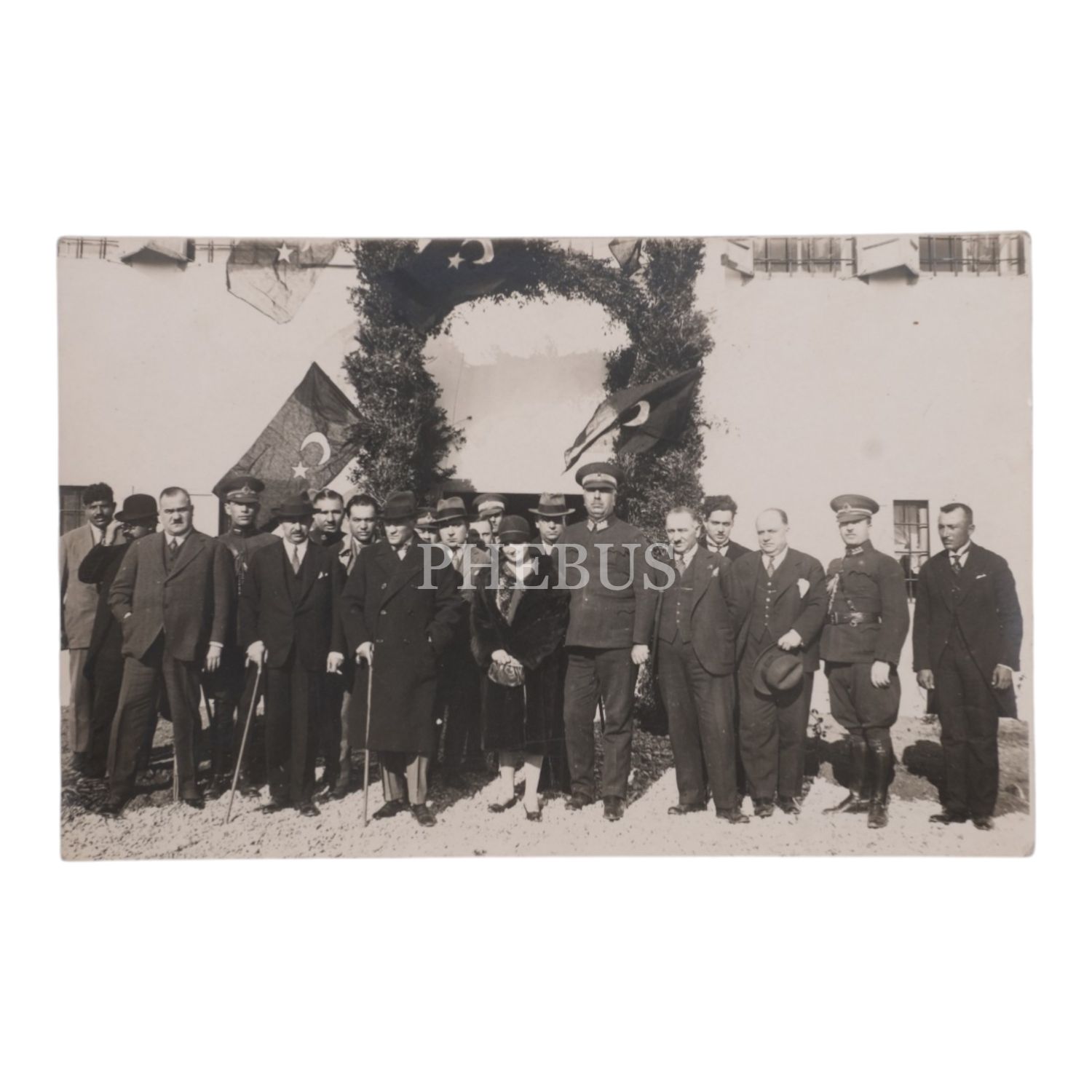 Mustafa Kemal Atatürk, Mareşal Fevzi Çakmak, Şükrü Kaya ve Kılıç Ali´nin, bir bayram kutlamasında bayraklarla süslenmiş tak önünde çektirdikleri hatıra fotoğrafı, 14x9 cm...