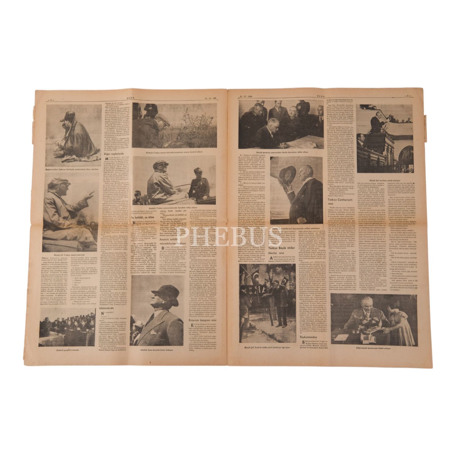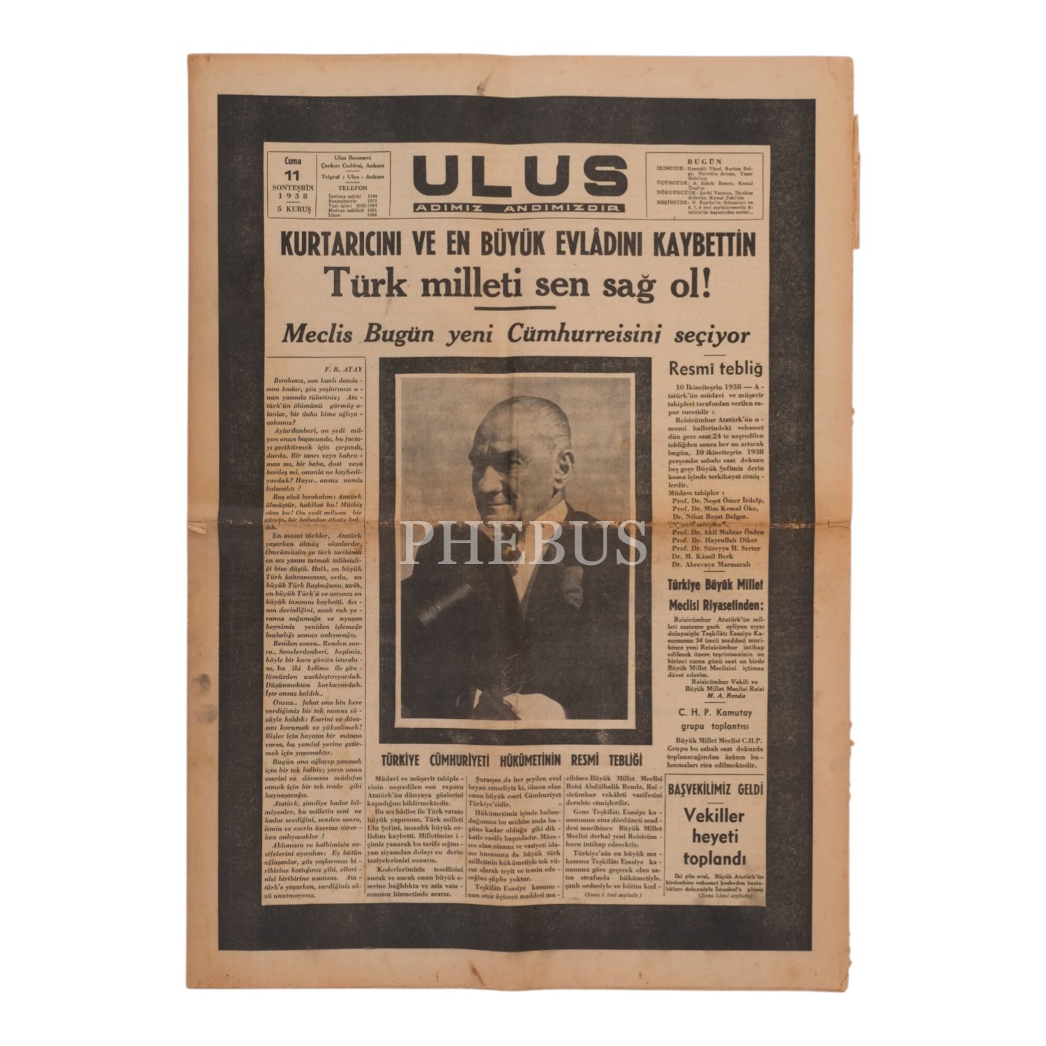 "Kurtarıcını ve En Büyük Evlâdını Kaybettin Türk Milleti Sen Sağ Ol!" manşetiyle, Mustafa Kemal Atatürk´ün vefat haberini duyuran ULUS gazetesi, 11 Sonteşrin (Kasım) 1938, 12 sayfa, 42x60 cm...