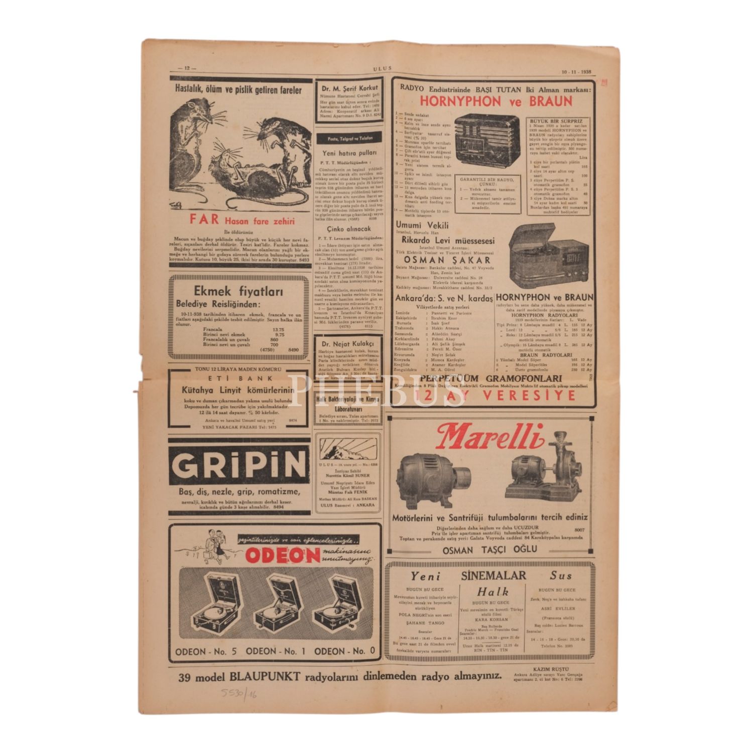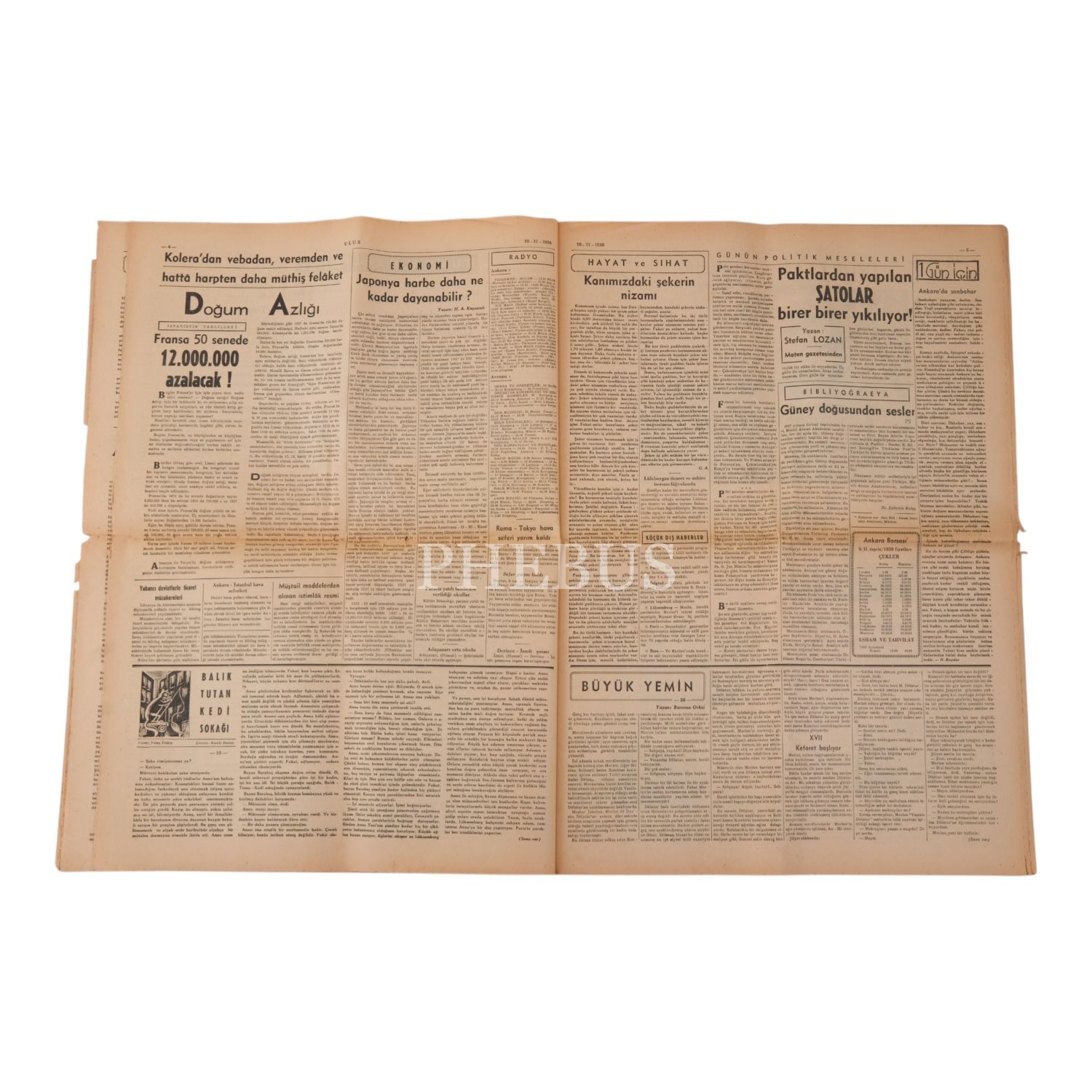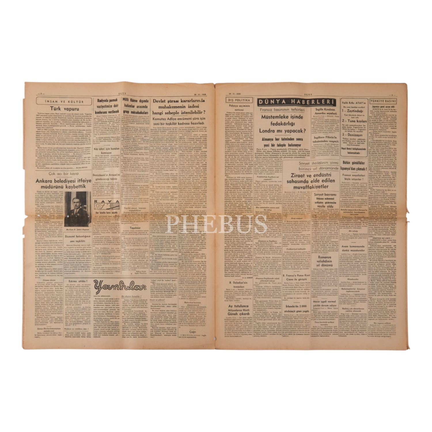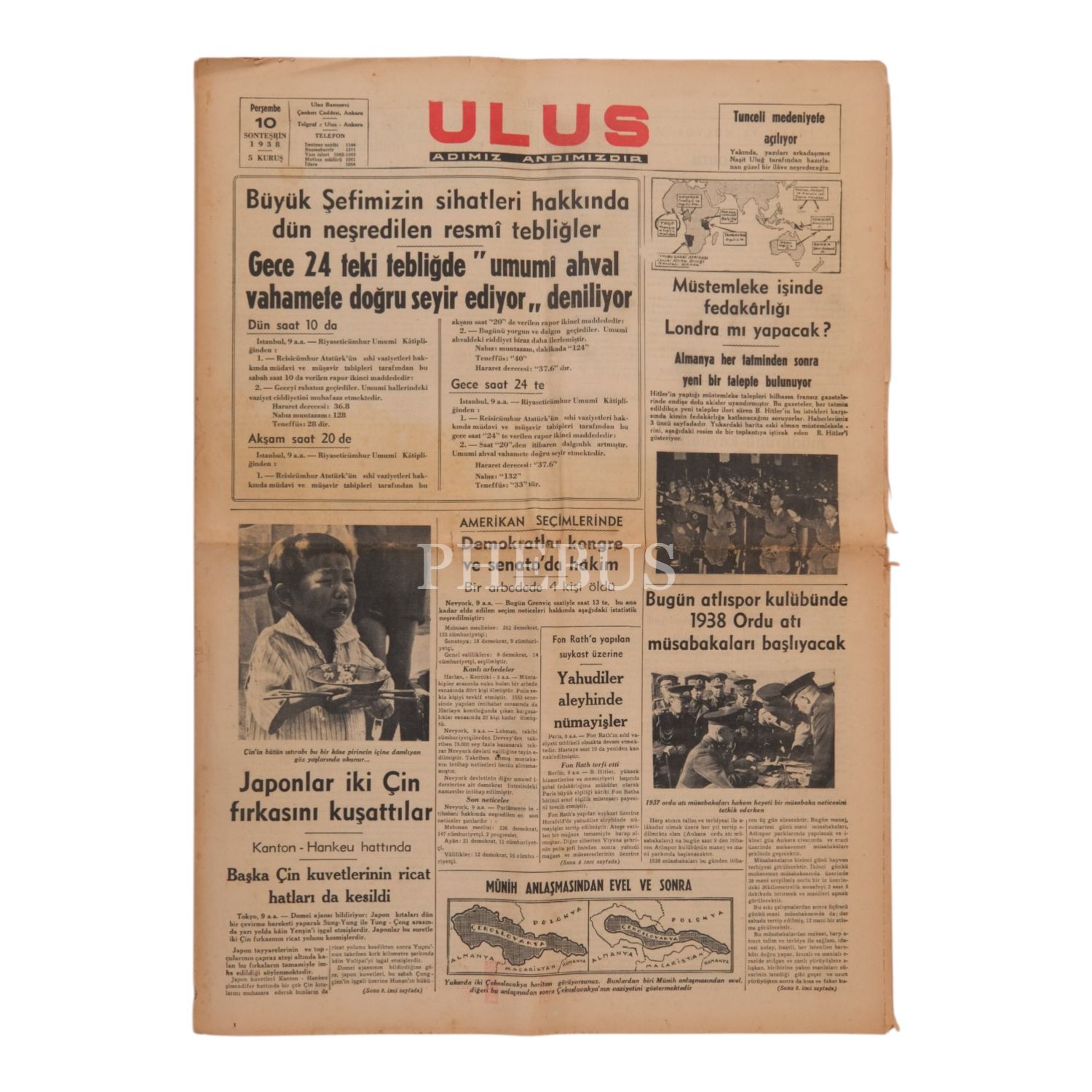 "Büyük Şefimizin sihatleri hakkında dün neşredilen resmi tebliğler: Gece 24´teki tebliğde umumi ahval vahamete doğru seyir ediyor deniliyor" manşetiyle, Atatürk´ün, vefat ettiği günün önceki gecesinden sağlık durumu hakkındaki haberlere yer verilen ULUS gazetesinin 10 Kasım 1938 tarihli nüshası, 44x60 cm...