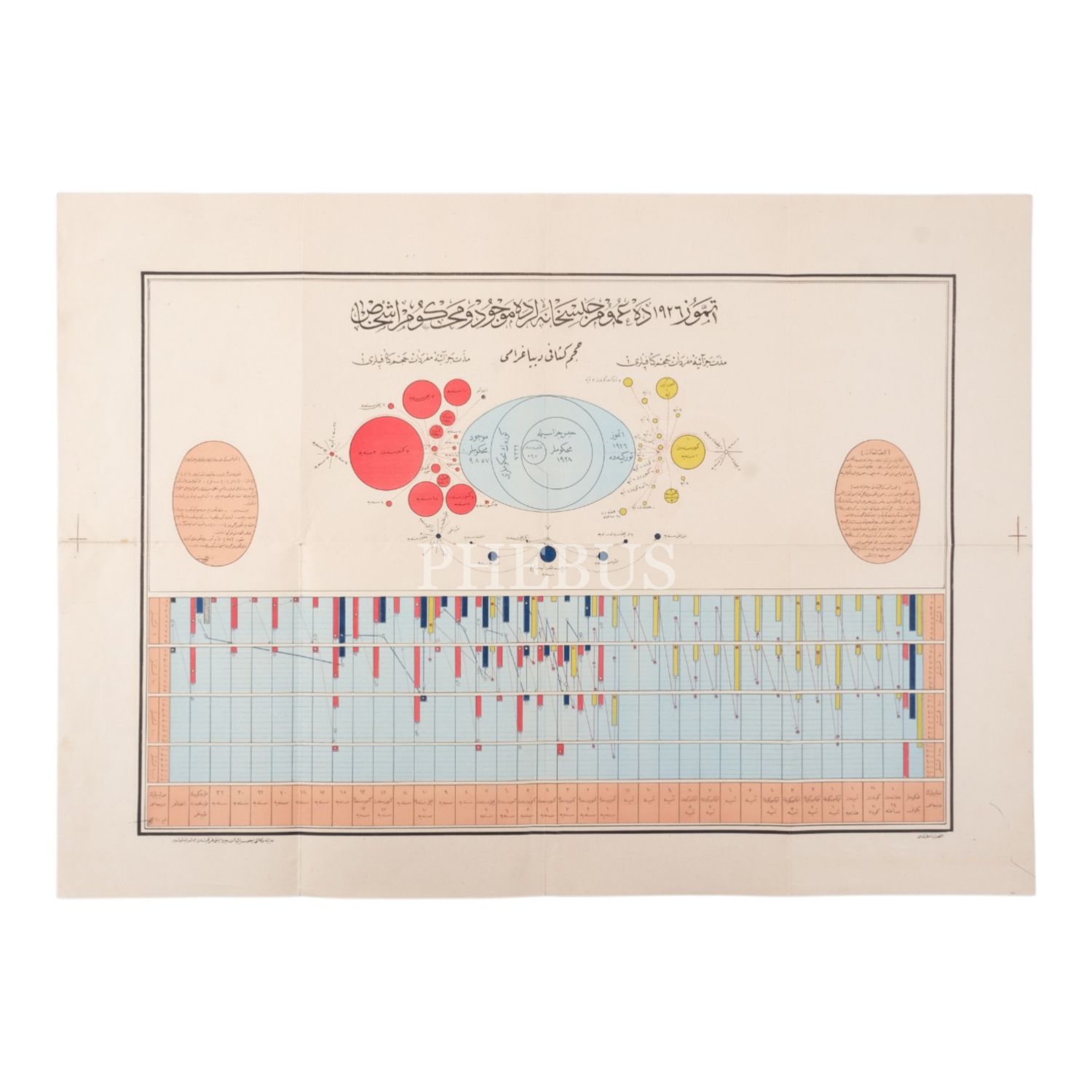 Adliye Vekaleti tarafından neşredilen, 1 Temmuz 1926 senesinde hapishanelerde bulunan mahpuslar ve kürek mahkumlarının gösterildiği grafiğin yer aldığı "1 Temmuz 1926 Umum Hapishanelerde Mevcut ve Mahkum Eşhas" başlıklı afiş, 57x41 cm...