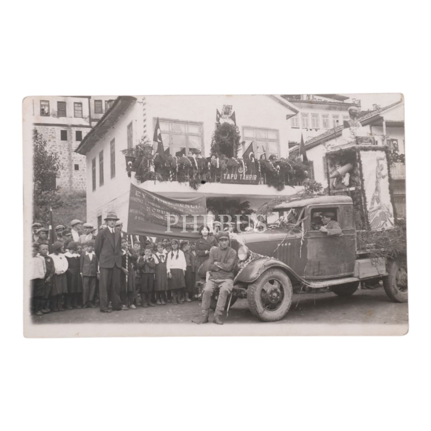 Artvin "Tapu Tahrir" binası önünde Atatürk´ün Gençliğe Hitabesi´nin ilk ve son cümlelerinin yazılı olduğu pankartı tutan öğrencilerle; savaş temsilleriyle ve Atatürk büstüyle donatılmış bir kamyonetin görüldüğü millî bayram enstantanesi, 14x9 cm...