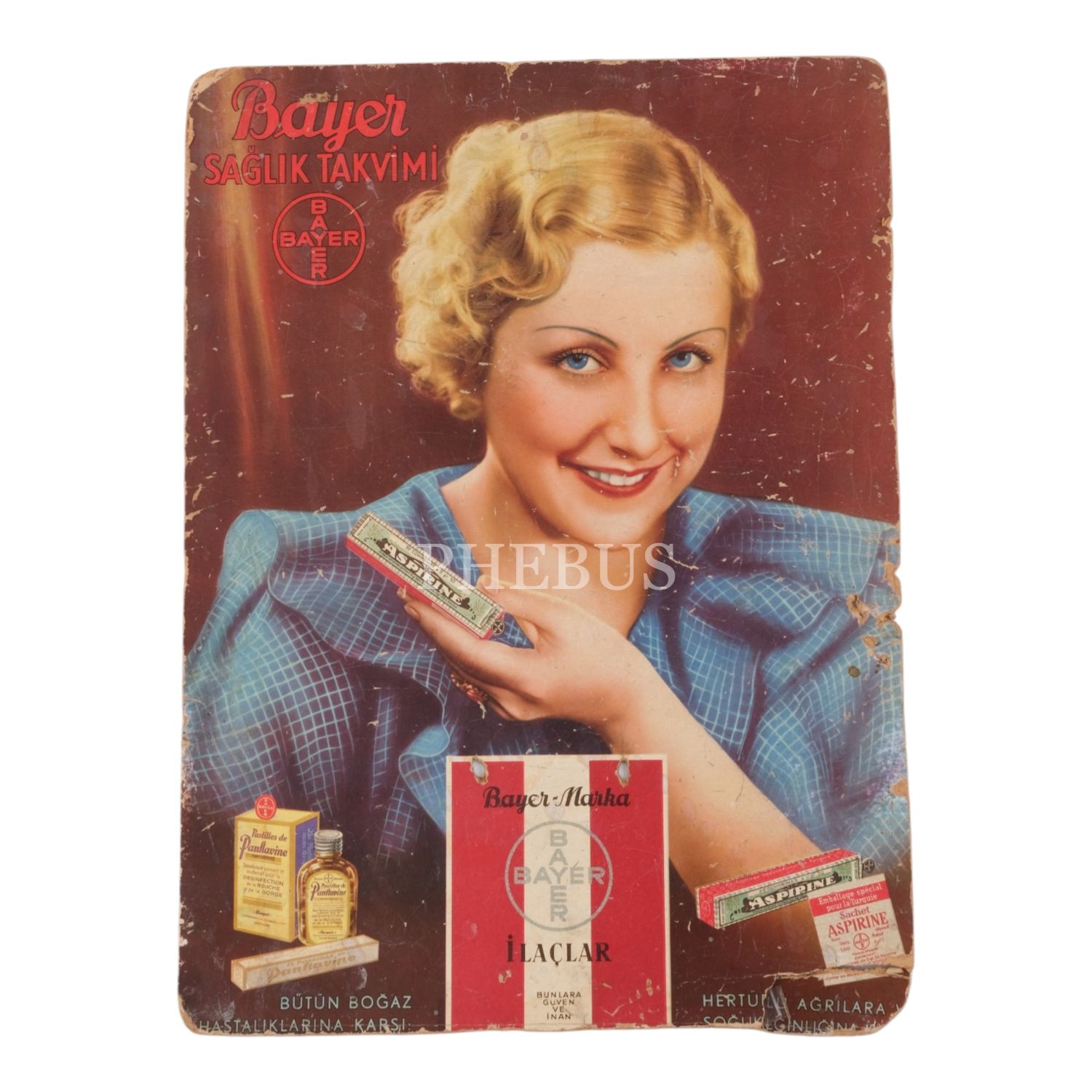 Bayer Sağlık Takvimi; elinde "Aspirine" kutusu tutan güzel bir kadın görselli, "Panflavin" (Bütün Boğaz Hastalıklarına Karşı) ve "Aspirine" (Her Türlü Ağrılara, Soğuk Algınlığına..." reklamlı, 1930´lu yıllar, 27,36,5 cm...