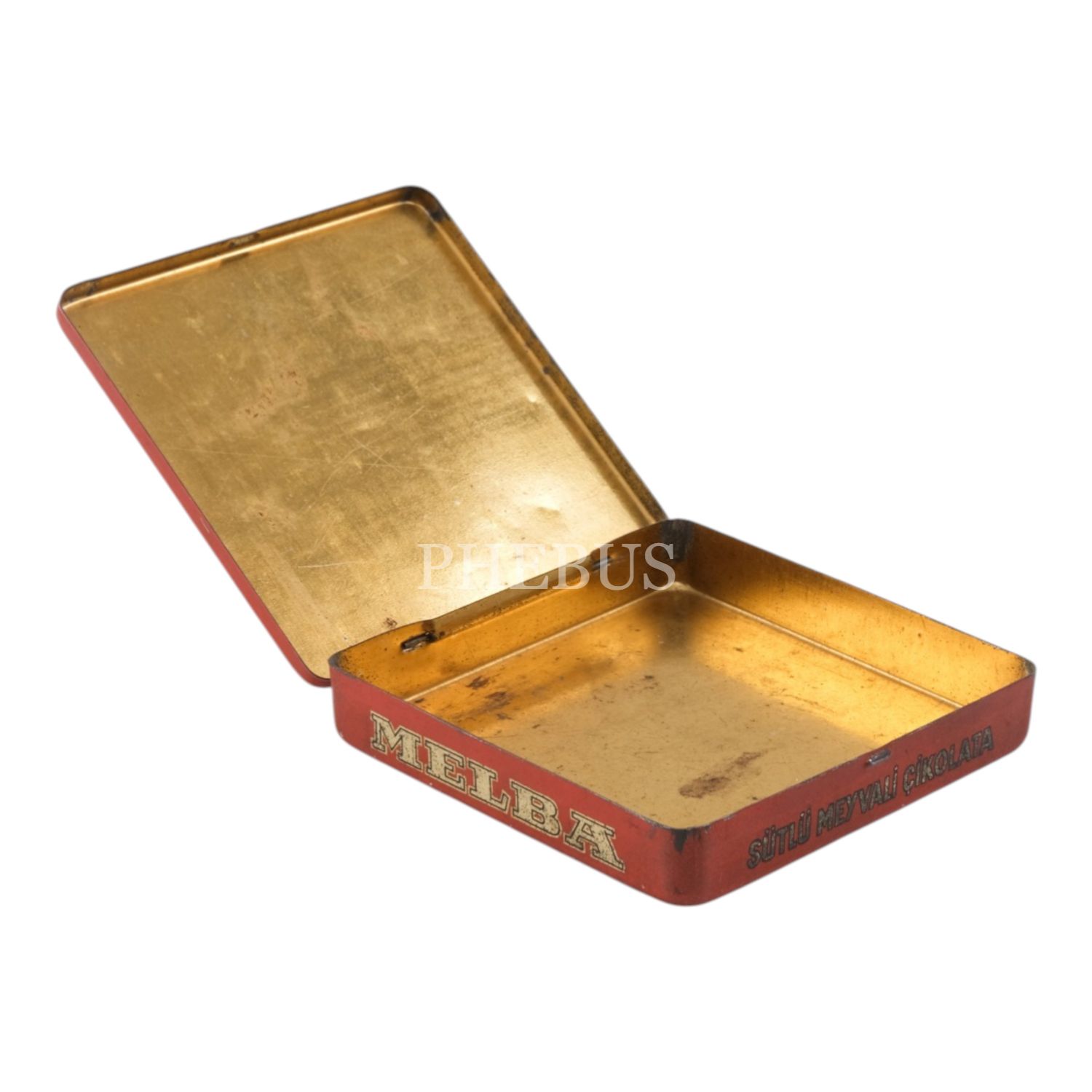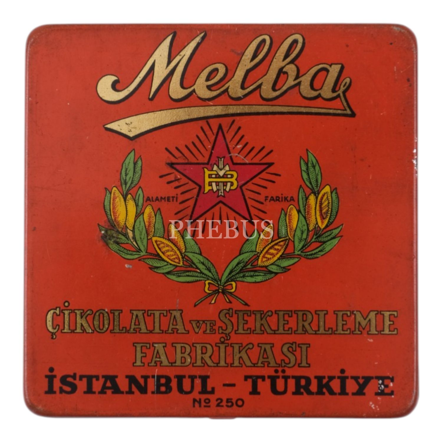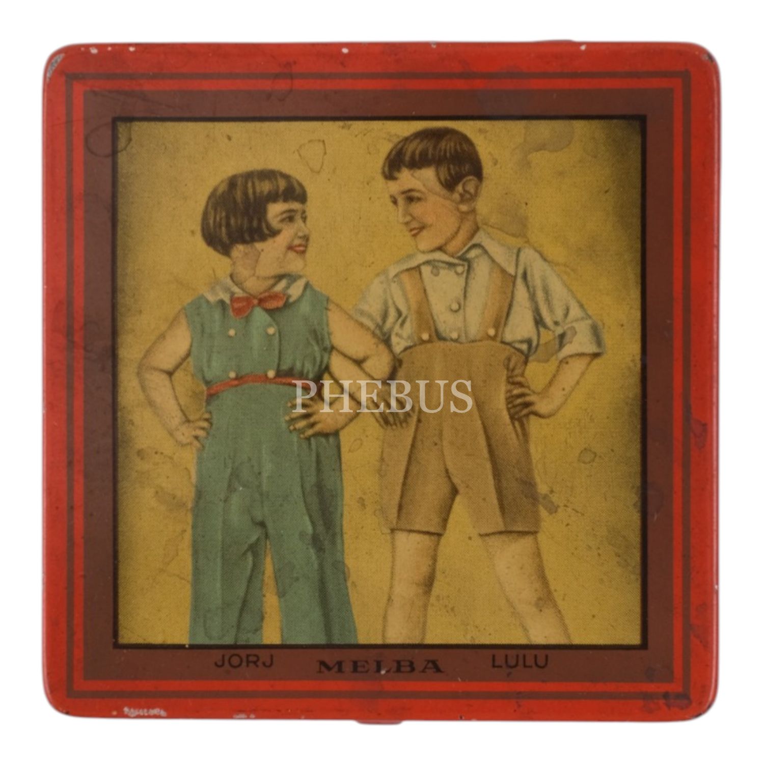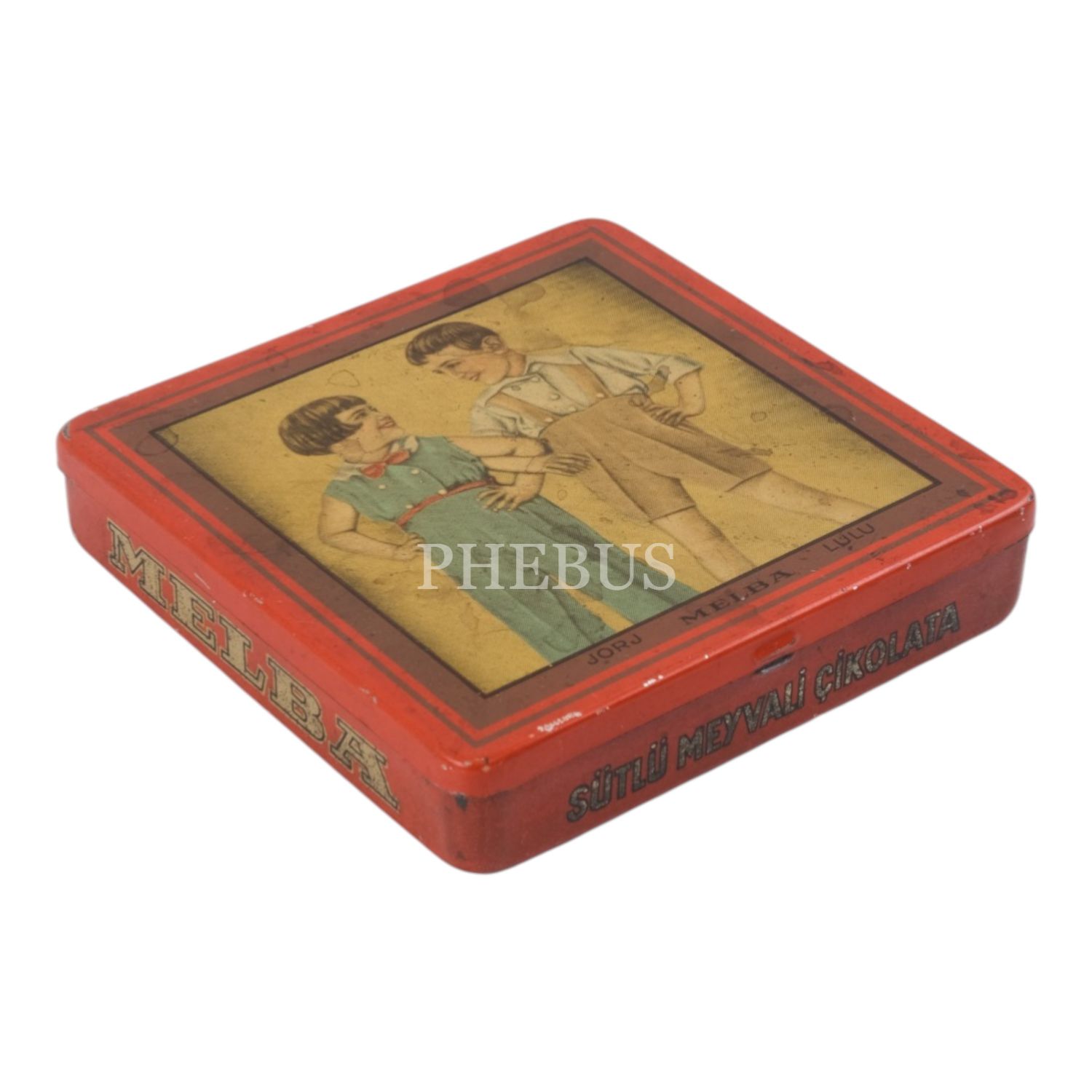 Melba Çikolata ve Şekerleme Fabrikası´nın, arka yüzü kız ve erkek çocuk resimli teneke kutusu, No. 250, 9,5x9,5 cm...
