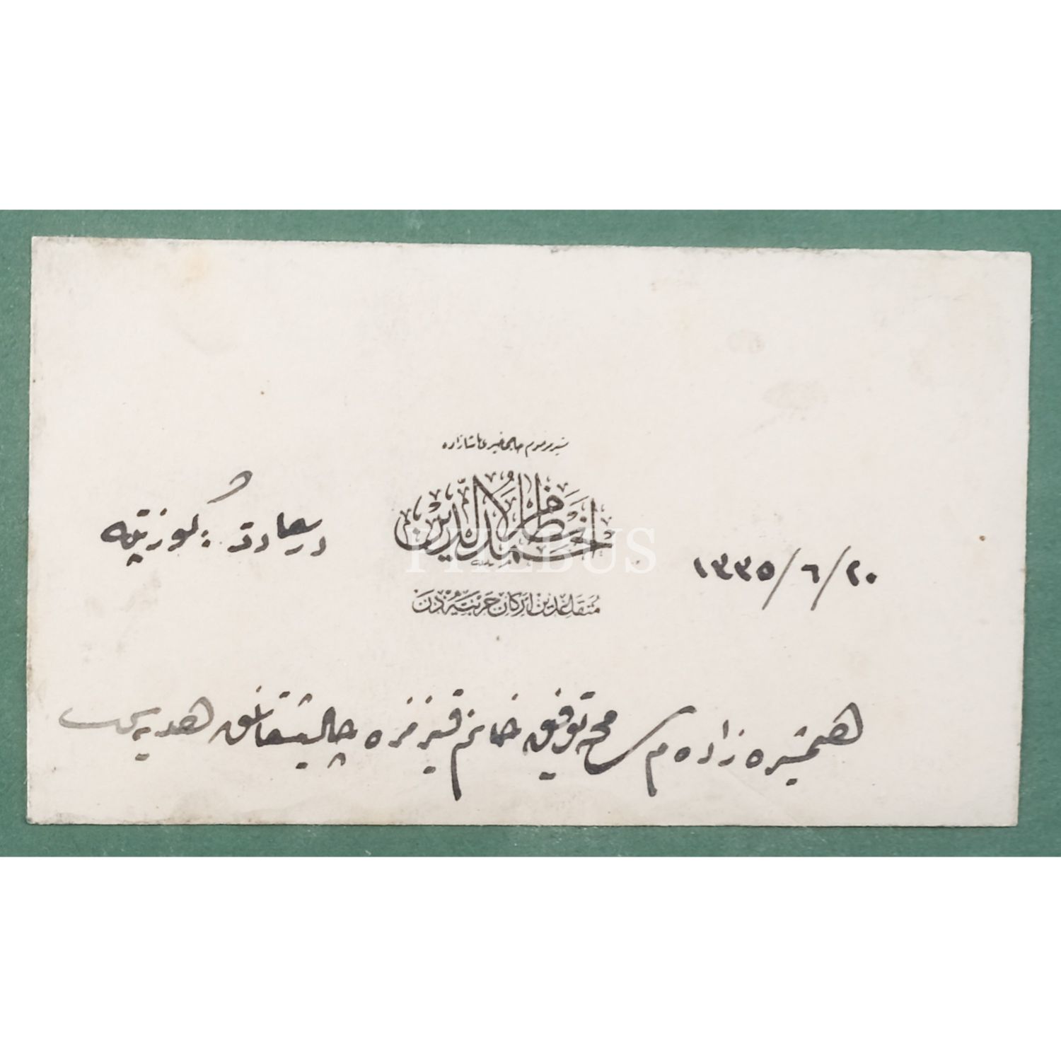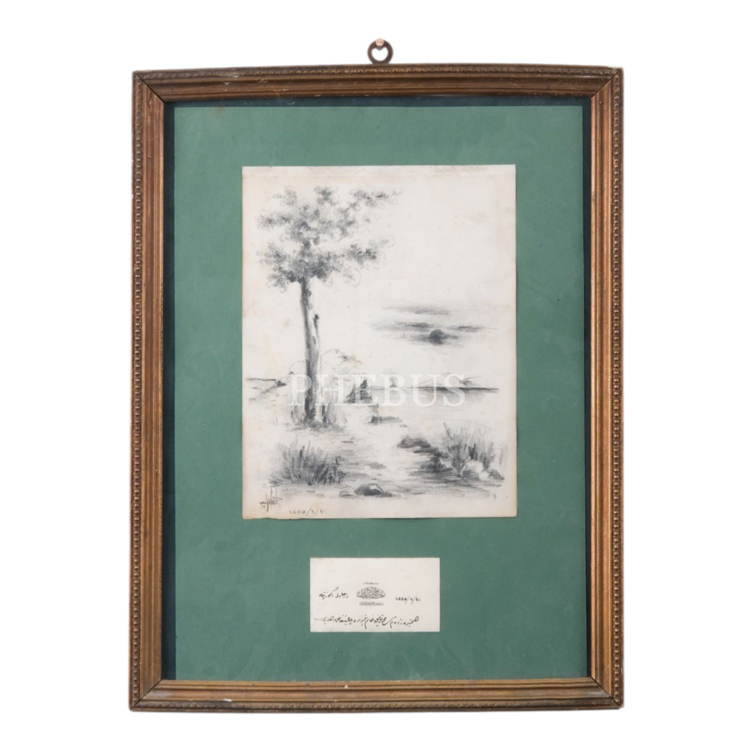 Asker ressamlar kuşağından Ahmet Nizamettin Efendi´den imzalı, kağıt üzerine karakalem peyzaj çizimi ve Ahmet Nizamettin Efendi´nin ithaflı kartviziti, 20x26 cm...