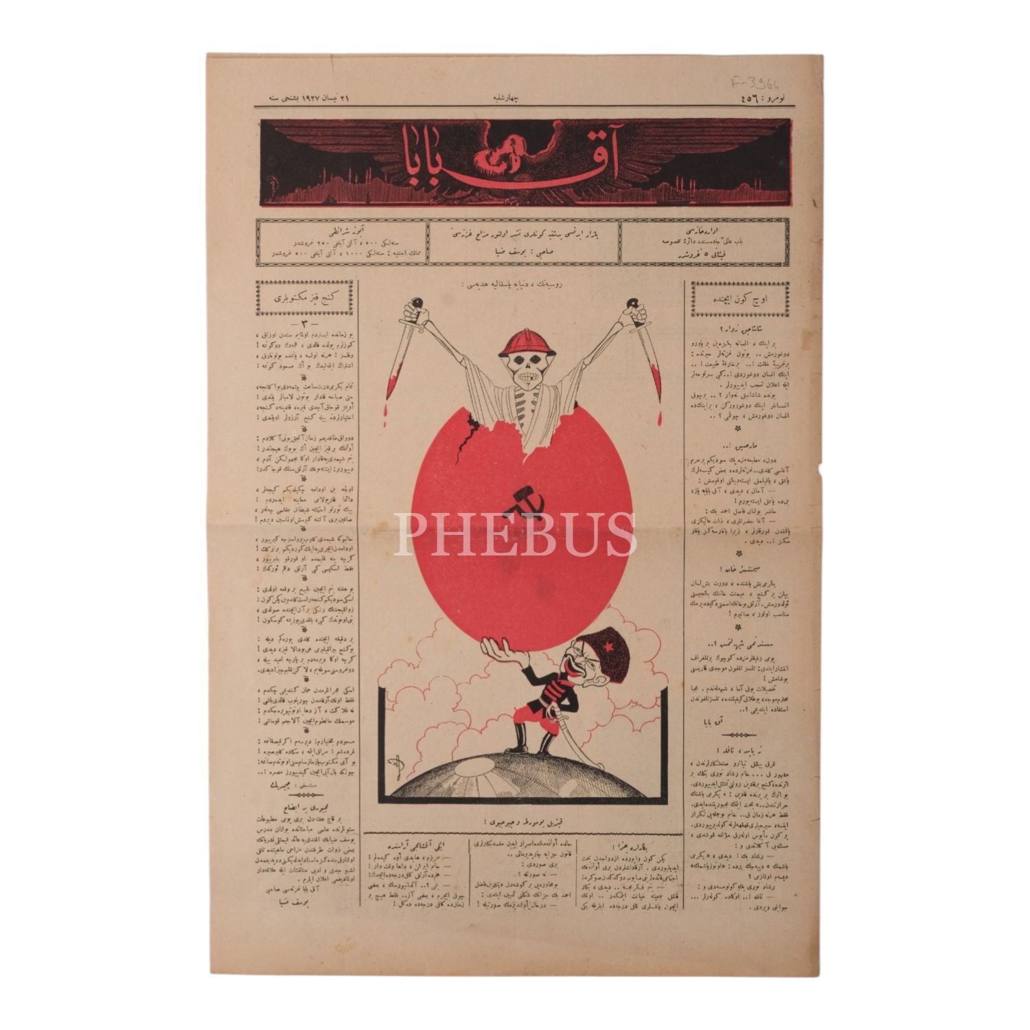 Lenin´in elinde tuttuğu "Orak-Çekiç" görselli kızıl bir yumurtanın içinden çıkan eli bıçaklı bir iskeletin resmedildiği 21 Nisan 1927 tarihli AKBABA dergisi, 34x50 cm...
