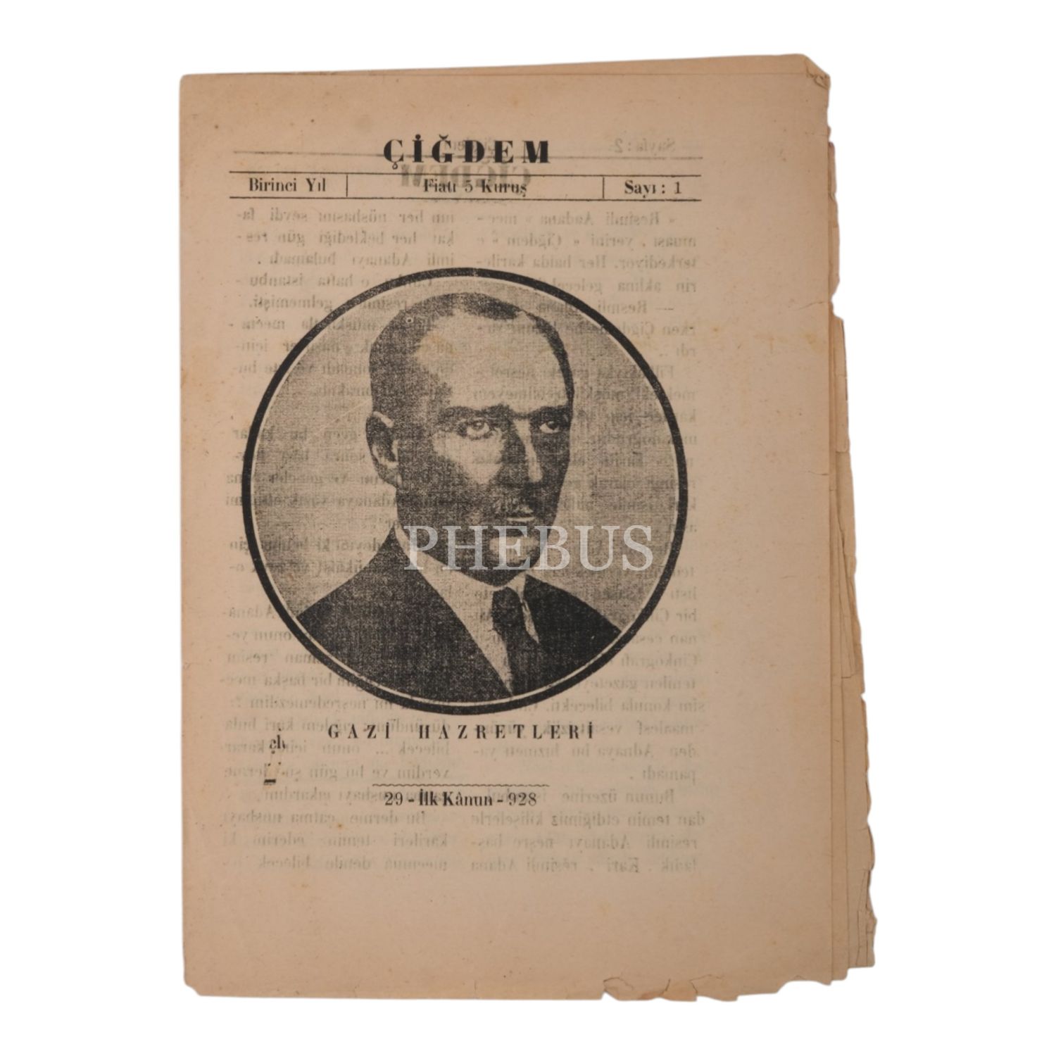 ÇİĞDEM dergisinin, Mustafa Kemal Atatürk´ü "Gazi Hazretleri" başlığıyla kapağına taşıdığı, 29 İlk Kânun 1928 tarihli 1. sayısı, 8 sayfa, 20x28 cm...