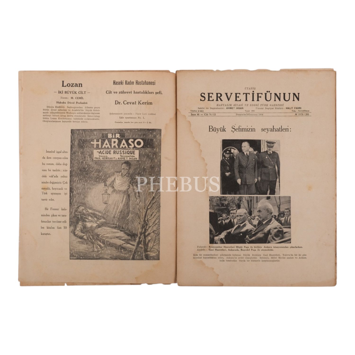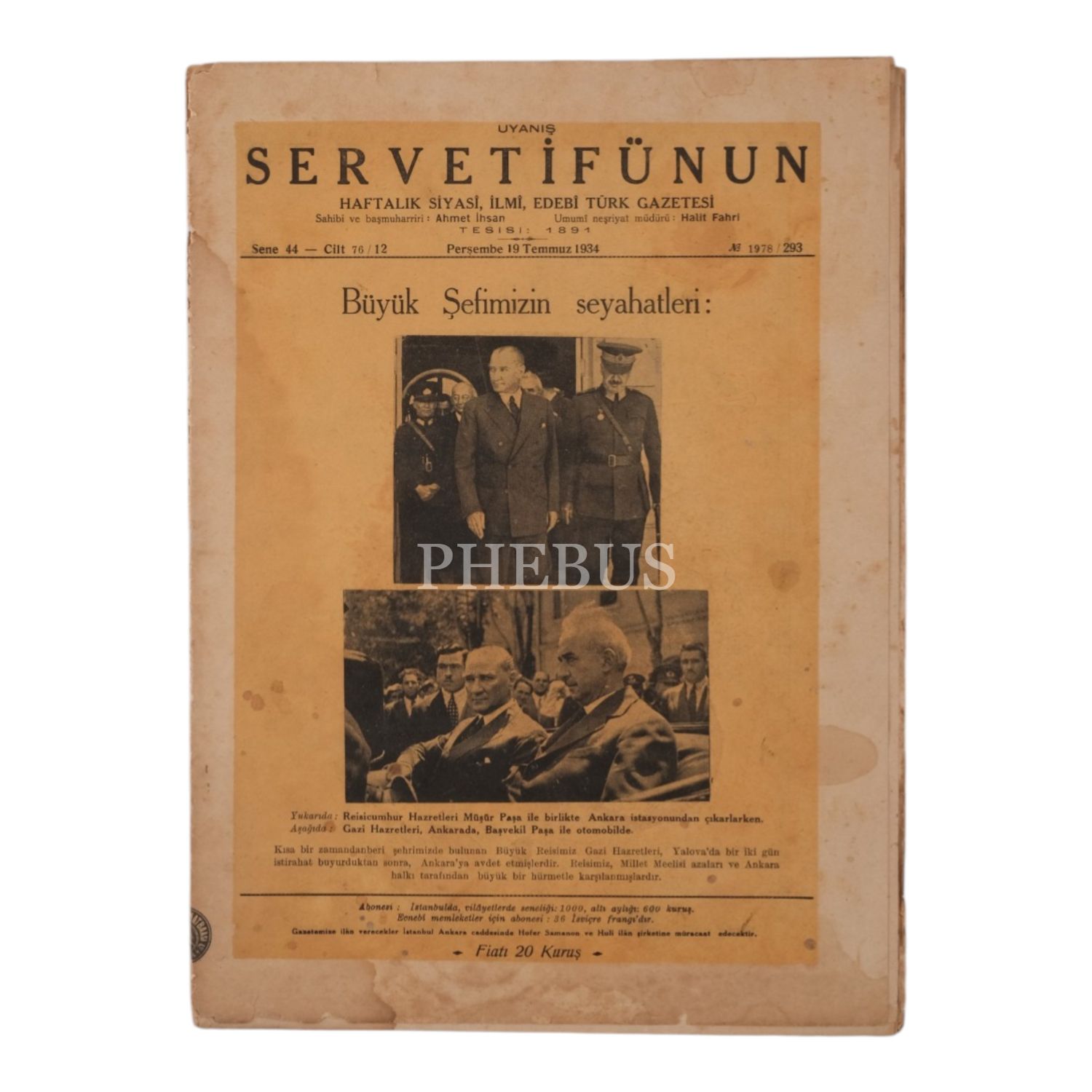 "Haftalık Siyasî, İlmî, Edebi Türk Gazetesi" -Uyanış- SERVETİFÜNUN´un, Mustafa Kemal Atatürk´ü Fevzi Çakmak ve İsmet İnönü ile birlikte kapağına taşıdığı, 19 Temmuz 1934 tarihli sayısı, 14 sayfa, 25x34 cm...