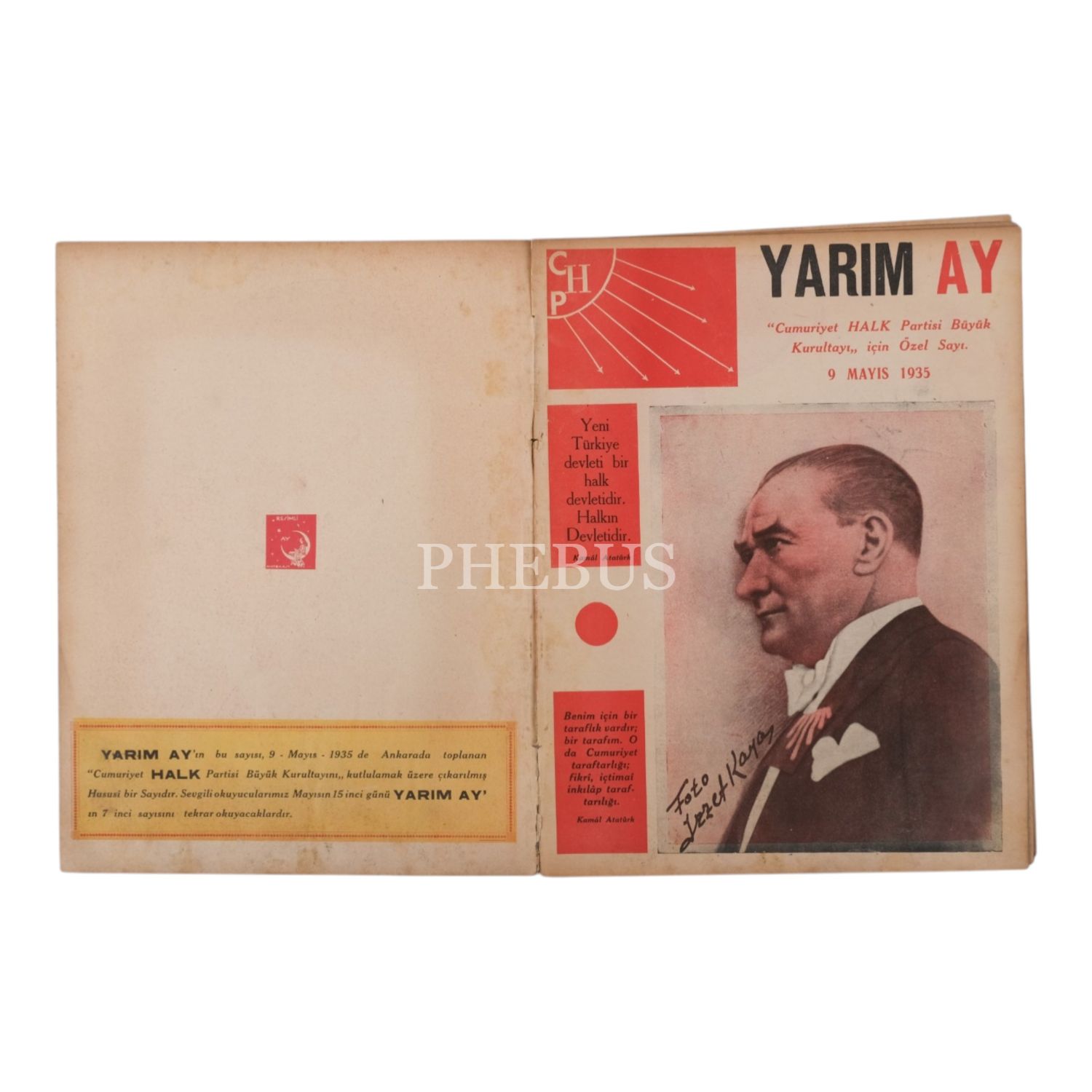 YARIM AY dergisinin, "Cumhuriyet Halk Partisi Büyük Kurultayı" için çıkardığı, 9 Mayıs 1935 tarihli özel sayısı, 15 sayfa, 24x31,5 cm...